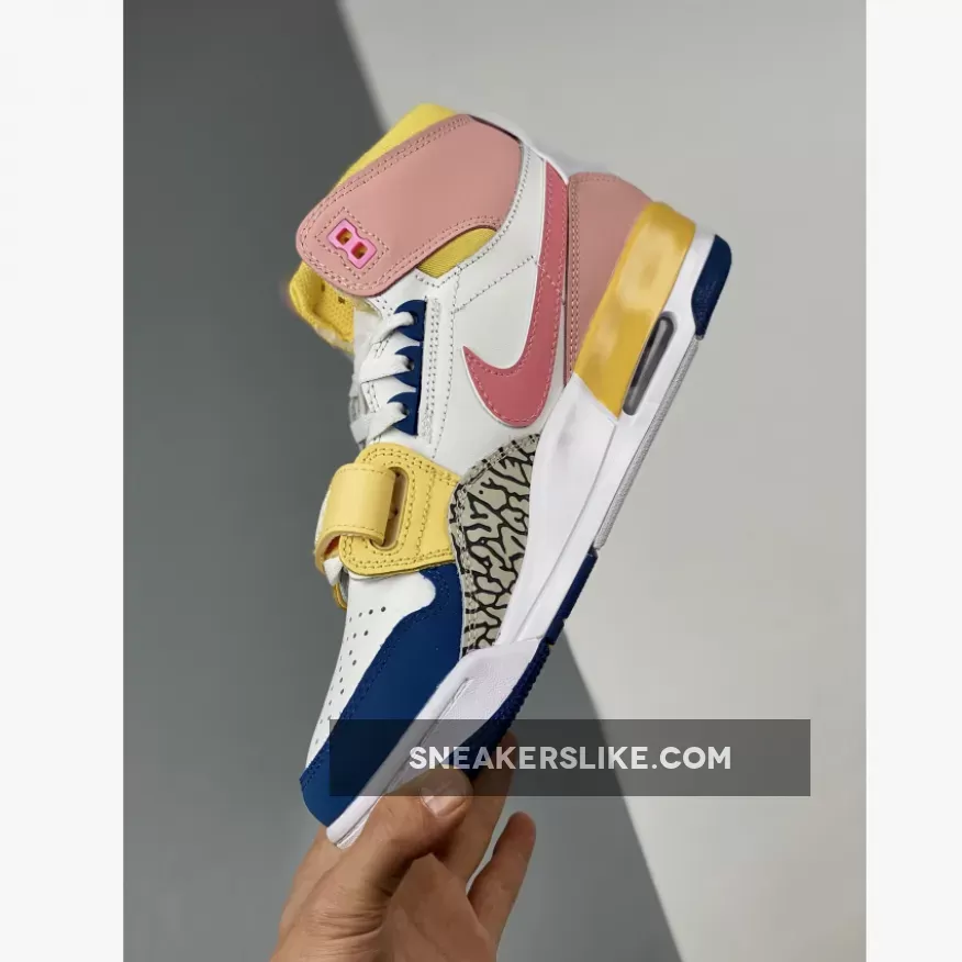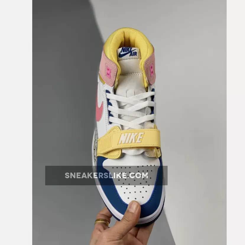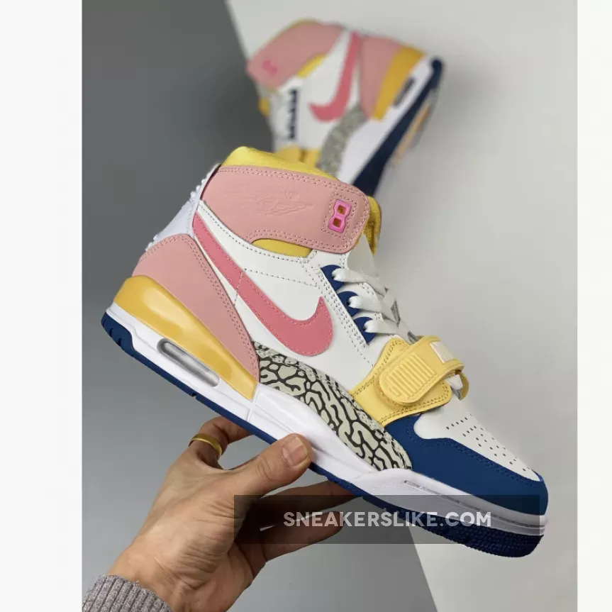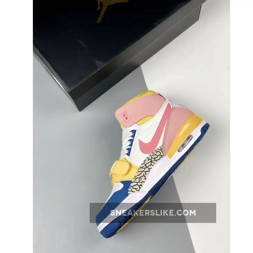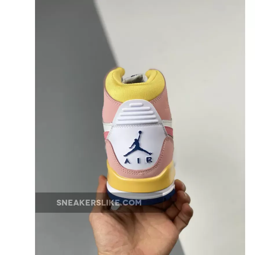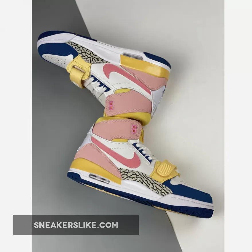 The Jordan Legacy 312 is a sneaker that seems better suited for Spring than Winter, with its various pastel hues. The design features bright pink suede accents on the ankle flaps and Swoosh, while blues add depth and interest on the toe cap and outsole. Light oranges also play a role in brightening the shoe, appearing on the strap, midsole, and collar. Overall, this combination of colors creates a vibrant and playful look for the shoe.