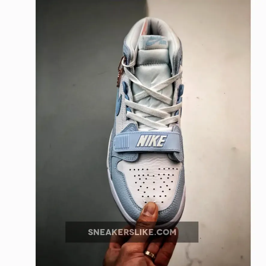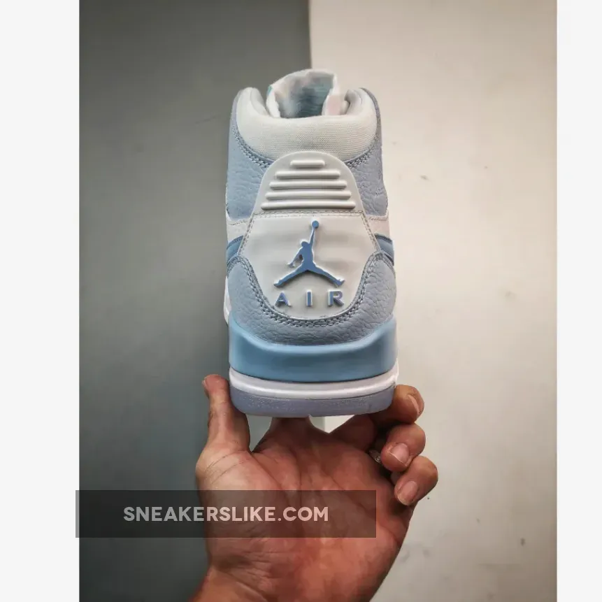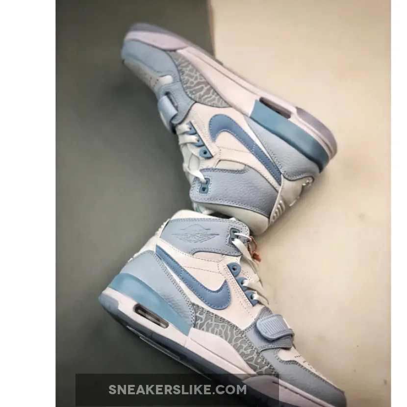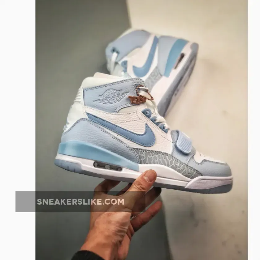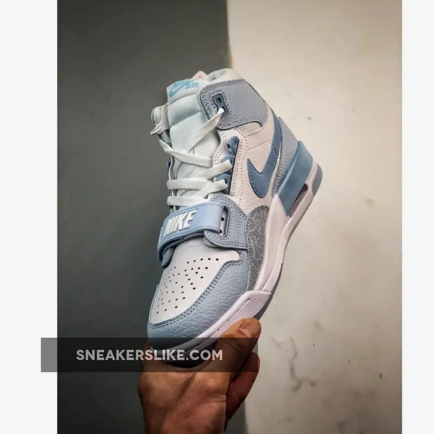 The Jordan Legacy 312 “Arctic Blue” sneakers stand out with their unique combination of materials and colors. The upper is crafted from quality leather, providing a durable and stylish base. Donning a “colorless” base and light blue contrast around the forefoot, along the tongue, and across the heel.