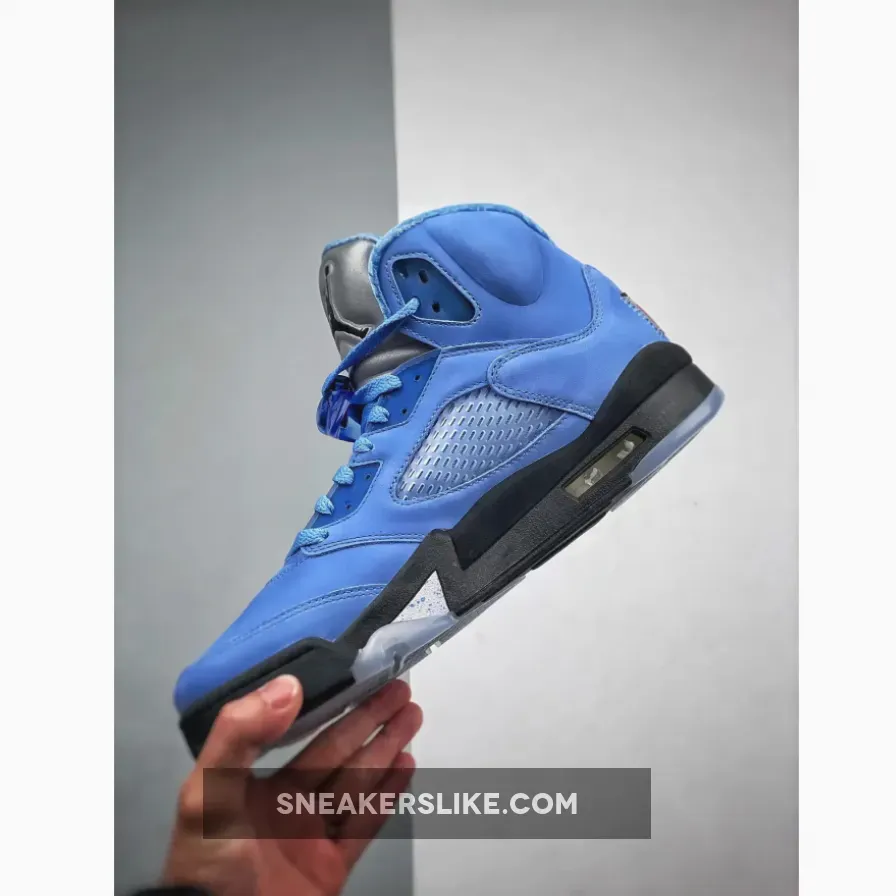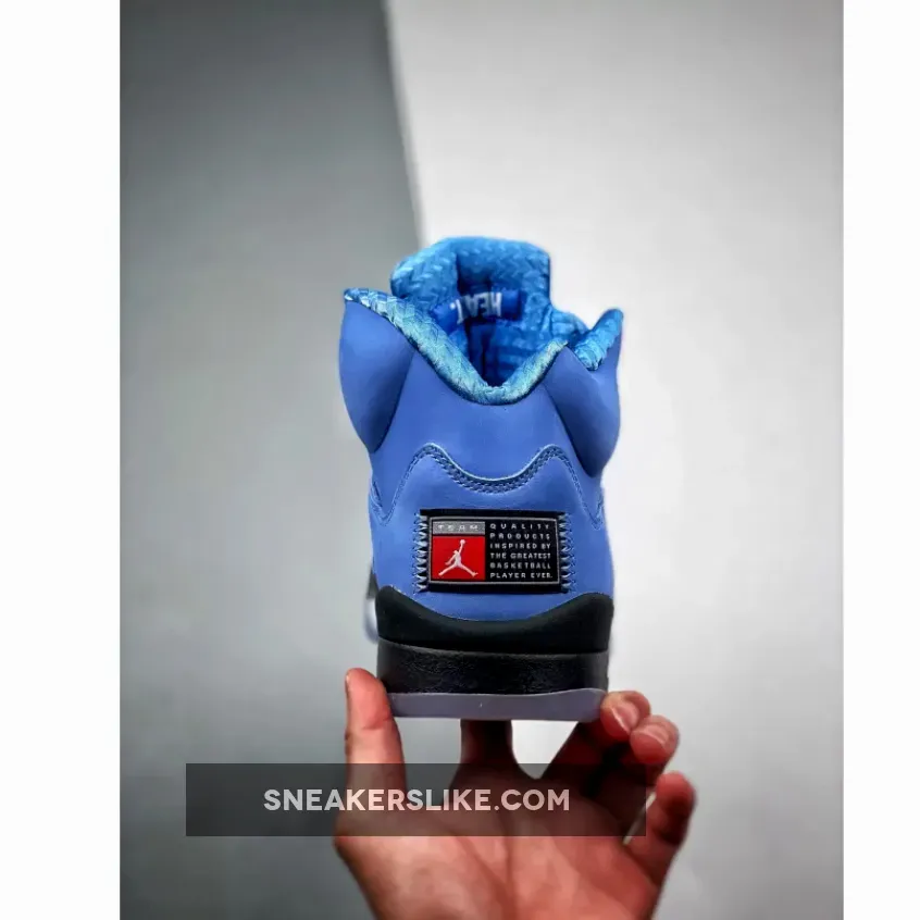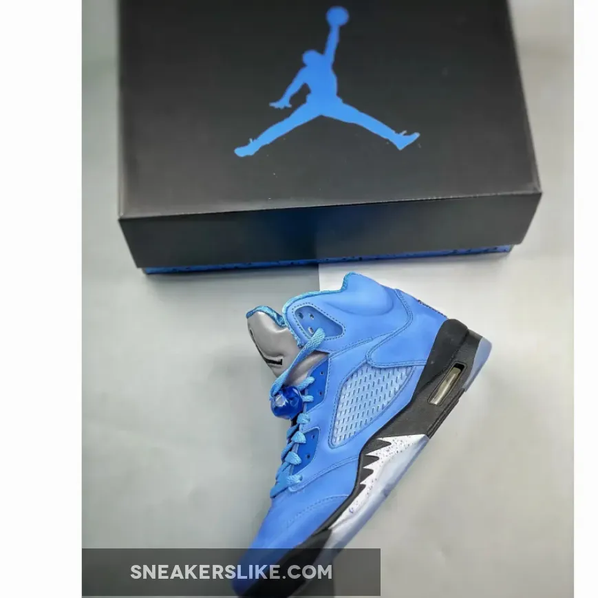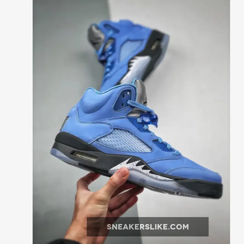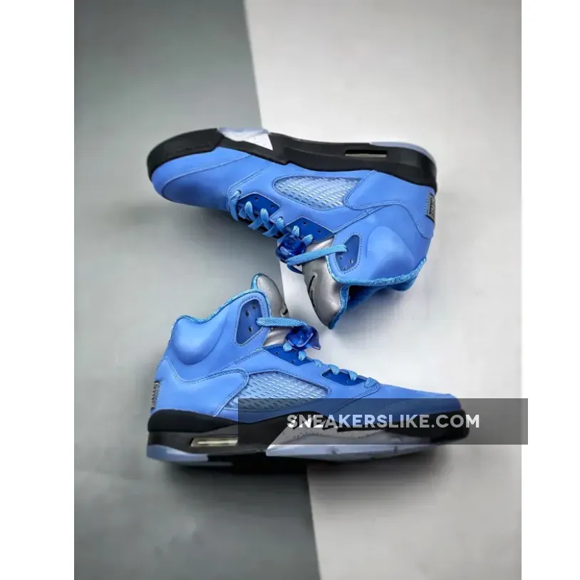 The Jordan 5 UNC comes in the Tar Heels signature University Blue across the uppers and is dressed with University Blue laces, and lace locks. A black midsole with white and University Blue detailing separates the translucent blue outsole from the suede uppers. The sneakers are topped off with a silver reflective 3M tongue with a black jumpman logo.