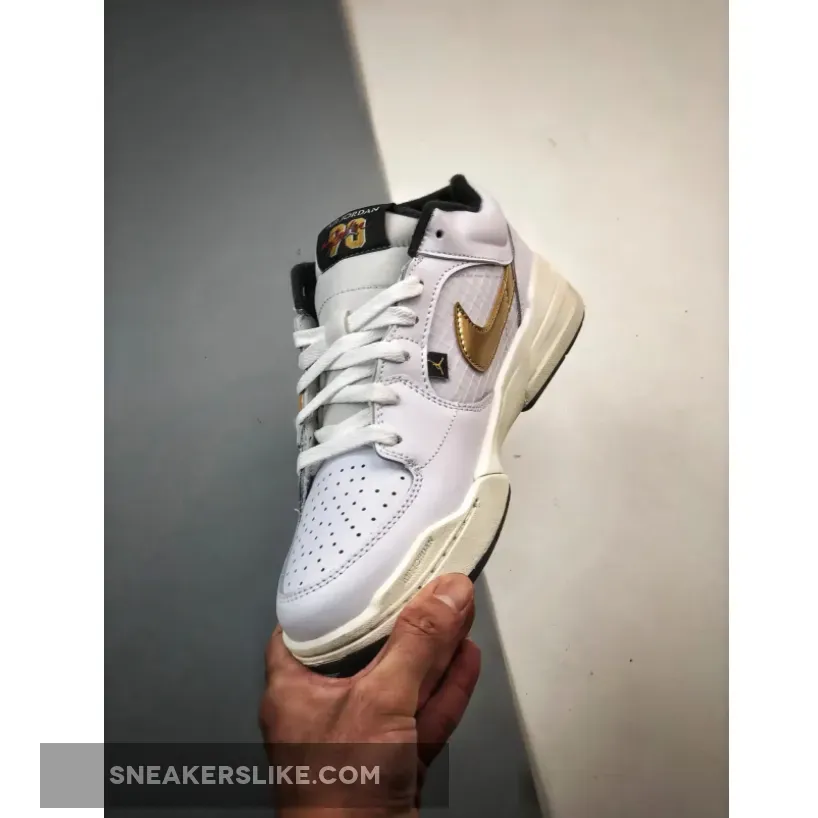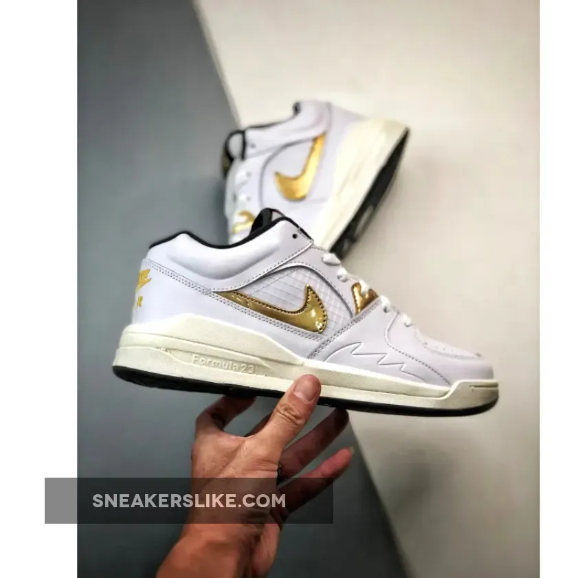 The sneaker’s white base, reminiscent of a blank canvas, signifies the start of Mike’s legendary journey. The metallic gold touches on the Swoosh overlays and forefoot eyestays subtly nod to the shimmering trophies and medals defining his career. The rear Nike Air embroidery also basks in this gold hue, symbolizing the prestige and glory Jordan brought to the Air brand. Continuing this, a retro-inspired tongue tag sits at the top, colored in a mix of black, white, red, and gold, it pays vibrant homage to the brand’s rich history while also encapsulating the triumphs of Jordan’s career.