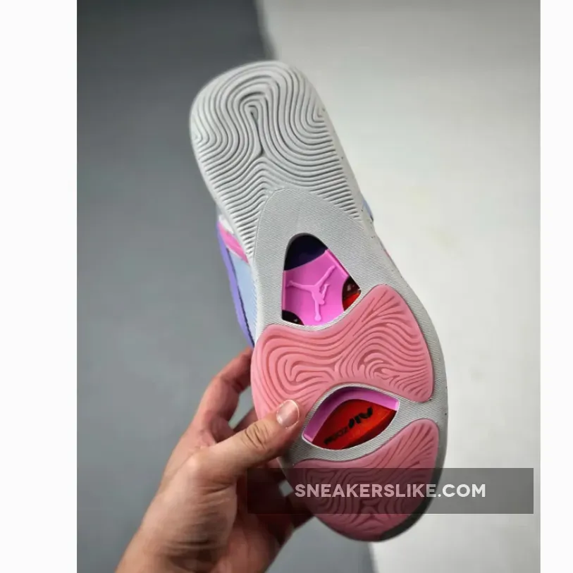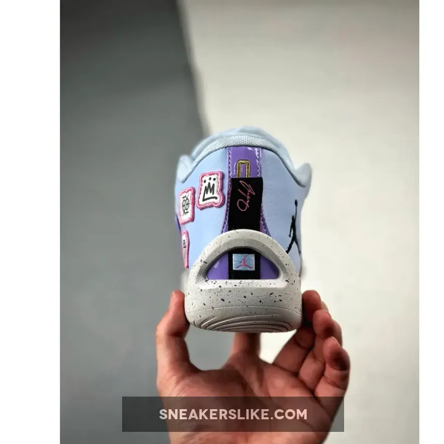 The majority of the upper is decorated with light purple, which is juxtaposed by darker hues on the TPU overlays on the toe and eyelets. On the tongue tag and around the medial heel, Dongdan emblems are deftly placed. The lateral heel as well as the heel tab continue to sport the standard Jordan branding. High-quality cushioning is provided by the foam midsole, which is strengthened with TPU reinforcements on the toe as well as the midfoot.