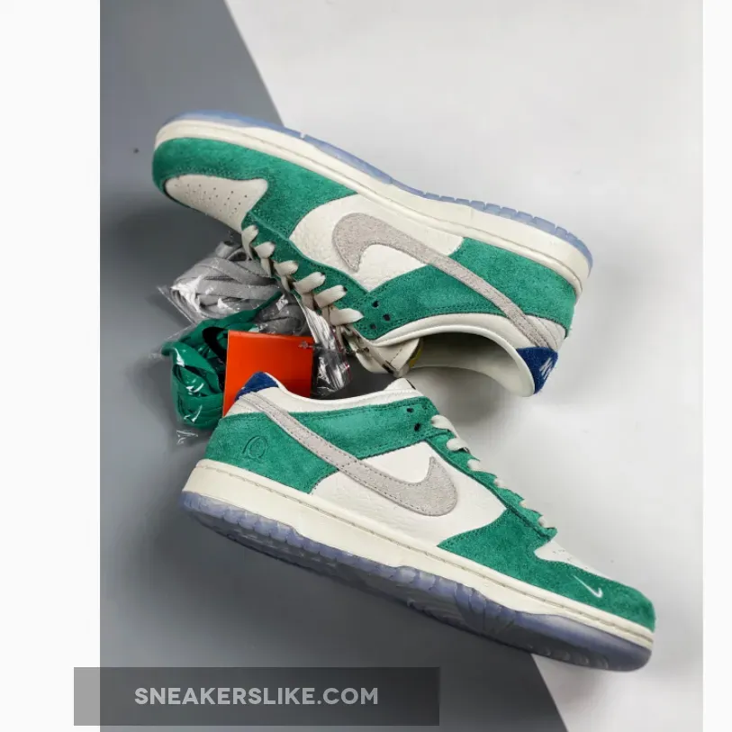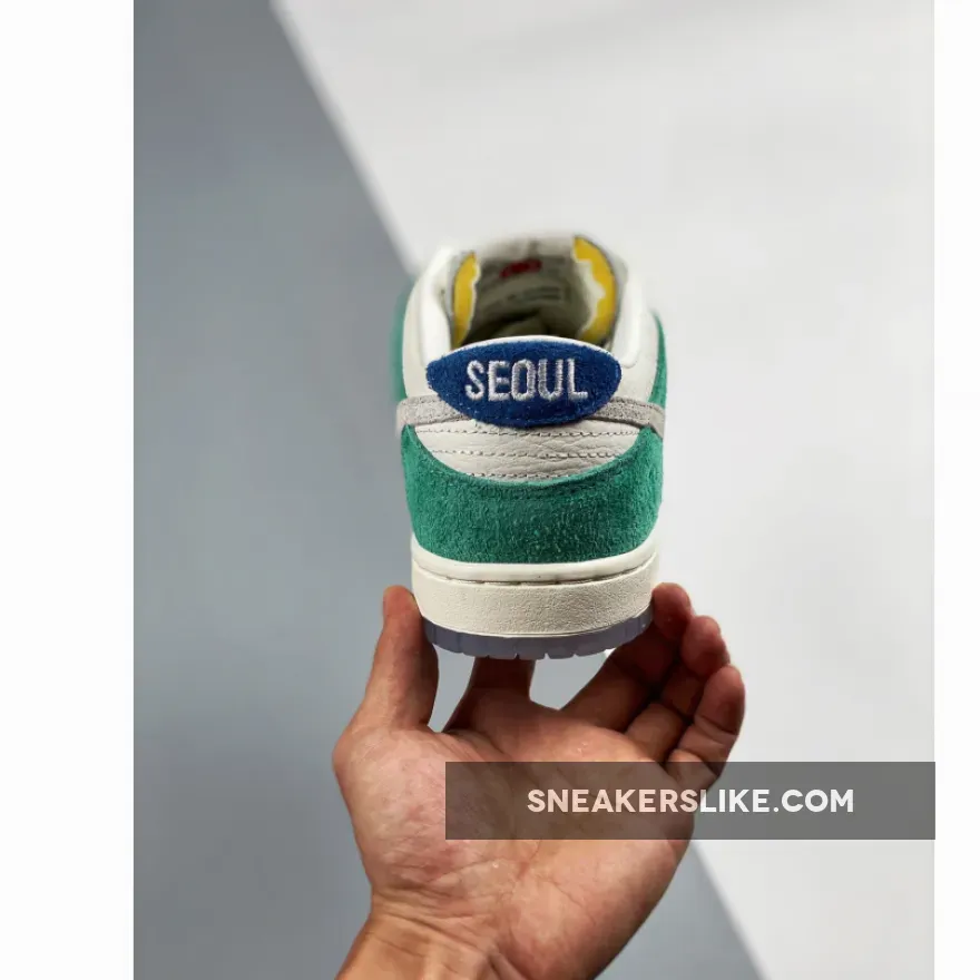 Made in collaboration with the Korean retailer, the Kasina x Nike Dunk Low ‘Road Sign’ features colors inspired by the signage that lines the major highway connecting Busan and Seoul. The upper combines off-white leather with Neptune Green suede overlays and a grey suede Swoosh. Navy blue heel tabs replace Nike branding with ‘Busan’ and ‘Seoul’ on the left and right shoe. Additional details include Kasina’s logo on the lateral heel and the retailer’s name printed in Korean lettering on the tongue tag.