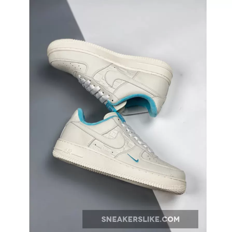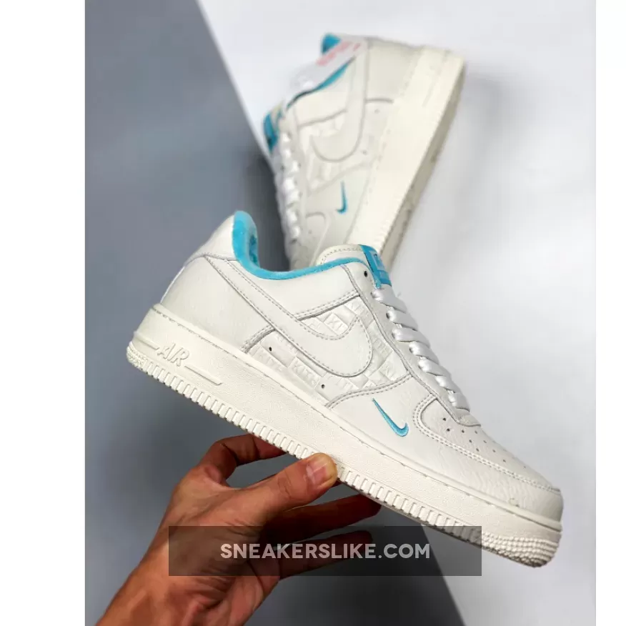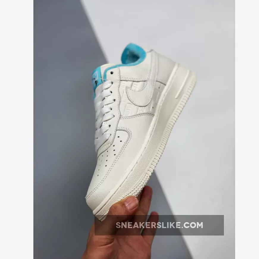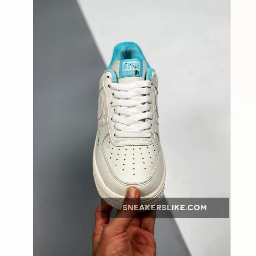 Dressed in a White, Blue Lagoon, Aloe Verde, and White color scheme. Inspired by the map of Hawaii, this Kith x Nike Air Force 1 features an all-White leather upper with Light Blue hits seen on the velvet lining and embroidered mini-toe Swoosh, while the tongue label highlights “Kith Air Force 1” above a map of Hawaii. Other details include special Kith Air logos, a reimagining of the Nike Air logo, embroidered on the heel tabs and printed on the footbeds.