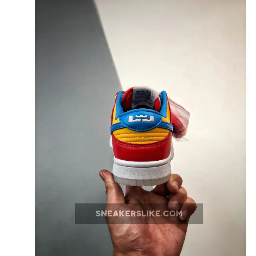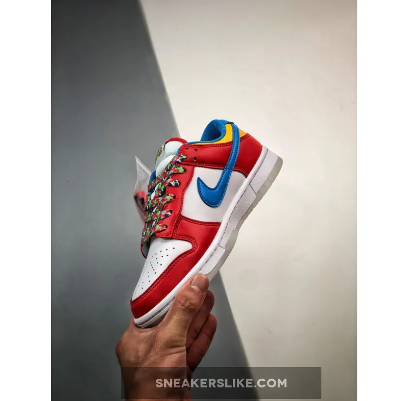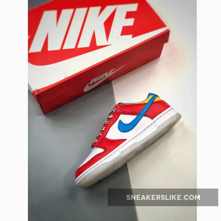 Look out for the delicious LeBron x Nike Dunk Low Fruity Pebbles. This fun sneaker features a vibrant, cereal-inspired colourway that will surely perk up your mood. The smooth white leather base covers the perforated toe and quarters while red animates the forefoot, throat and heel overlays. Blue enters the picture via the Swoosh and heel tab.Finally, pops of yellow complete the eye-catching palette. Finishing touches include the multicoloured laces and the vivid cereal graphics found at the insole.