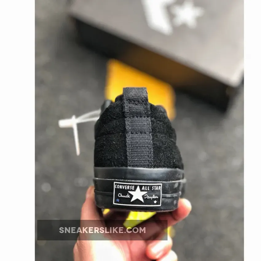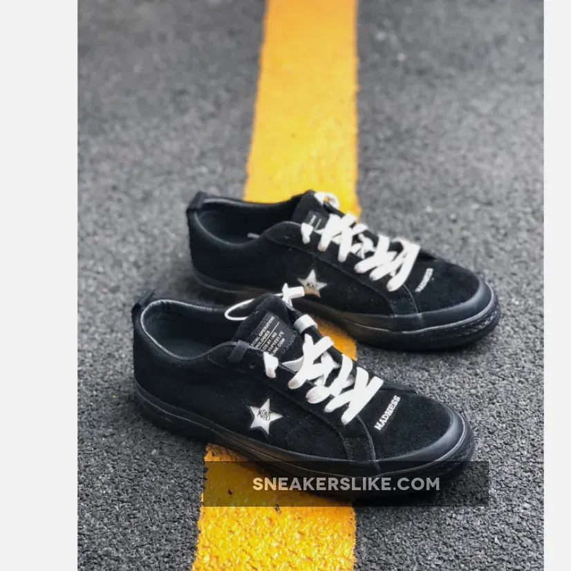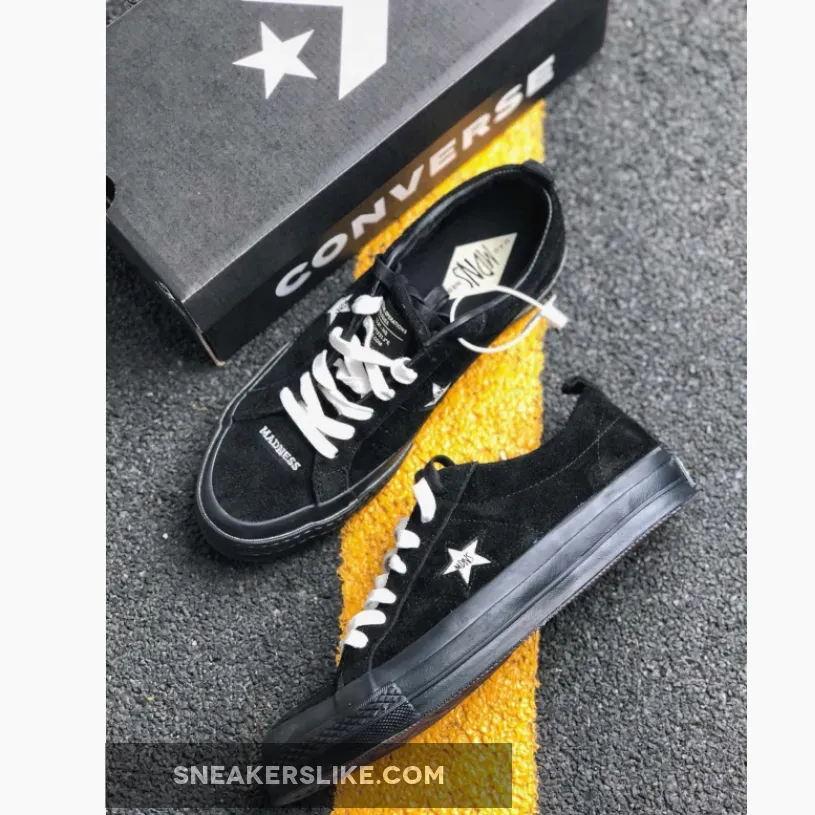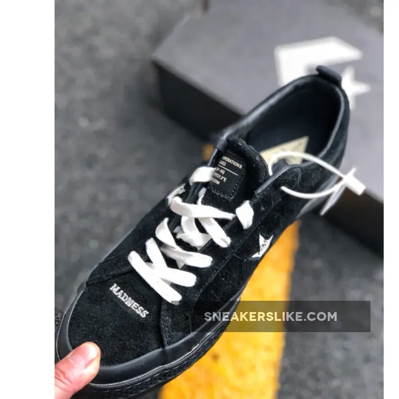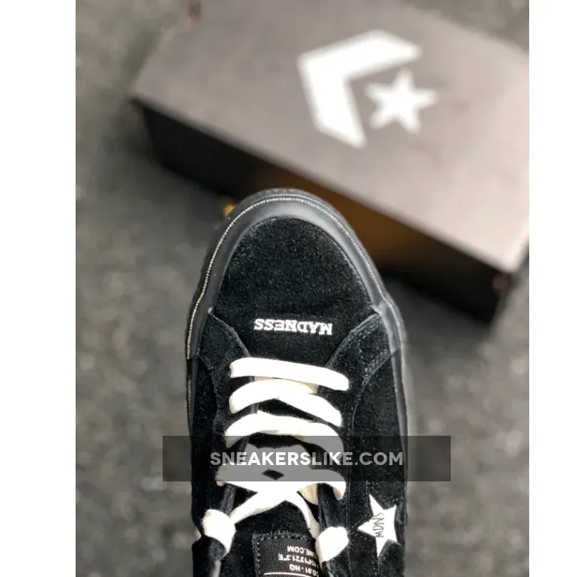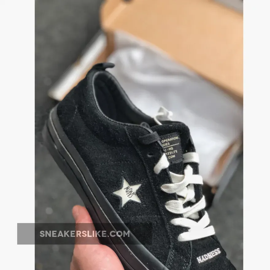 The classic low-top silhouette boasts a black suede upper, which shows varying hues of black due to its texture, black stitching throughout, off-white star branding with MADNESS logo embroidery, off-white embroidered detailing at the toe and off-white laces for a pop of contrast.