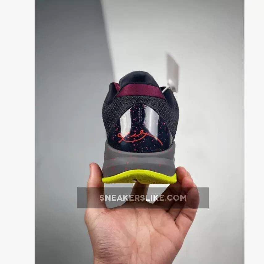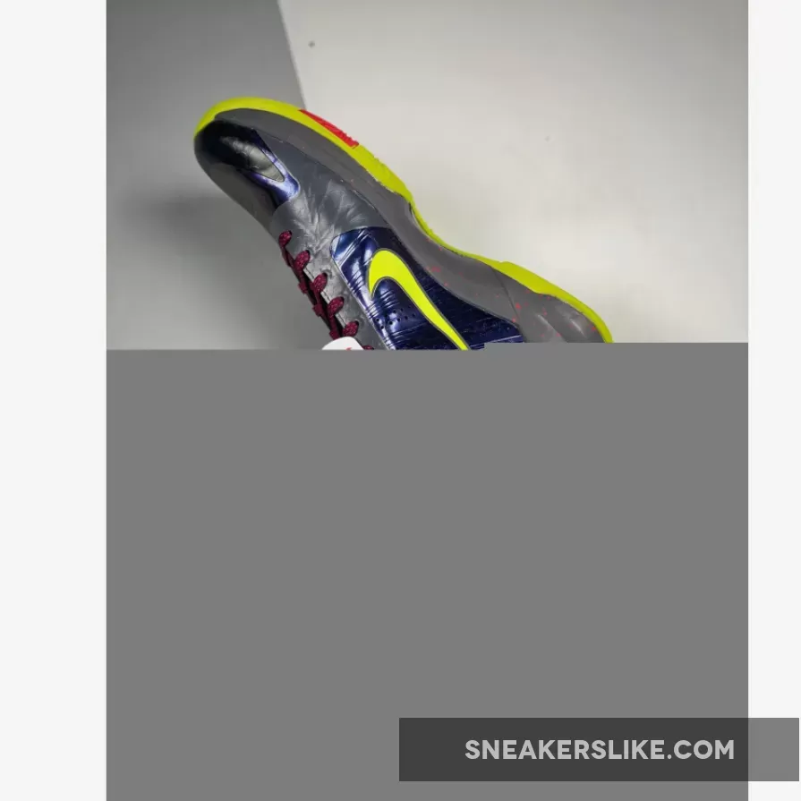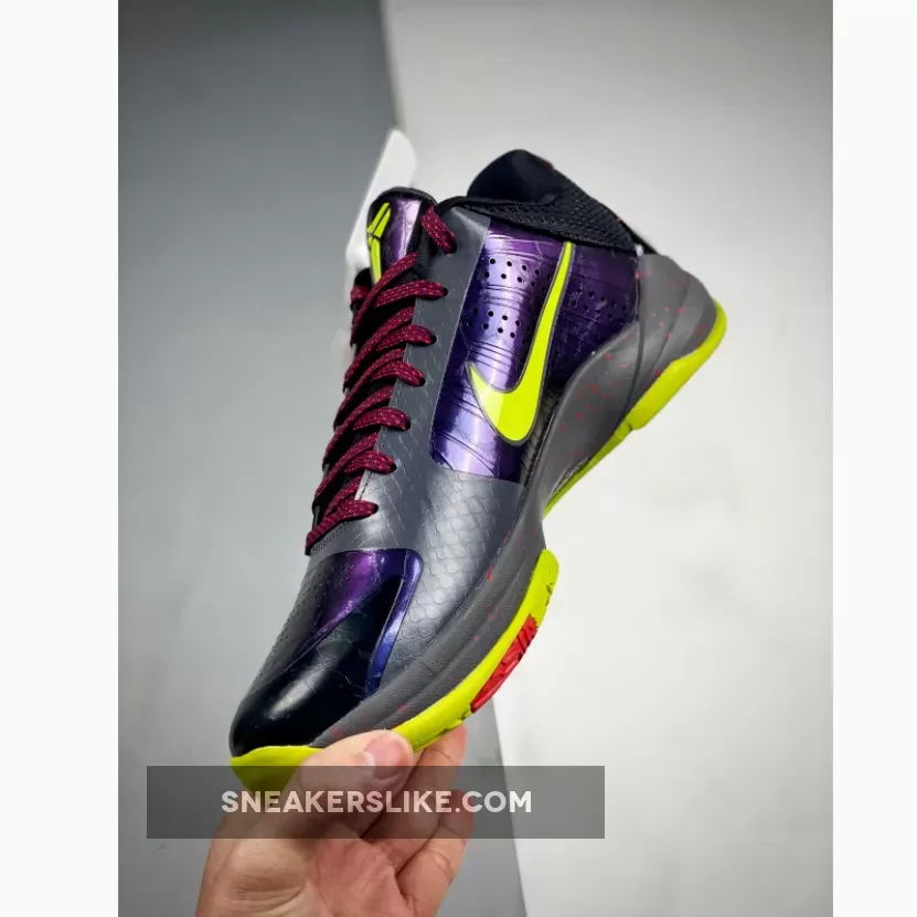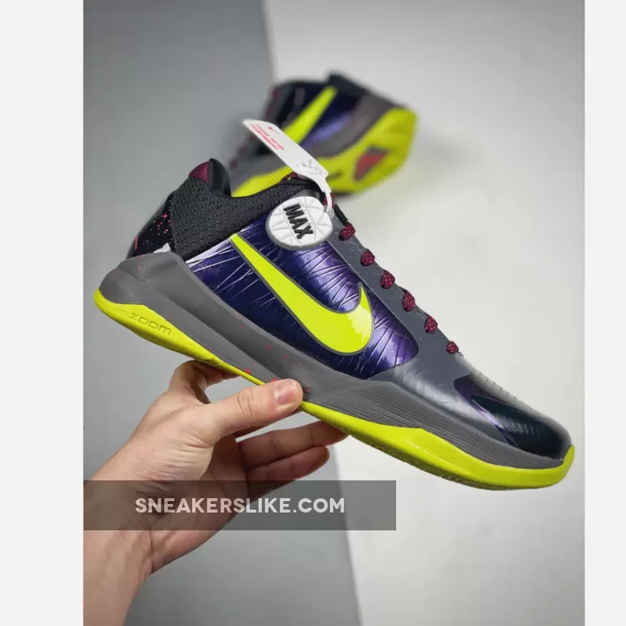 This rendition of the “Chaos” Kobe 5 Protro comes dressed in the same Joker-themed colors with iridescent panels and replaces the White overlays with a Charcoal snakeskin fabric. A darker shade of Grey is also added to its midsole, which is different from the original.