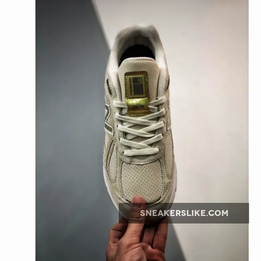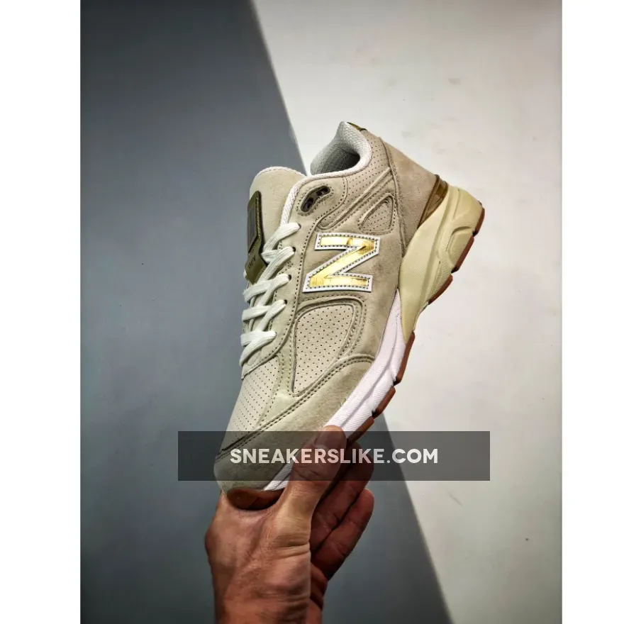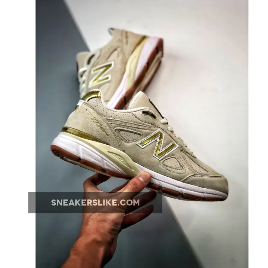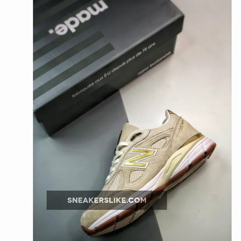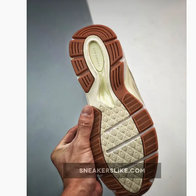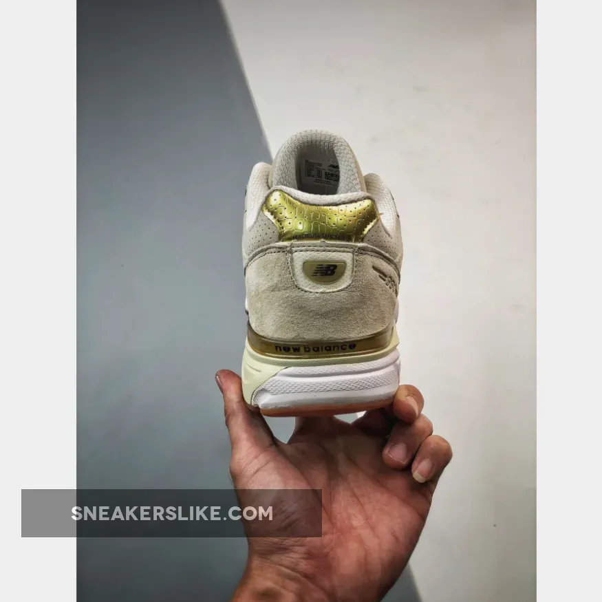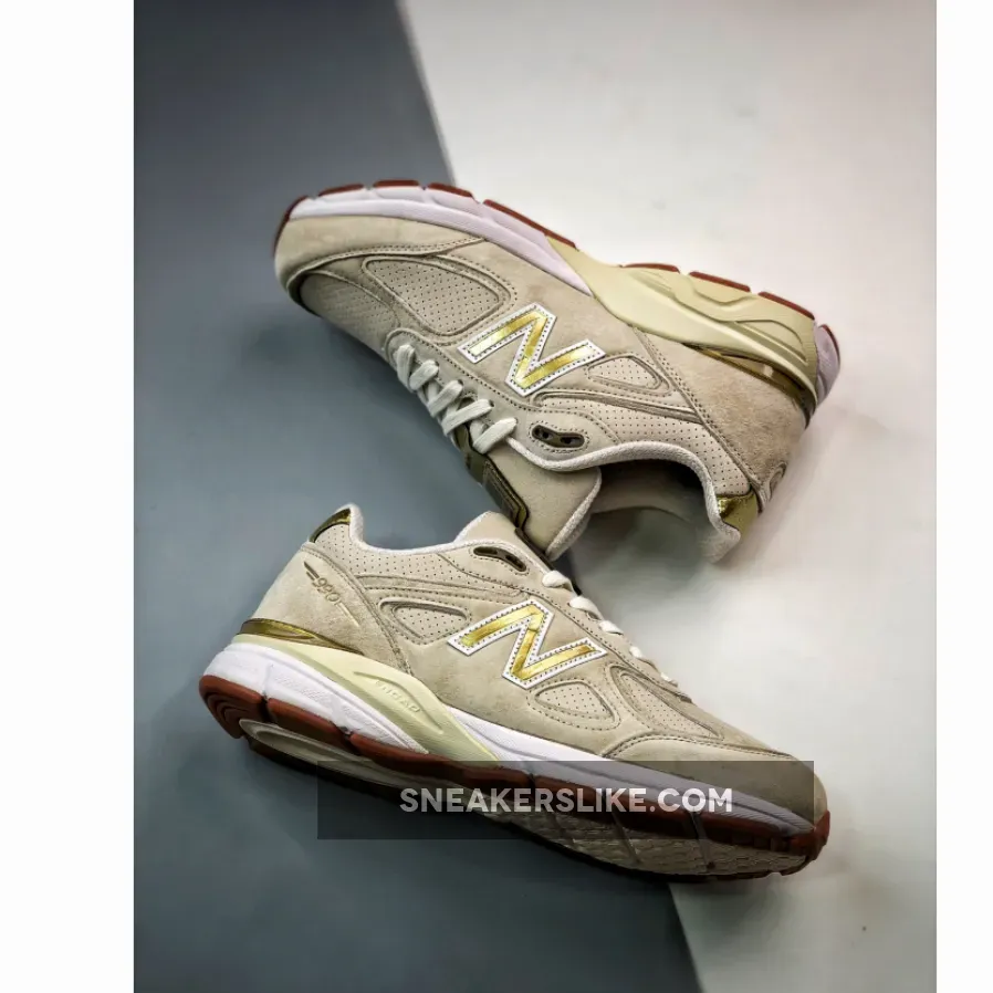 The kicks feature a lightweight, breathable tan upper constructed for a top tier level of comfort. On the side, a reflective detail appears which was created to offer a hint of color while worn at night on the roads. We also see dual-density collar foam which was added to provide cushioning and support. Lastly, the brand’s “N” symbol appears in a metallic gold hue outlined with white trim.