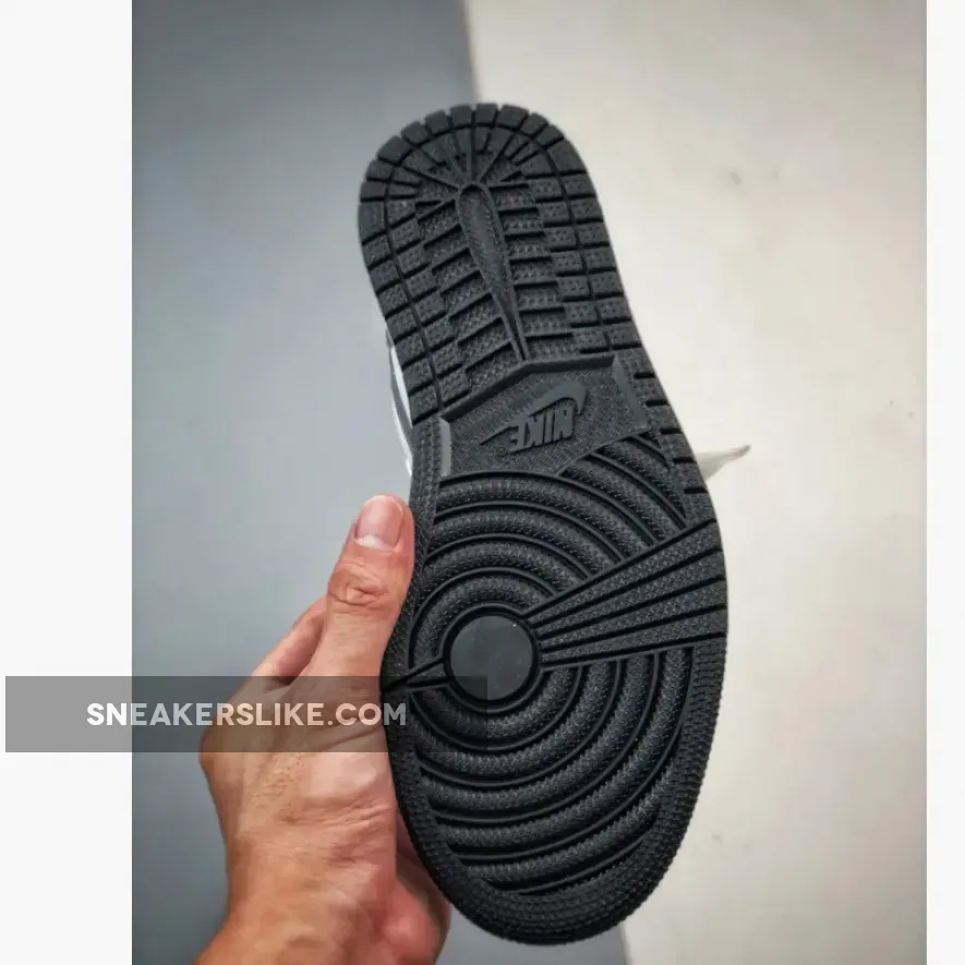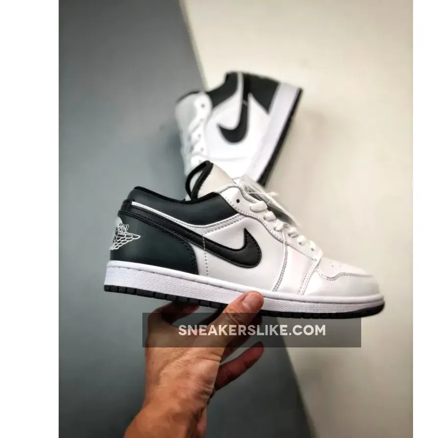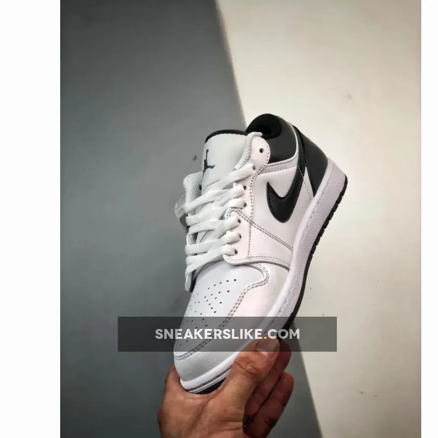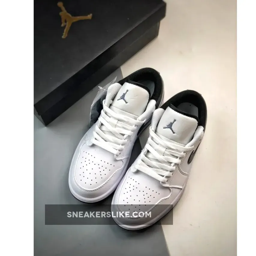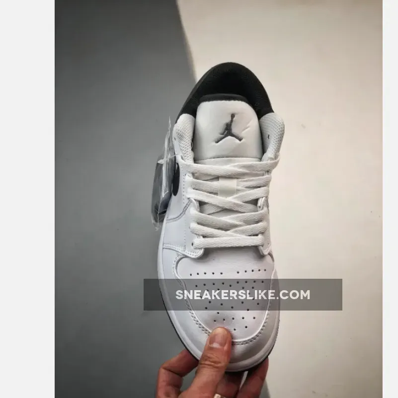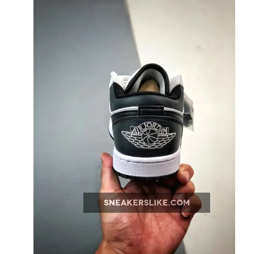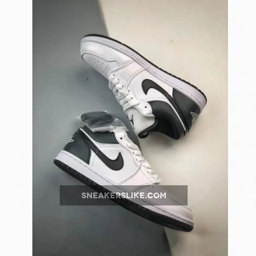 this Air Jordan 1 Low is primarily covered in white leather with contrasting black accents on the back half. Smooth white leather gracefully wraps around the toe box, mudguard, eyestays, and quarter panel. A black Swoosh cuts across the middle of the silhouette, placed between the black heel counter and collar. Additional black details are found on the sock liner and tongue lining. A black Jumpman logo adorns the tongue, while the signature Jordan Wings logo is finely embroidered on the heel in white.
