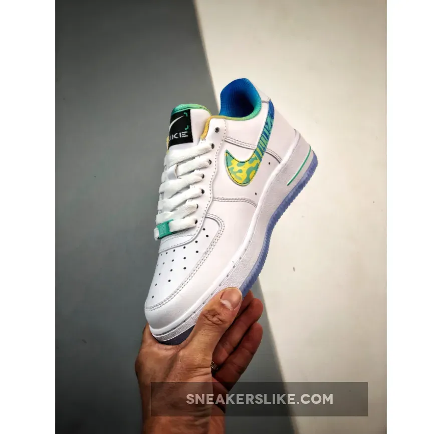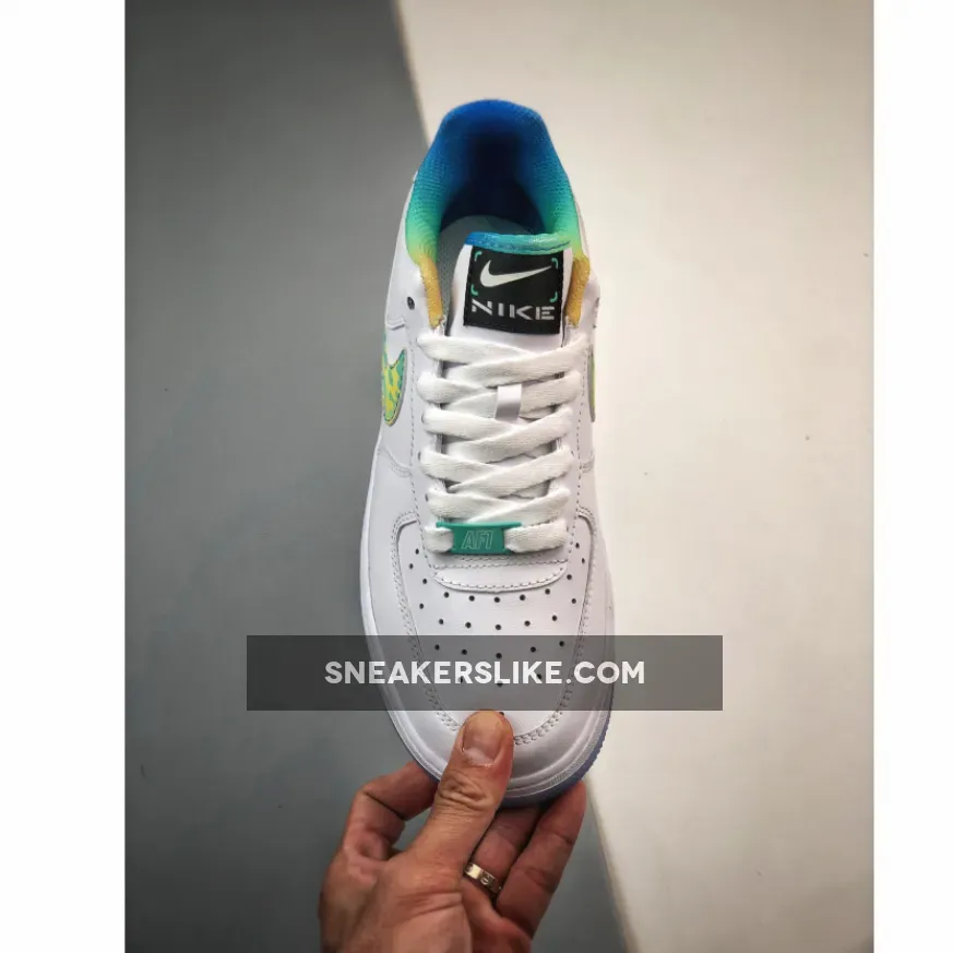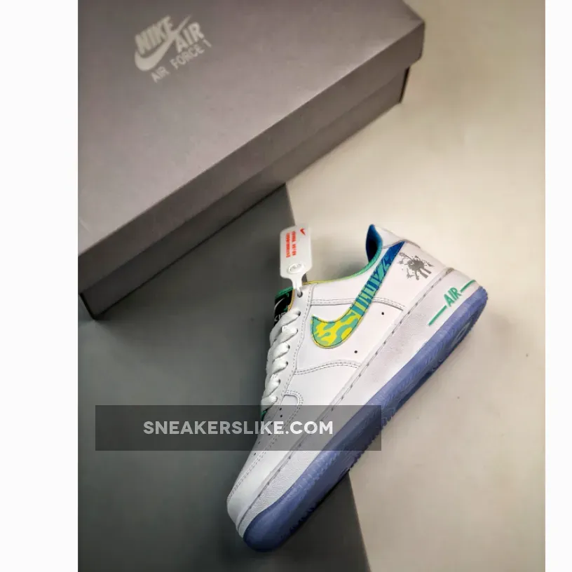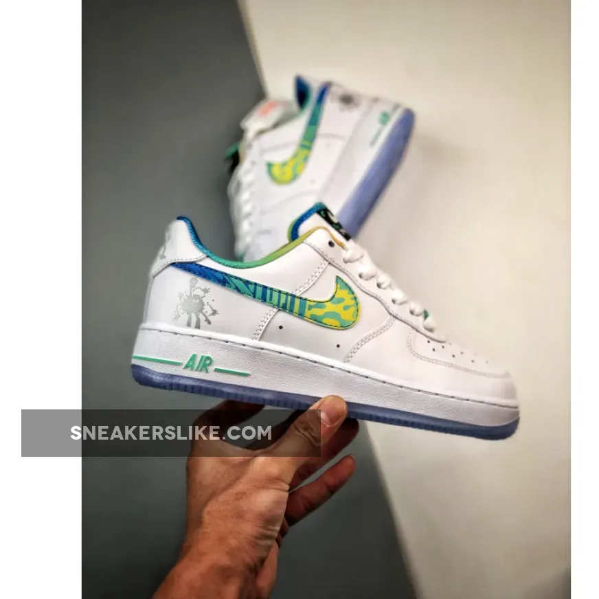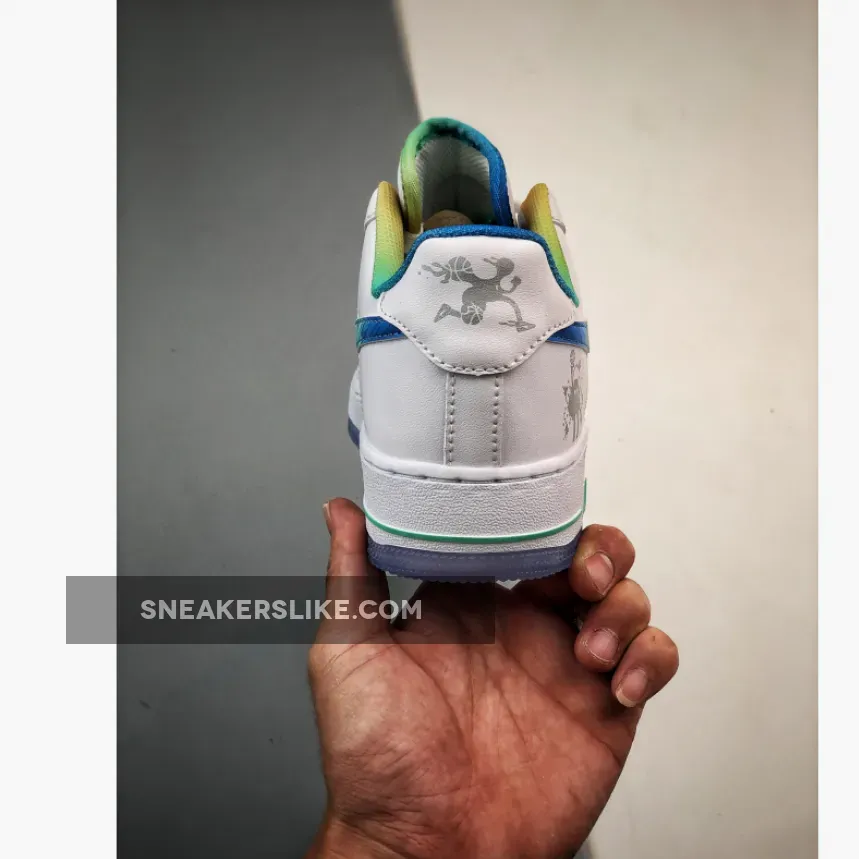 This offering of the Nike Air Force 1 Low features a White leather upper with matching tongues and gradient tongue and inner lining. Having a playful theme, shades of Yellow, Green, and Blue that gradient adorn the inside of the tongues and liner. A unique graphic lands on the Swoosh logos, and Black hits the tongue labels. An alien character in Silver appears on the lateral ankle and heel tabs. Other details include The “Unlock Your Space” motif is stamped onto the insoles atop a White midsole and icy translucent outsole to complete the design.
