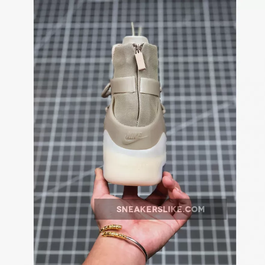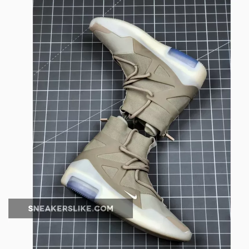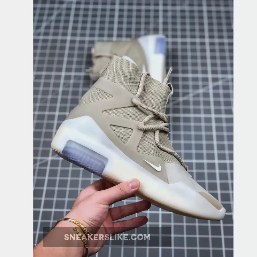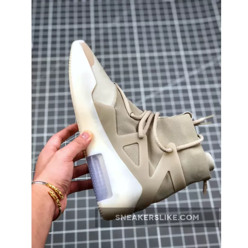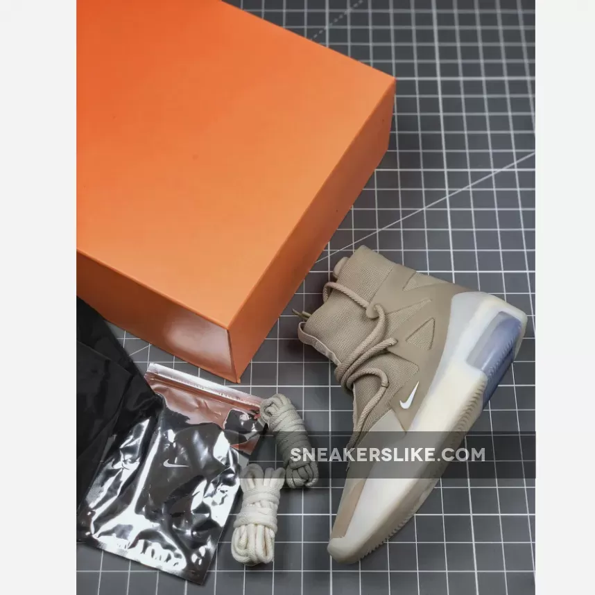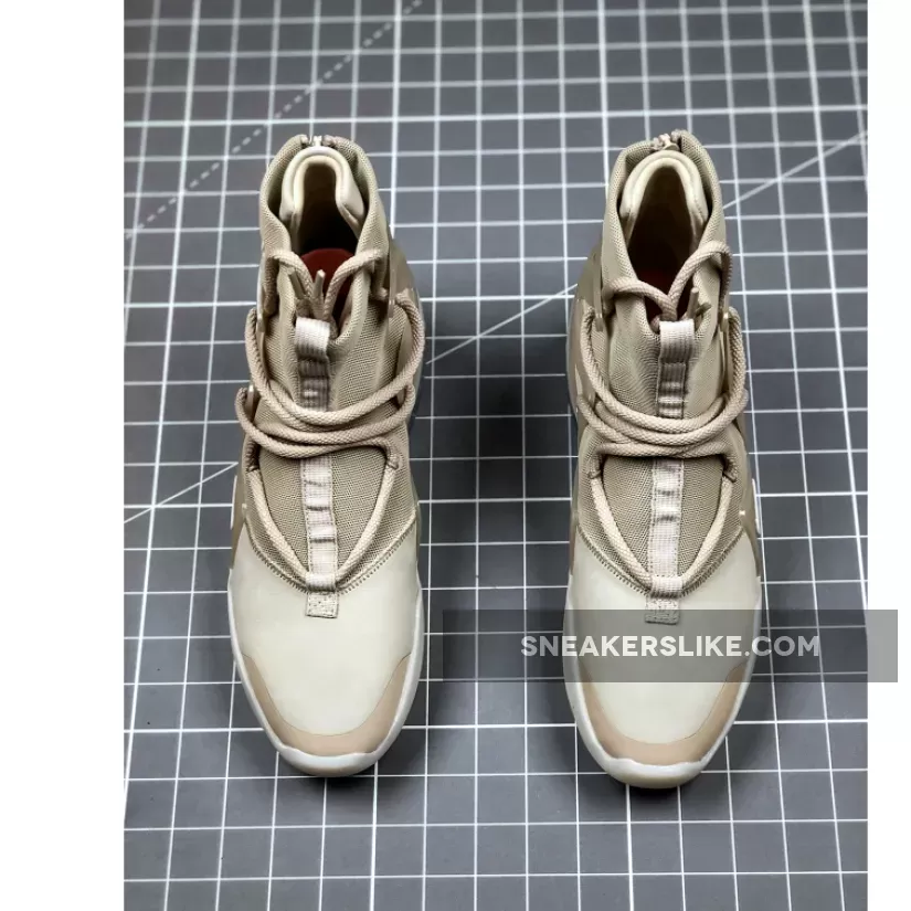 Dressed in Multi-Color, String, and Oatmeal color scheme. This Nike Air Fear of God 1 features a Tan hue covering the knitted bootie upper, exterior cage, and laces.