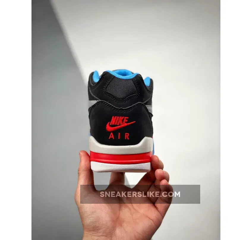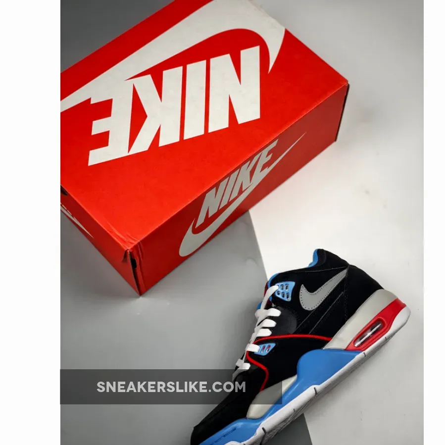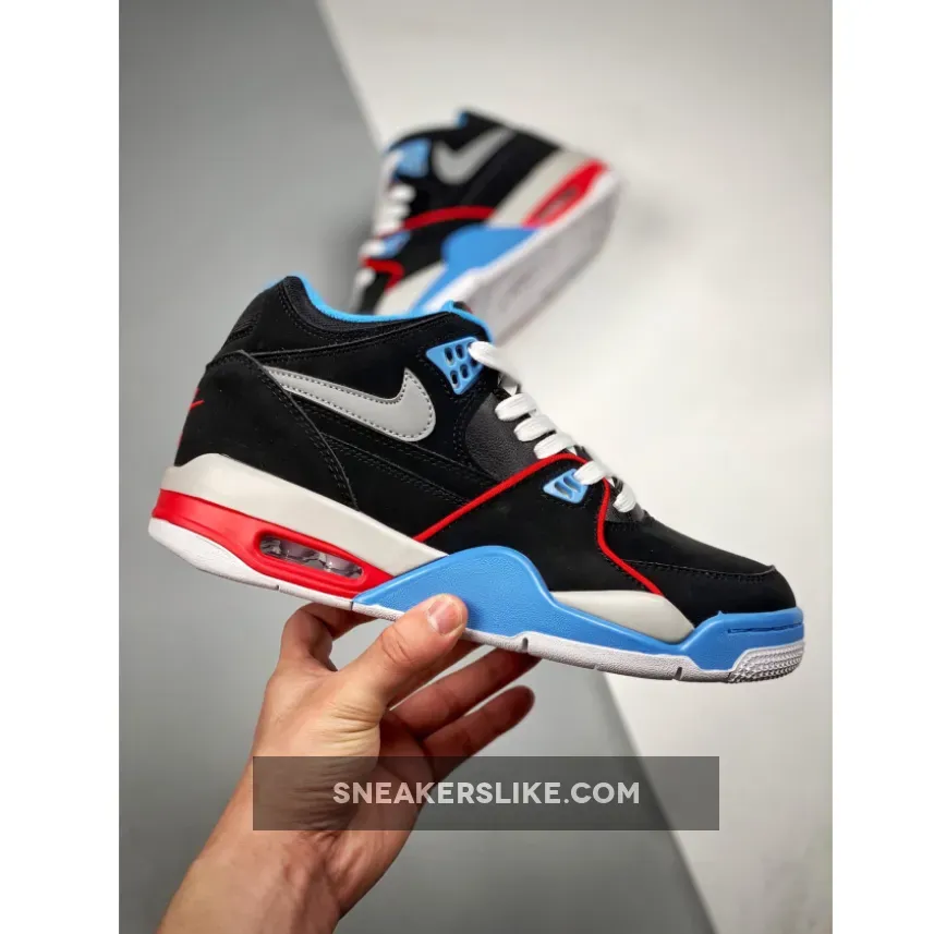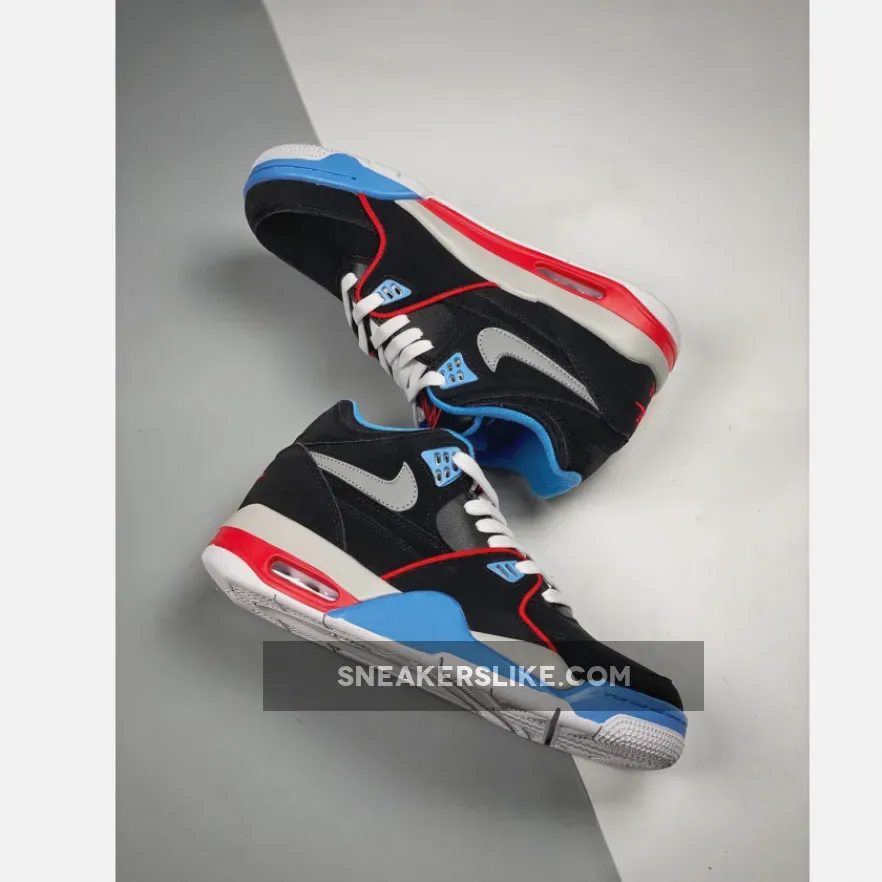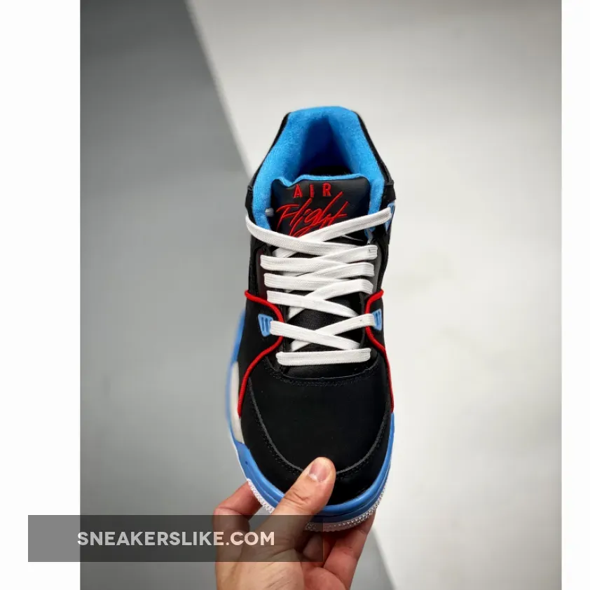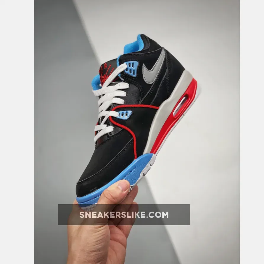 This edition of the Air Flight 89 sports a Black suede, mesh, and leather upper contrasted with Light Blue and Red contrasting accents throughout.