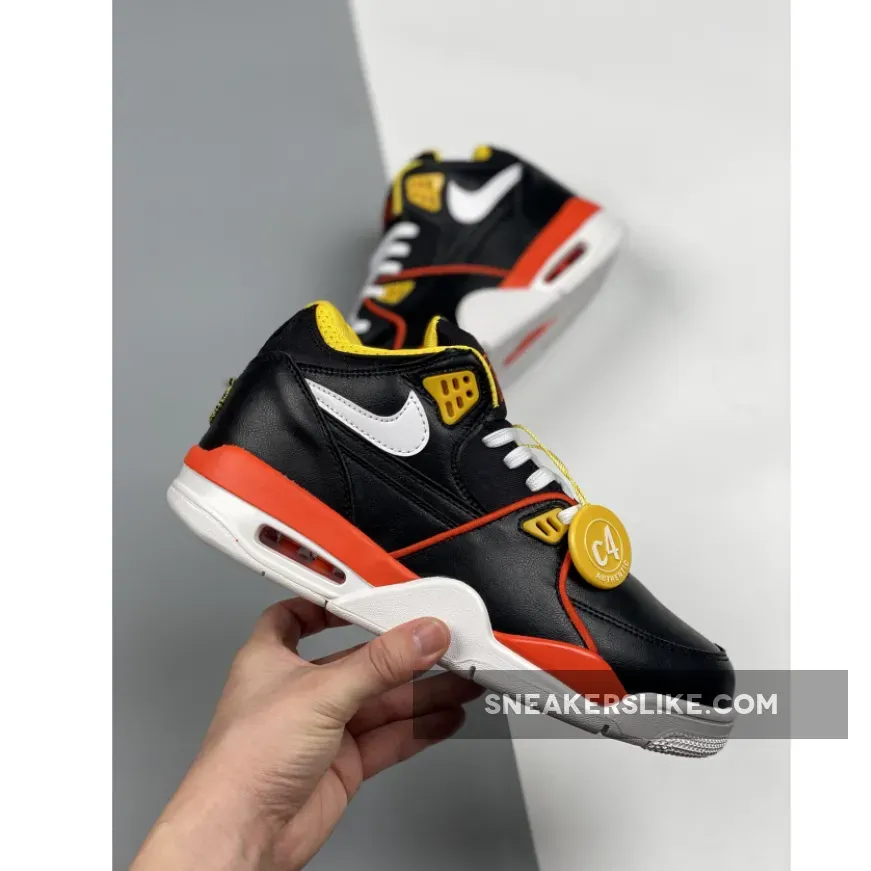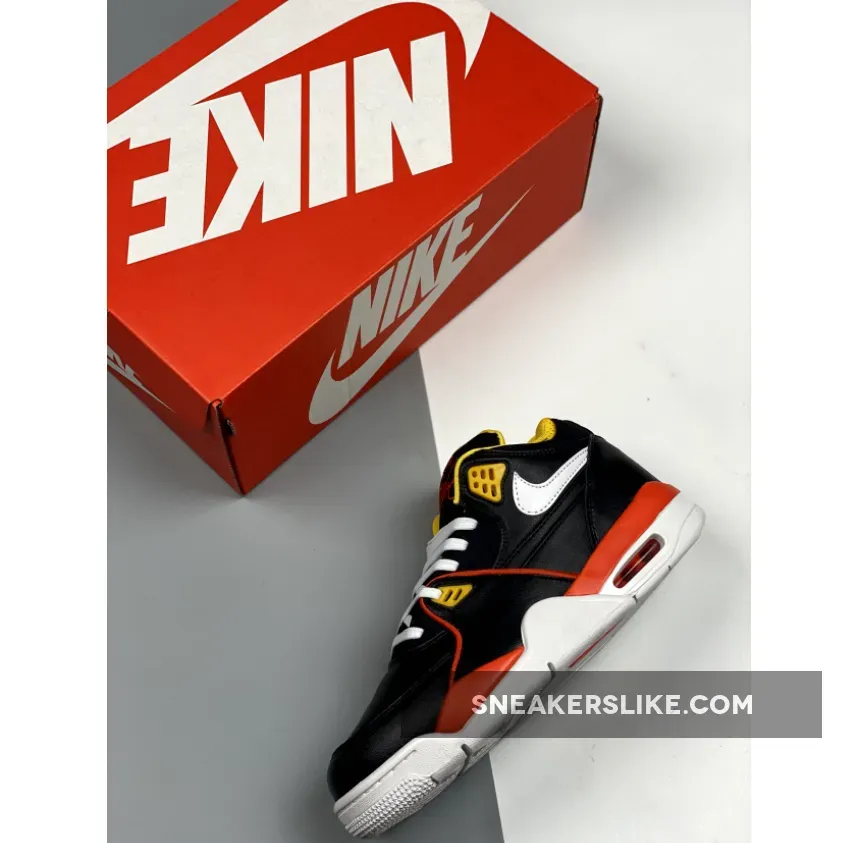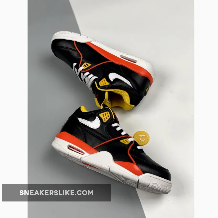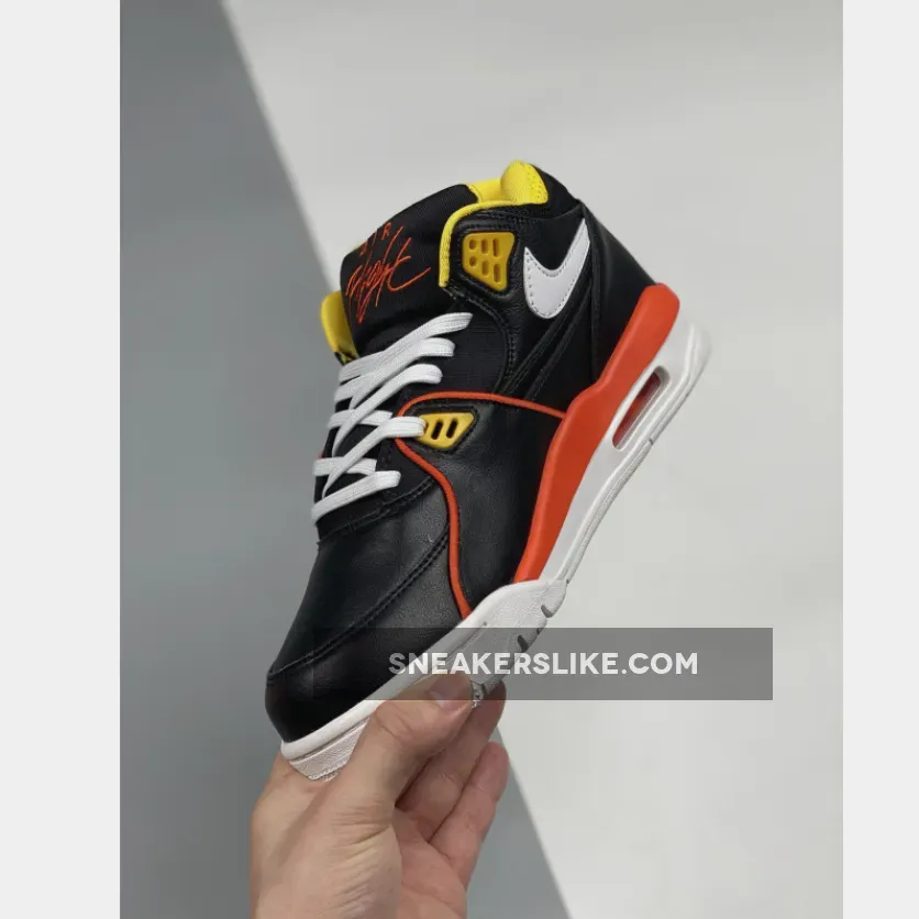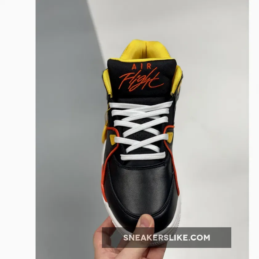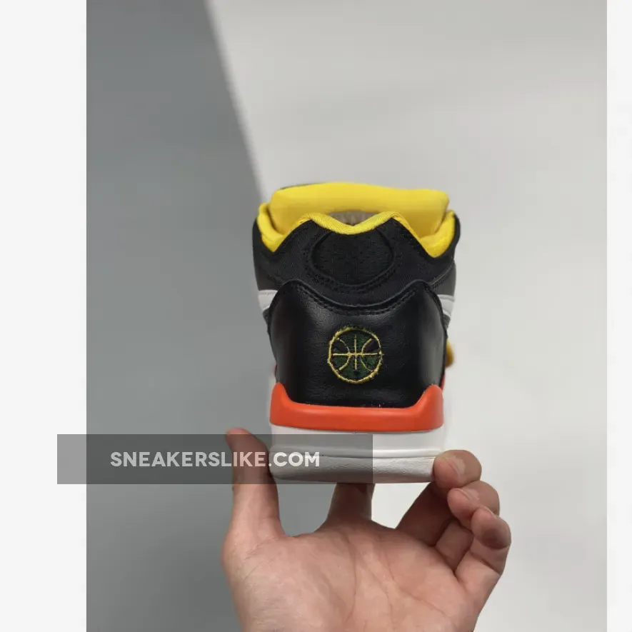 This “Rayguns” version of the Nike Air Flight 89 features a Black leather base with Gold and Orange contrasting accents throughout.