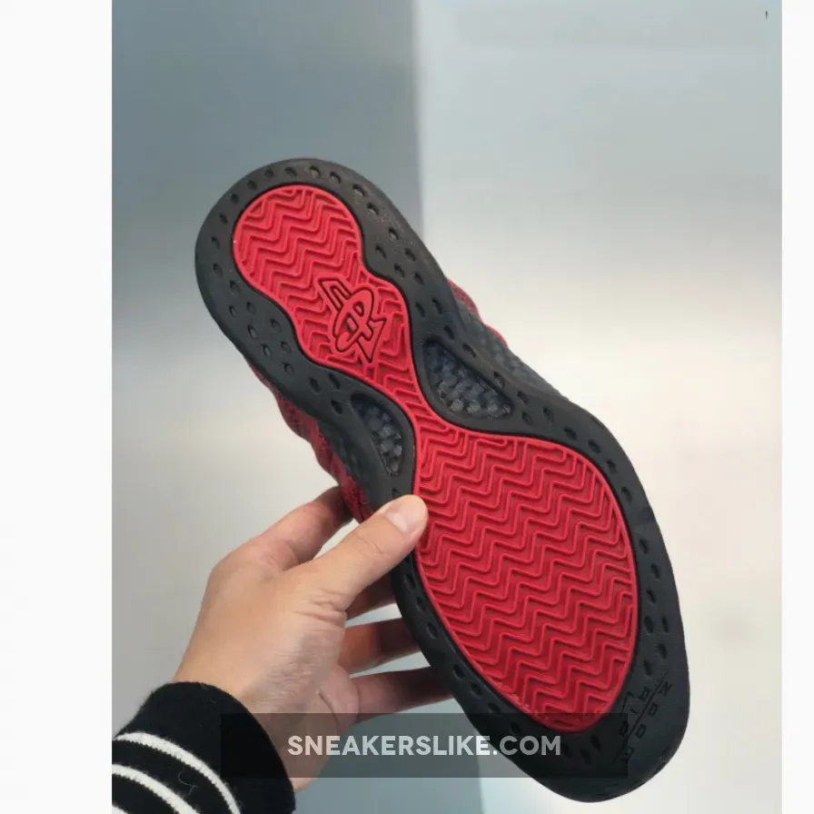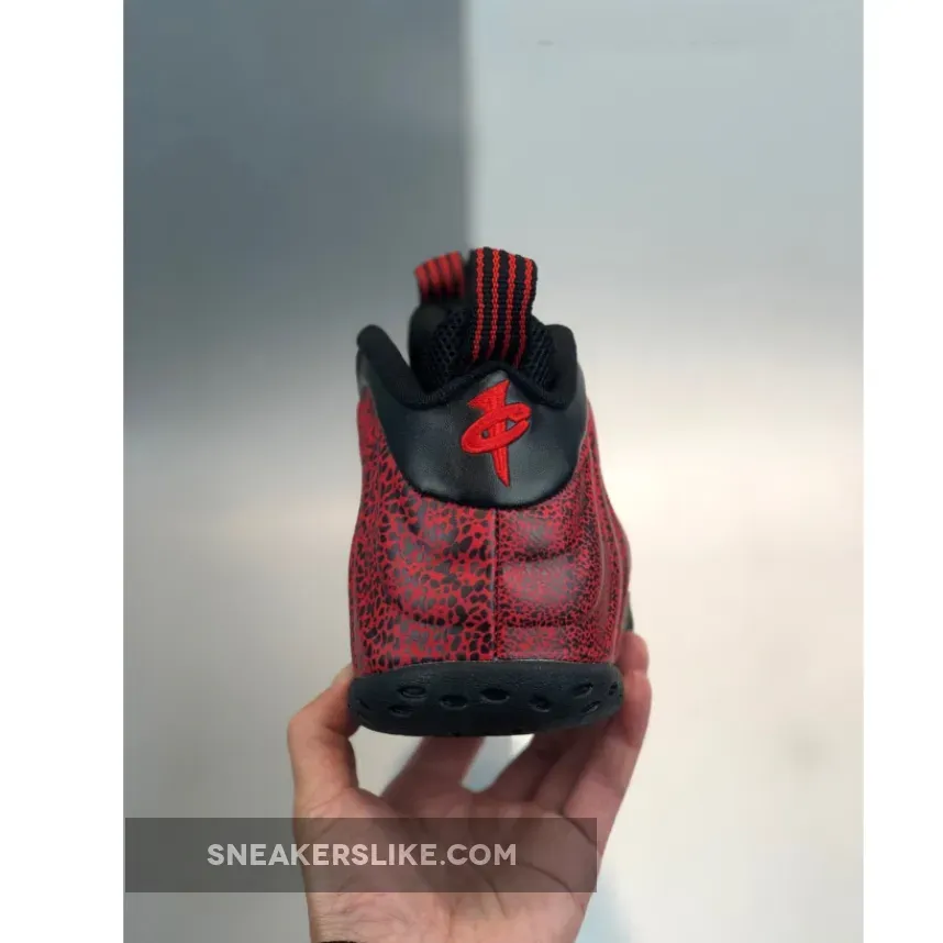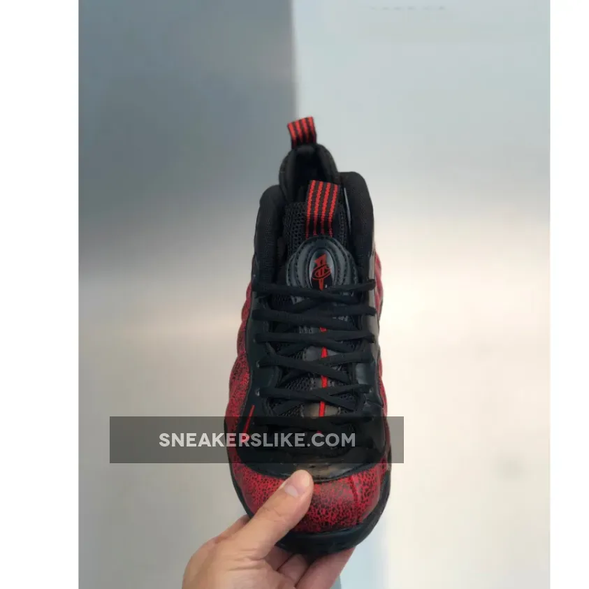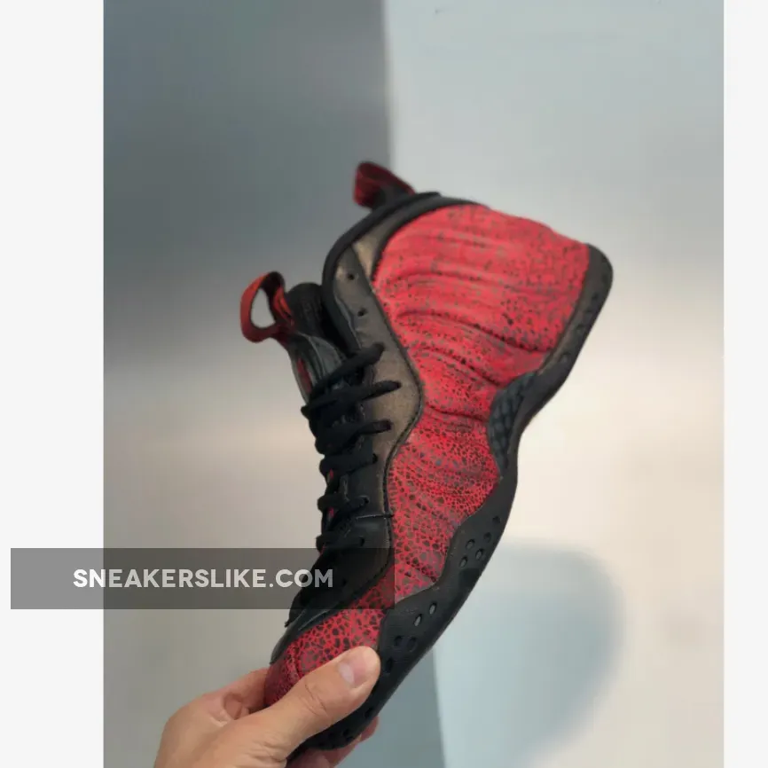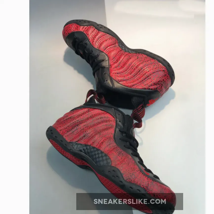 Dressed in a Black, Total Crimson, and Bright Crimson color scheme. This Nike Air Foamposite One features a Black leather upper, mesh tongues with Crimson contrasting accents throughout. Highlighting the shoe is a Lava-styled design covering the Foam shell atop a Black rubber sole.