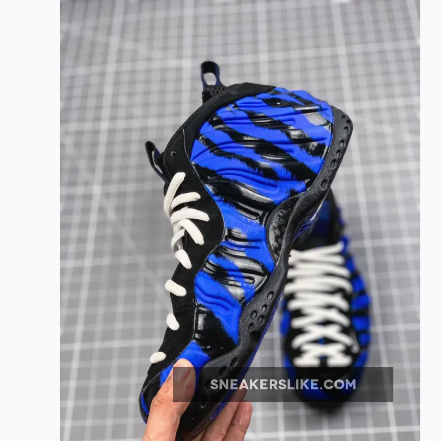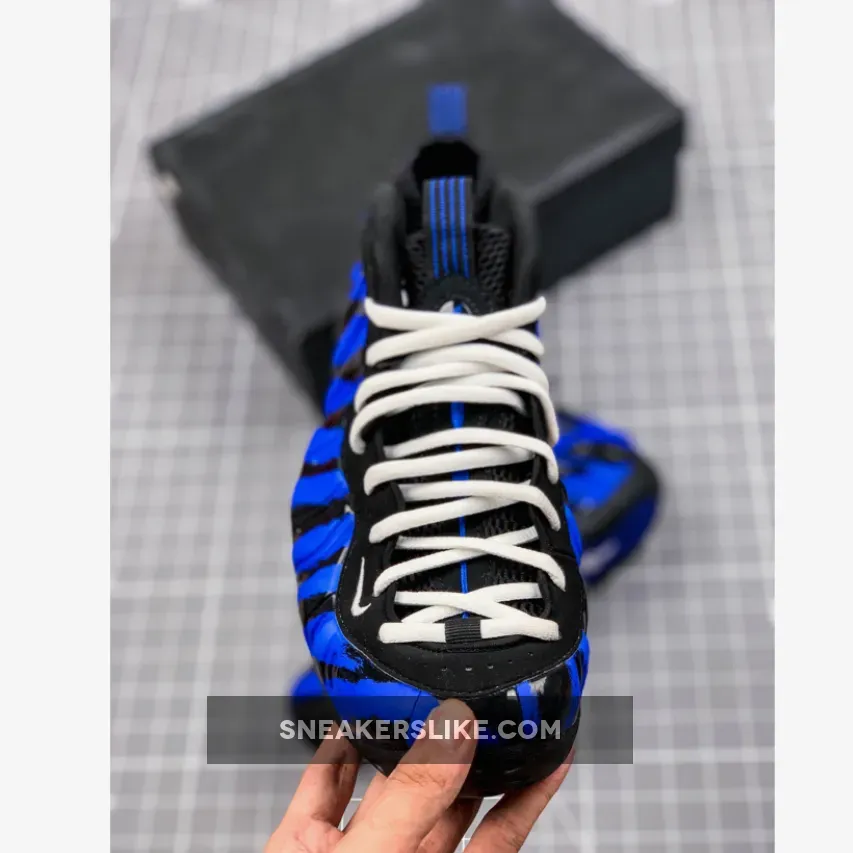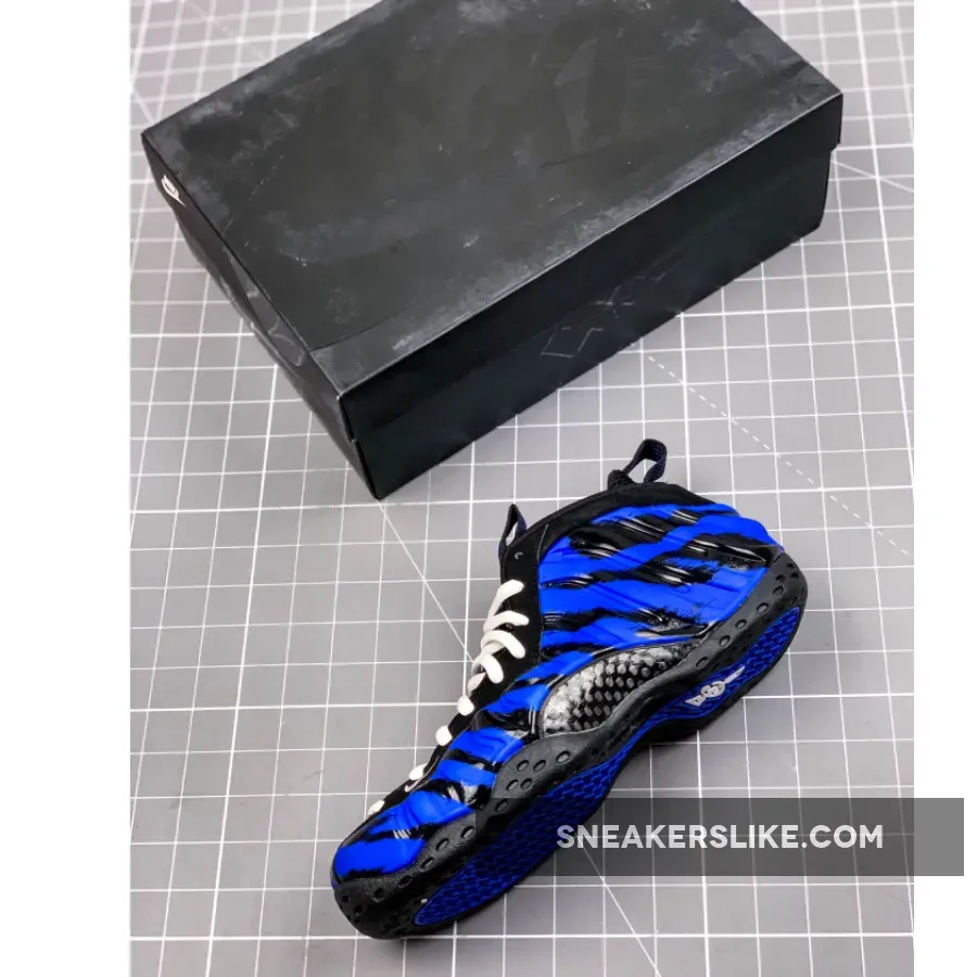 The shoe features a Blue Foamposite upper with Black tiger stripes throughout. White laces, Black rubber outsole, housed in a custom wooden box with engraving of Penny’s personal motto, “Ballin’ Is What I Was Born To Do.”