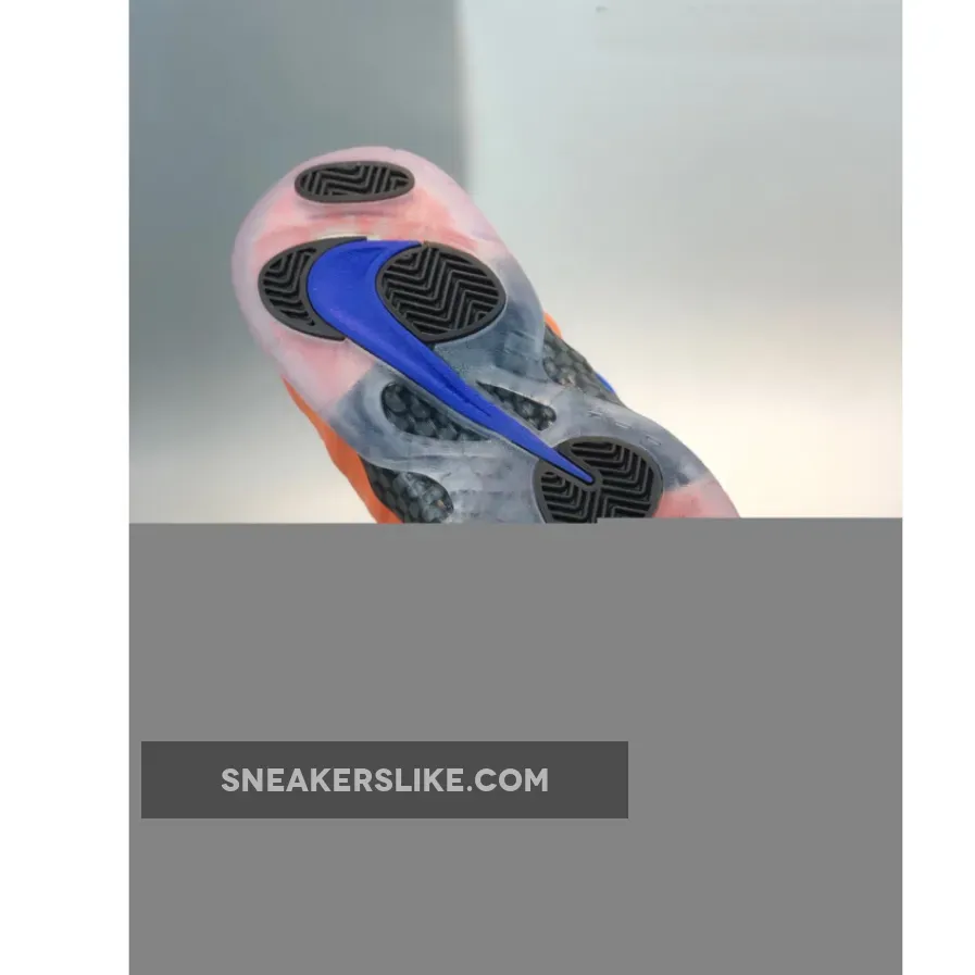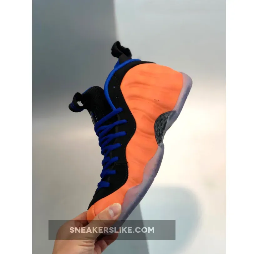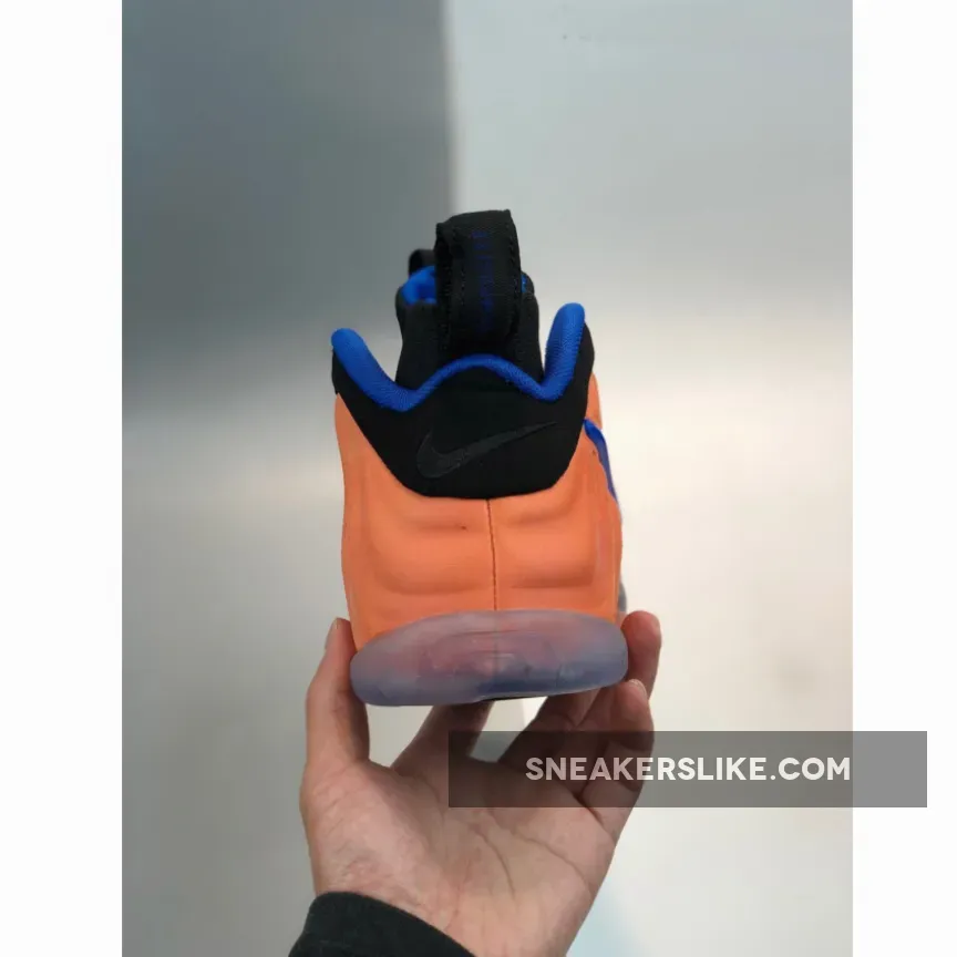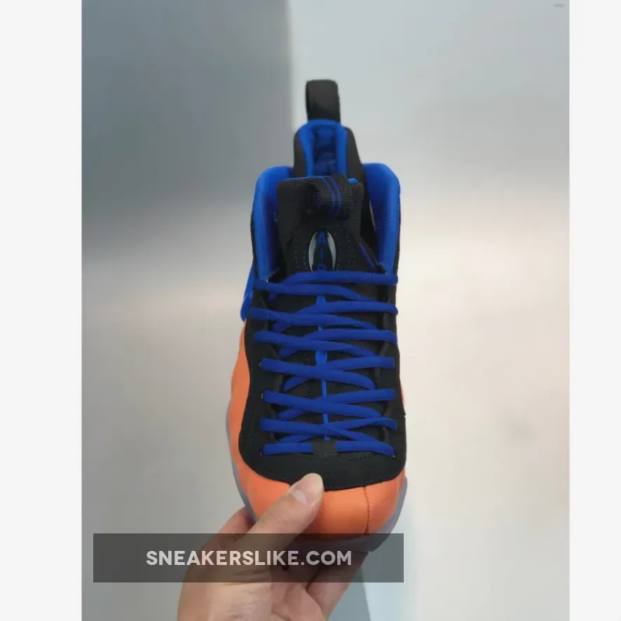 The Knicks’ signature color combination dominates the uppers, featuring an orange Foamposite shell and blue accents on the Swoosh, laces, and sockliner.