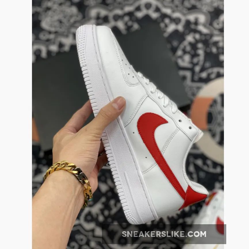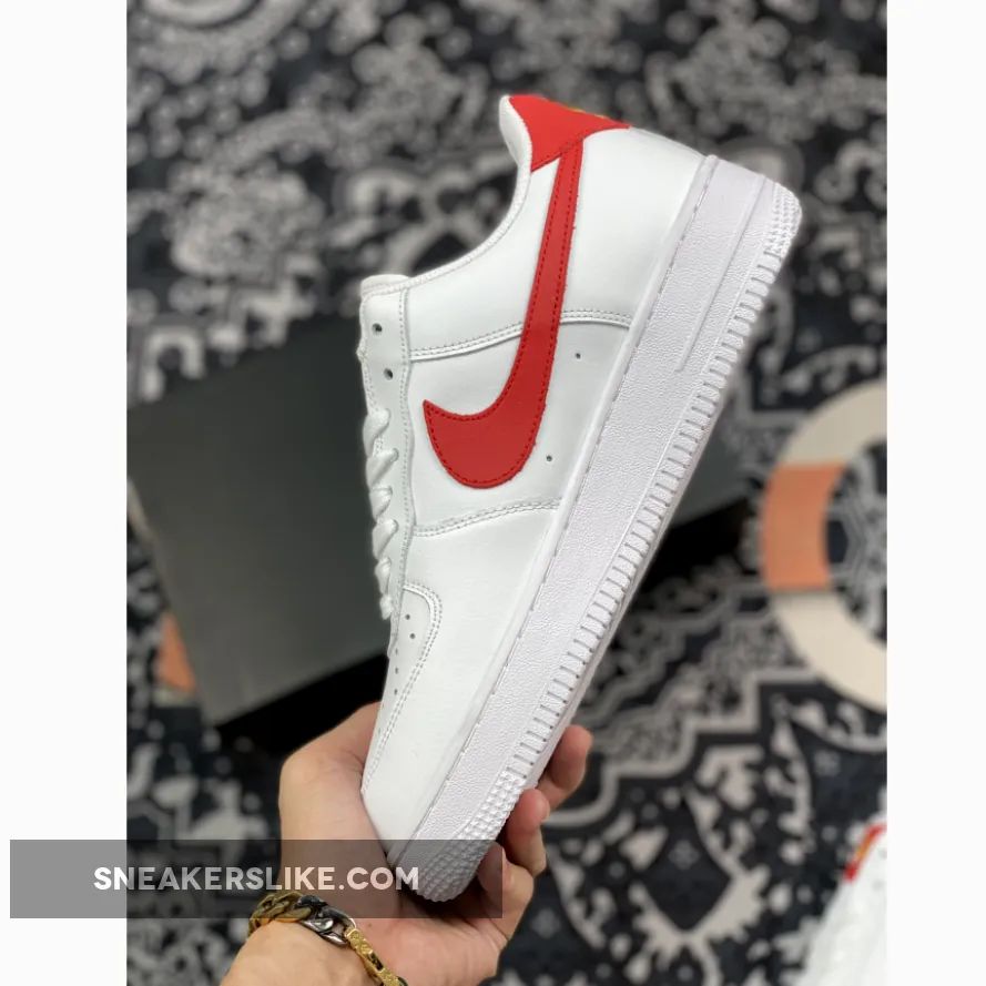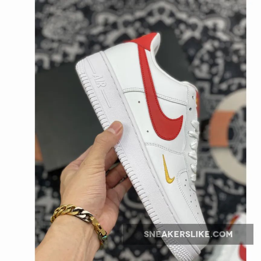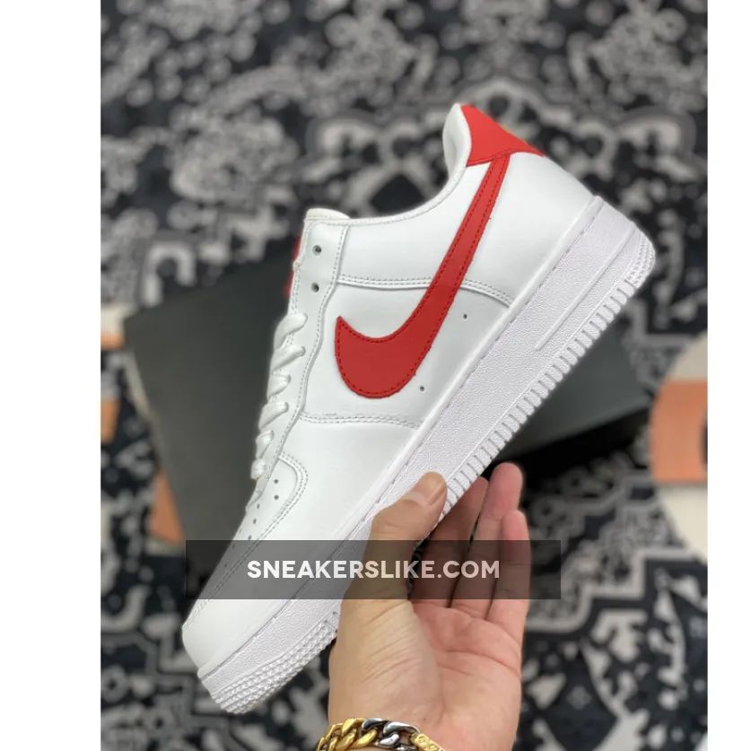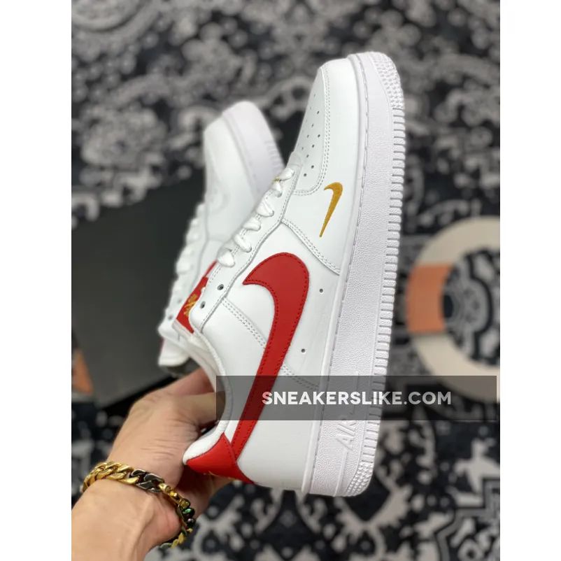 This offering for the Nike Air Force 1 features a White leather upper paired with Gym Red leather Swooshes, heels, tongue labels and insoles. Highlighting the shoe are Gold branding and lace dubraes completed with a solid White AF1 rubber sole.