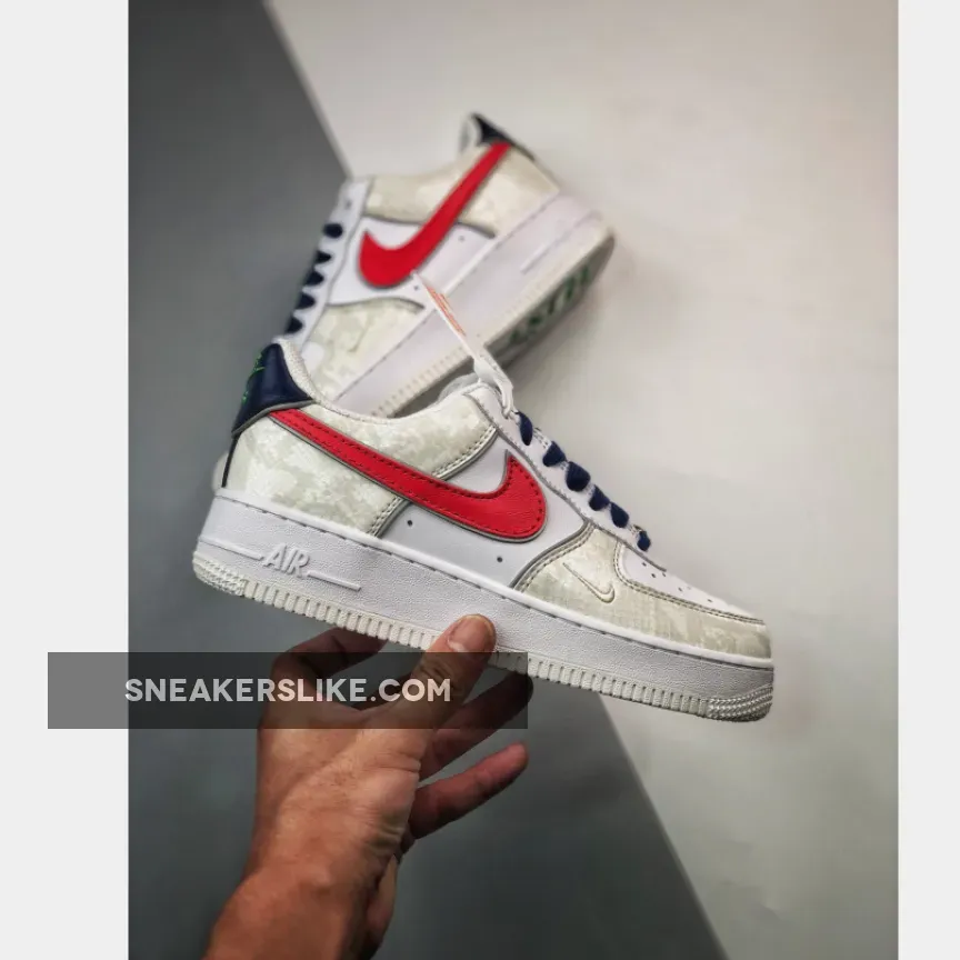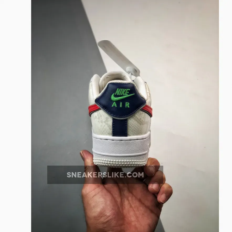 This Nike Air Force 1 Low comes with White leather on the base while snakeskin print appears on the overlays. Next, Blue lands on the laces and heel, Red fills in the Swoosh, and Green fills in the heel branding and outlines the tongue logo. 3M reflective accents run throughout, a jewel lace jewel with ‘AF-1 82’ text.