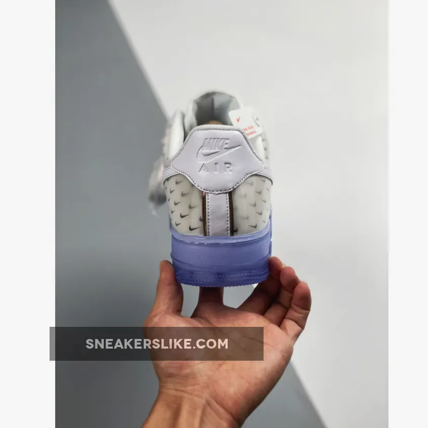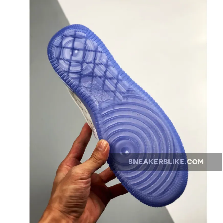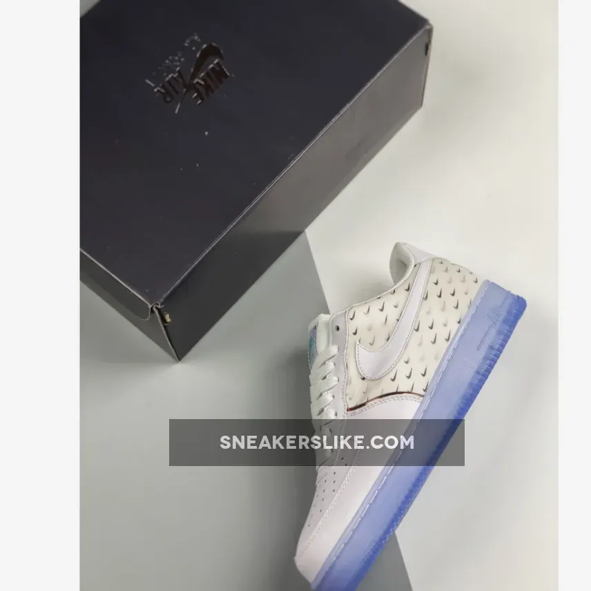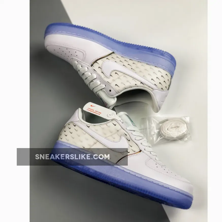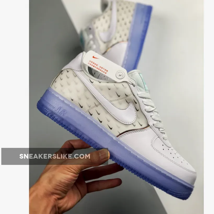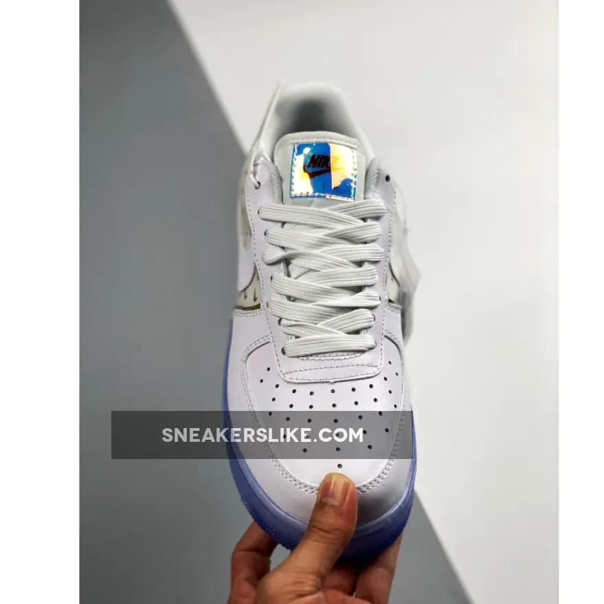 Dressed in a White, Multi-Color, and Racer Blue colors scheme. This Nike Air Force 1 features a White base with holographic finishes, stitched overlays, and bold style with its mini Swooshes along the sides.