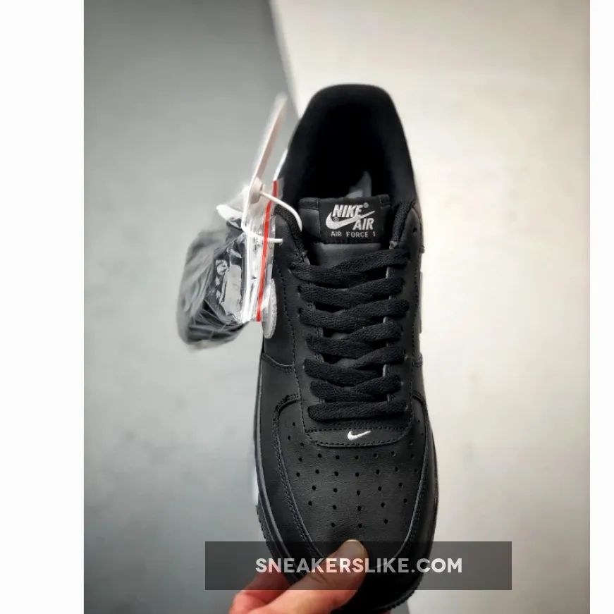 This version of the iconic Air Force 1 Low features a classic Black and White color scheme. The shoe boasts a full leather construction, ensuring durability and style. Perforations on the toe box enhance breathability, while the mesh tongues and inner lining maintain comfort. The all-Black upper, matched with black tongues, laces, inner lining, insoles, and AF1 rubber sole, creates a sleek and cohesive look. The White accents on the Swoosh logos, branded tongue tags, insoles, and heels complete the popular design.