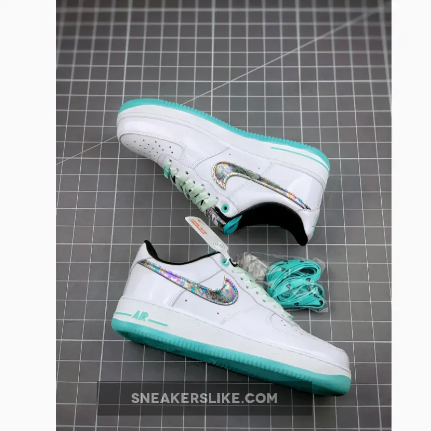 The abalone shell-like swoosh, which is an iridescent collage of blues, greens, and purples, sits atop a clean white leather base. The black used on the tongue and the inside sharply deviates from the stark white. Furthering the sea theme and adding extra pops of color, a bright aqua shade paints the outsole, piping on the tongue, and branding on the heel and midsole. This color gets softened to a mint-like shade for the laces, creating a balance of colors that allows for the shimmery swoosh to stand out.