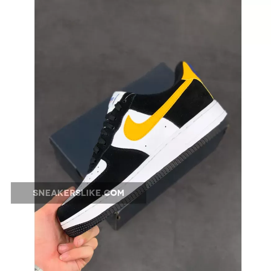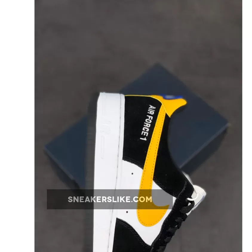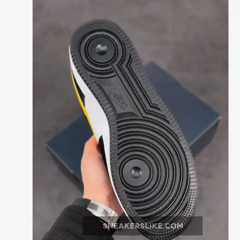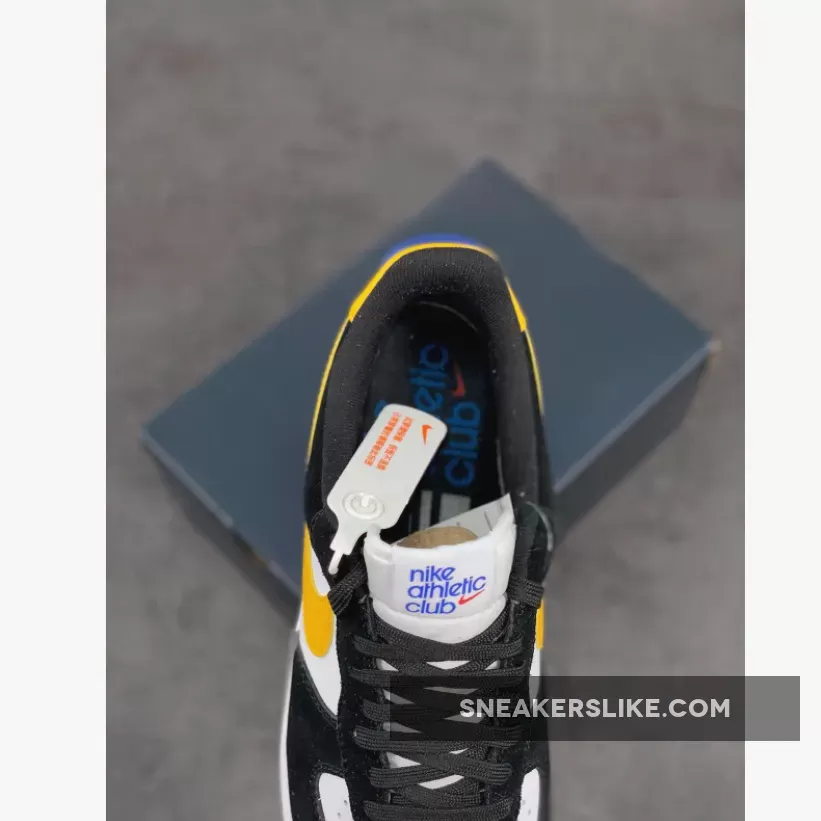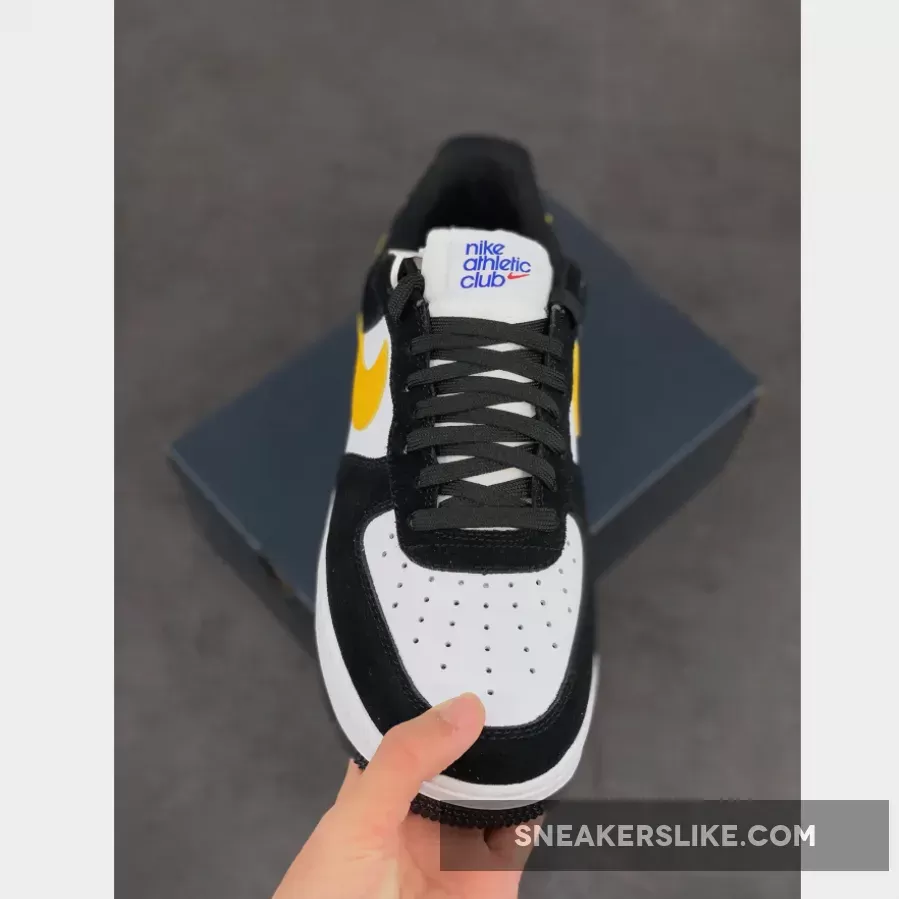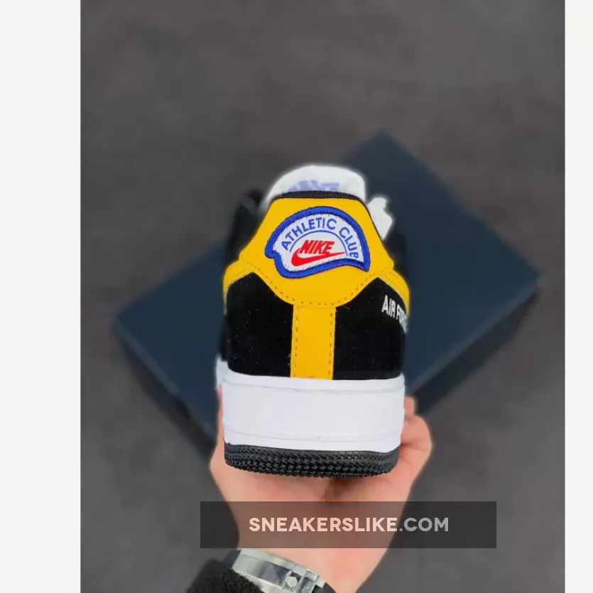 The Nike Air Force 1 Low joins the brand’s “Athletic Club” collection. Meet the Nike Air Force 1 Low Athletic Club Black Yellow.The base of this AF1’s upper is smooth leather in snowy white. The suede overlays on the toe cap, mudguard, eyestay panel, and foxing are pitch black, matching the laces. The standout details of this shoe are the signature profile Swooshes on both the medial and lateral sides in University Gold and the embroidered Air Force 1 text branding in white on the lateral heel. Nike Athletic Club branding in blue sits on the white tongue tab while a Nike Athletic Club patch with an embroidered blue outline contrasts with the University Gold heel tab.