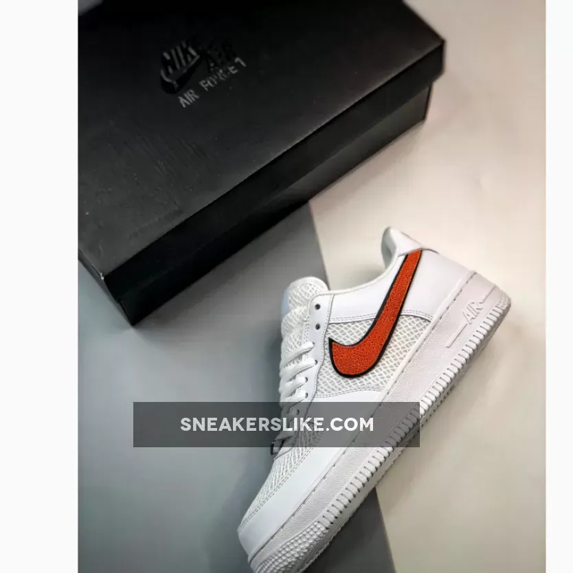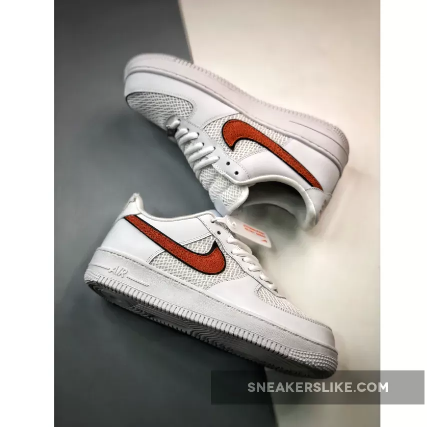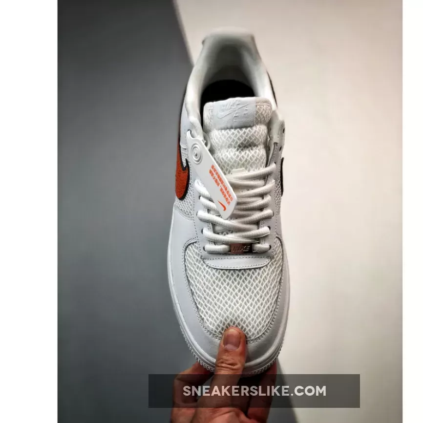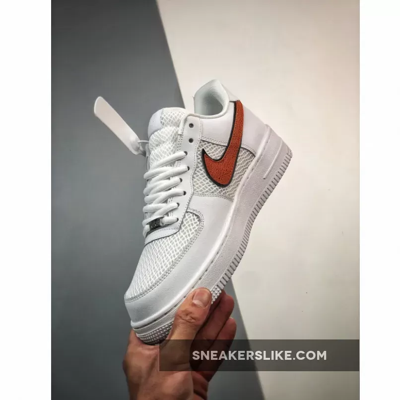 It’s rare to see a Nike Air Force 1 that departs from the usual all-leather upper. A newly released iteration that’s part of the Basketball Swoosh collection shakes things up. Get ready for the Nike Air Force 1 Low Basketball Swoosh. This AF1 has a net-like mesh base, a nod to its collection’s title. White leather overlays complement the base on the toe cap, eye stay panel and foxing. The stars of this shoe are the signature profile Swooshes on both the medial and lateral mid-panels with orange basketball-textured leather. The metallic silver lace deubrés that adorn the shoe swap out the AF1 branding with Nike text branding.