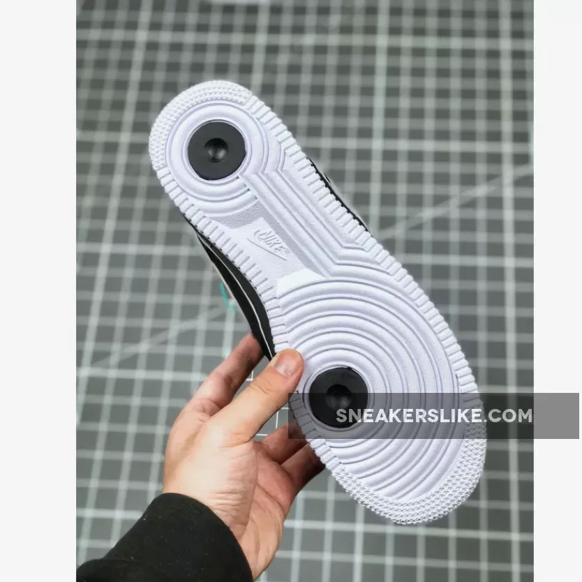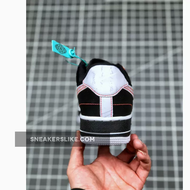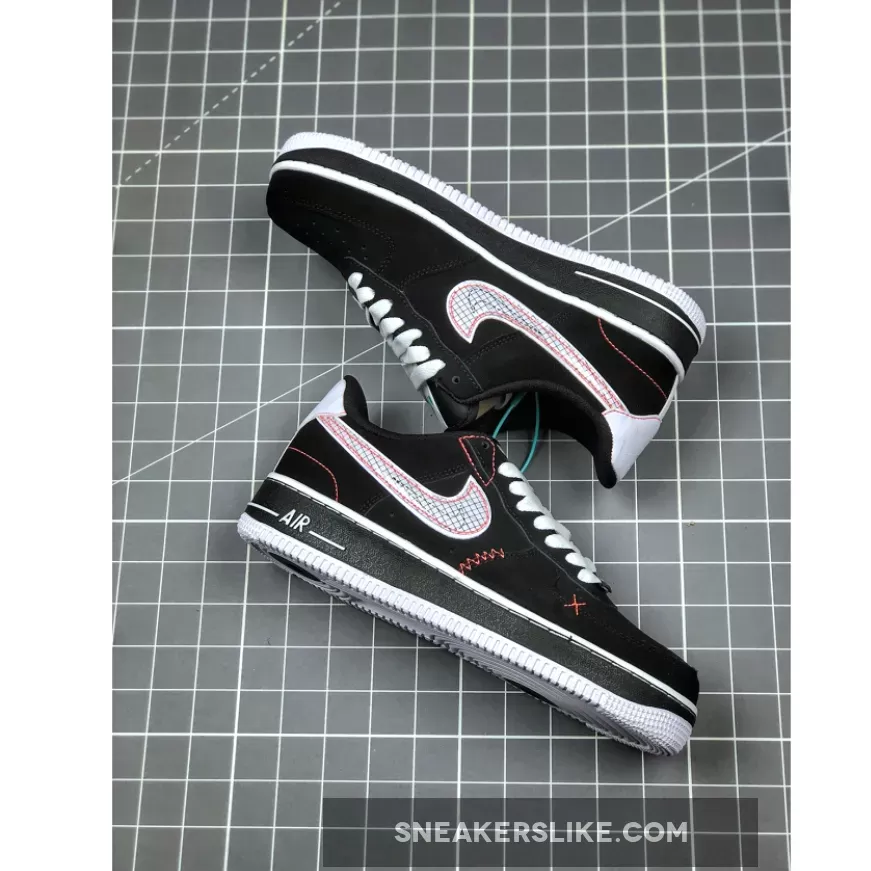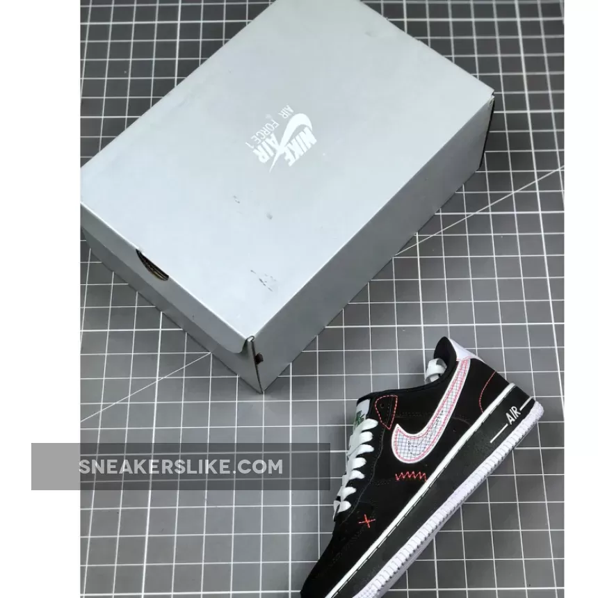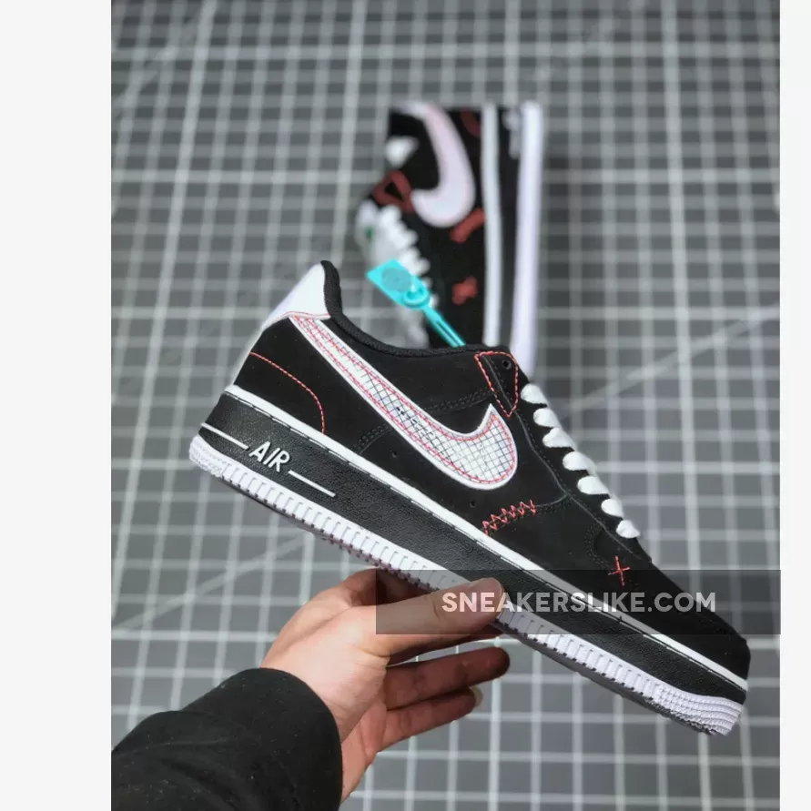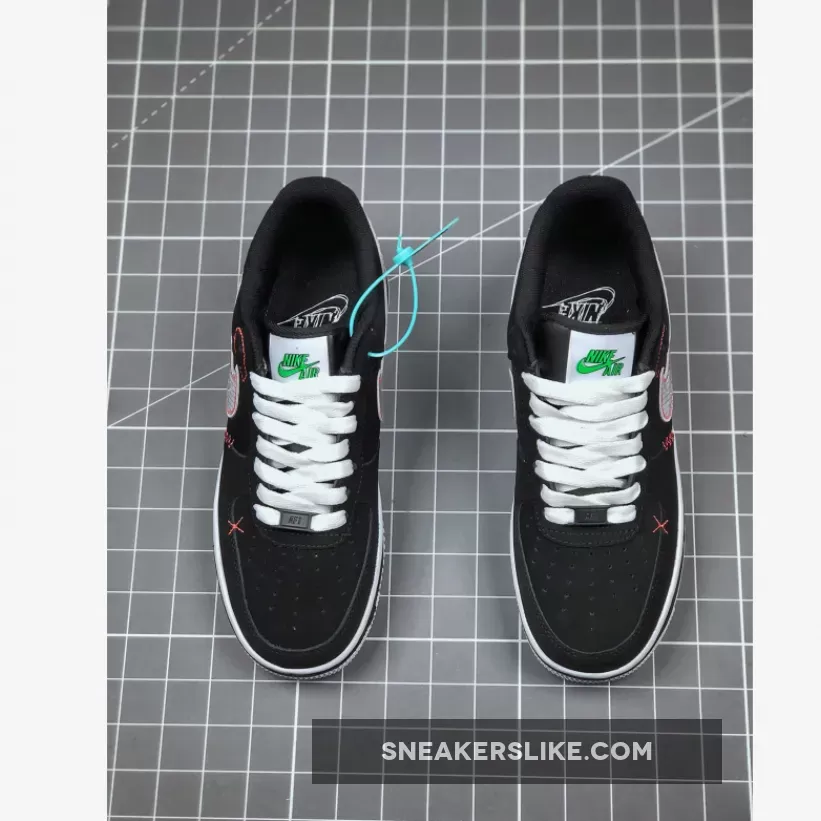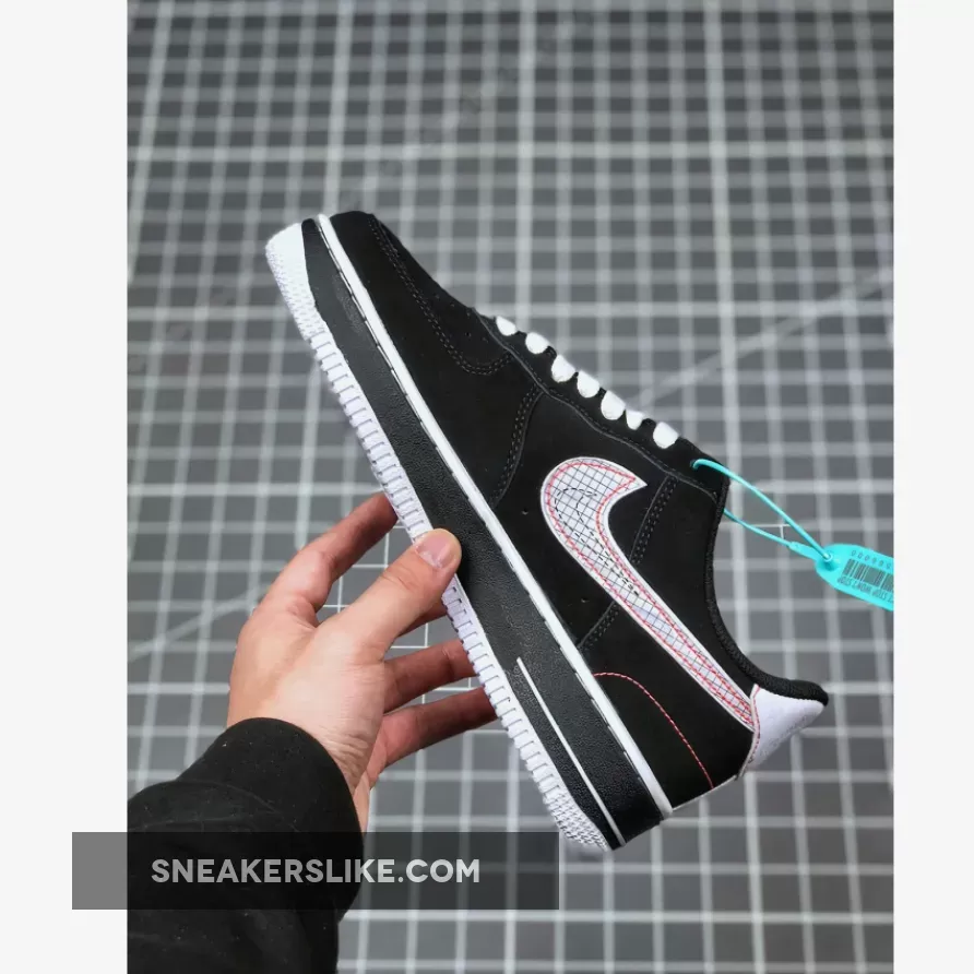 Starting at the top of the shoes, a woven “Nike Air” tab in “Green Strike” has been placed at the tongue, followed by clean white laces that cover the forefoot. Contrasting the shoe’s black leather base, bright red top-stitching outlines the gridded white Swoosh on the sidewalls, riding up towards the rear and tracing the edges of the heel counter and backstay. While these stitches follow the edges of certain panels, the shoe is detailed in other places as well, like the trapezoid at the upper eyelet, zig-zags at the mid-section and “X” mark at the toe box.