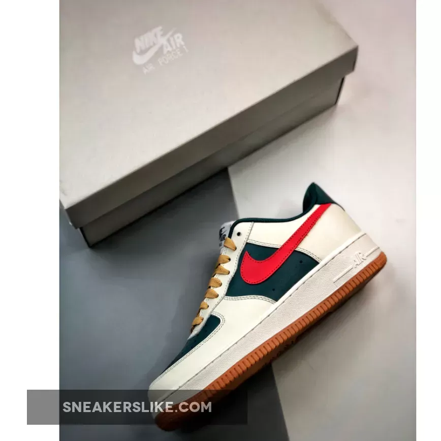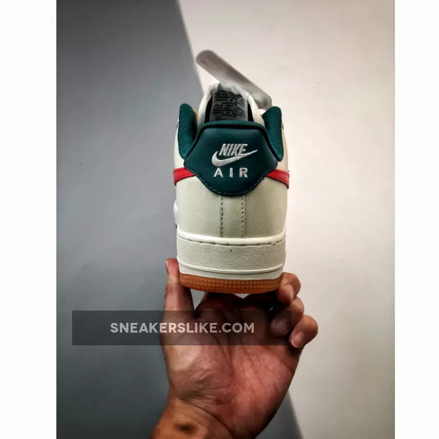 If you’re looking for the perfect pair of Air Force 1s to add to your sneaker shelves, then look no further. We’ve been spoilt for choice as the model celebrates its 40th anniversary this year, but one of our favourite pairs to join the line-up is the slightly Gucci-esque Nike Air Force 1 Low “Sail/Green/Red”. Arriving in super-clean tricolour colour blocking, this pair is a must-have, so let’s take a closer look at them. For a general release shoe, these sneakers really exude luxurious vibes. A deep green dresses the toe box, heel tab, liners and side panels, while creamy “Sail” overlays wrap their way around the rest of the uppers. From here, a bright red Swoosh shoots across the pairs sidewalls, while Nike Air branding hits arrive in black and cream.