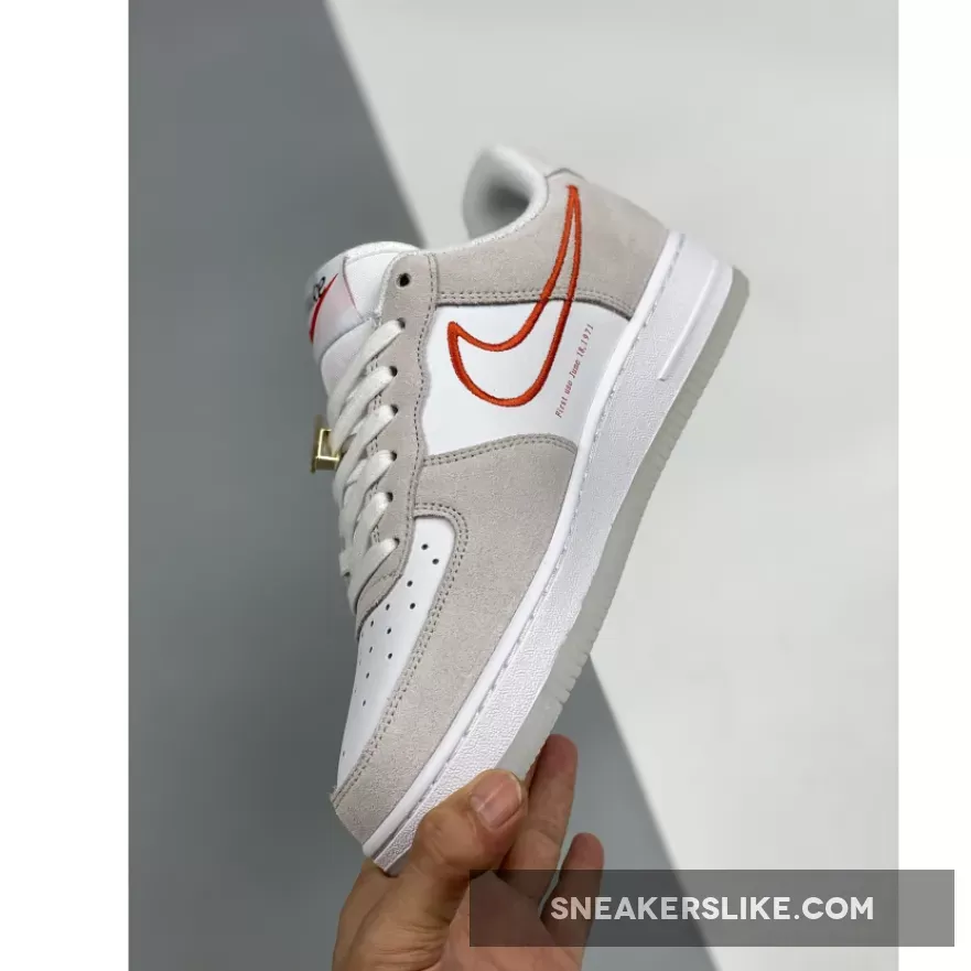 As new footwear models surface in the sneaker universe and archived silhouettes return to the shelves, Nike’s legendary Air Force 1 basketball shoes are here to stay. Seen here as part of the Swoosh brand’s “First Use” series, this rendition is done up with commemorative accents as a nod to the official day Nike’s iconic Swoosh was trademarked. Official images show this variant with a crisp white leather base for a clean look, then embraced with creamy shades of suede overlays around the toes, eyestays, and rear segment. The colour balance is elevated with a Swoosh logo on the lateral side filled in a vibrant orange tinge while the medial profile boasts only an outline shape of the logo. The themed design is then rounded off with insoles imprinted with the date the Swoosh was first used, “June 18, 1971”, and metallic gold Swoosh lace dubraes feature forefoot for a luxe finish.The Nike Air Force 1 Low First Use White Orange is an absolute must-cop for all Nike shoe collectors. Don’t forget to read out Air Force 1 size guide so you know how they fit and keep it locked in right here at Our Store Supplier for the latest Nike releases, teasers and news.