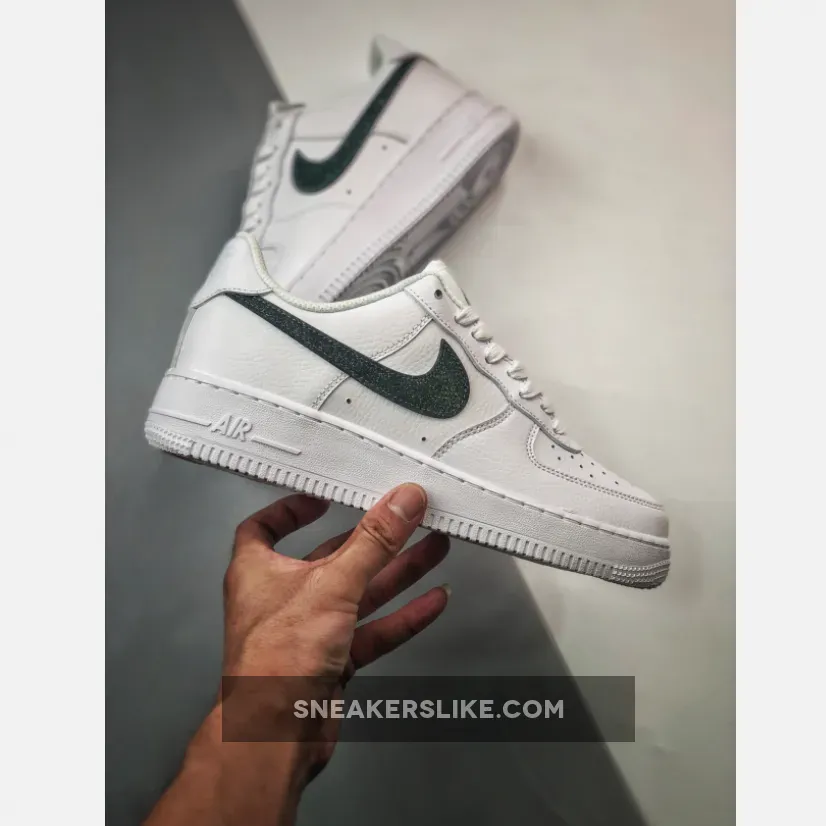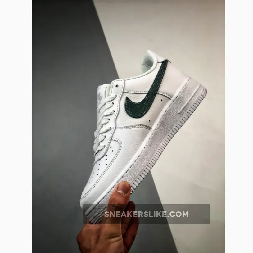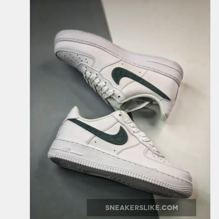 On the lookout for a white sneaker with a lot of pep? Say hi to the Nike Air Force 1 Low Glitter Swoosh Green White. This AF1 Low has a clean and simple design that’s anything but humdrum. It starts with a triple white colourway, with both the leather base and overlays creating a colourless look. This immaculate backdrop is highlighted with the sparkly Nike Swoosh that’s coated with a muted green glitter finish. Wearing these shoes, you’ll sparkle all day.