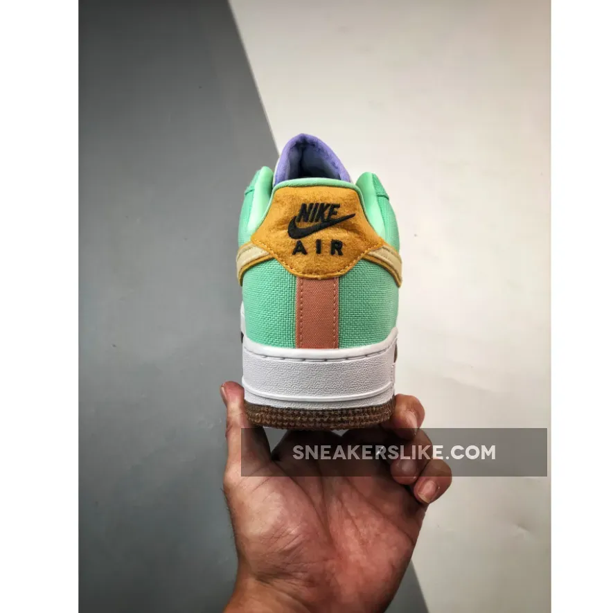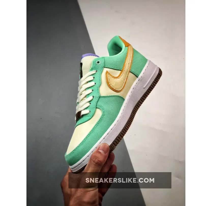 This “Happy Pineapple” offering of the Nike Air Force 1 comes dressed in a Green Glow, Coconut Milk, and Metallic Gold color scheme. The shoe features a canvas and textile weave upper with dual-layered Swooshes and the “Happy Pineapple” logo on the tongues.