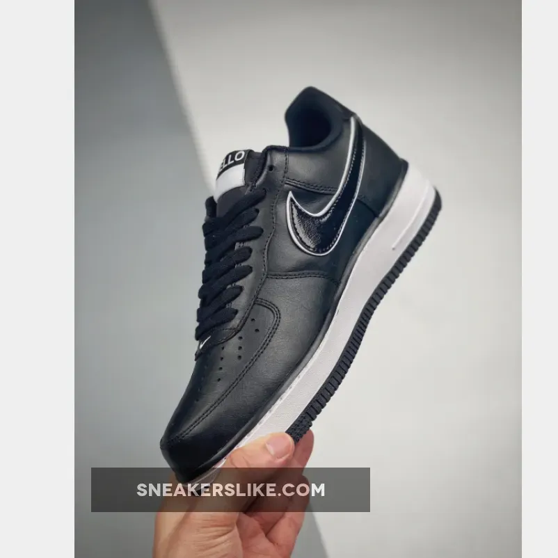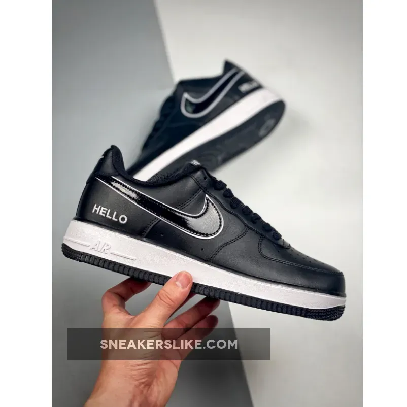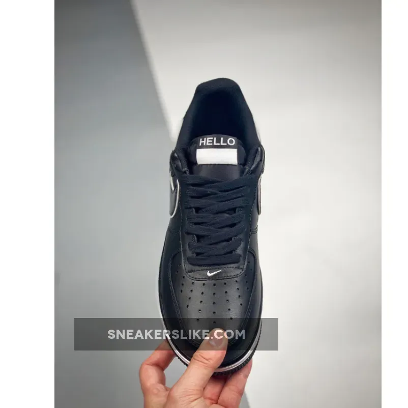 Dressed in a Black and White color scheme. This Nike Air Force 1 features a Black leather upper with White outline around the Swoosh logos and “Hello” embroidered on the heels.