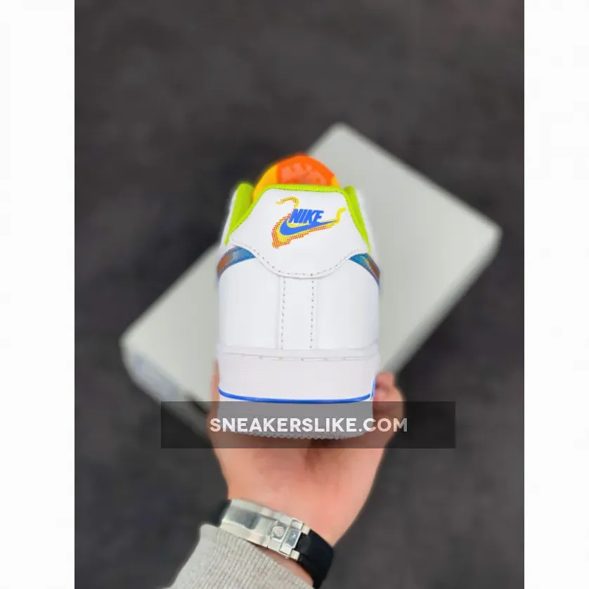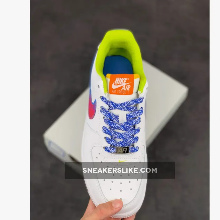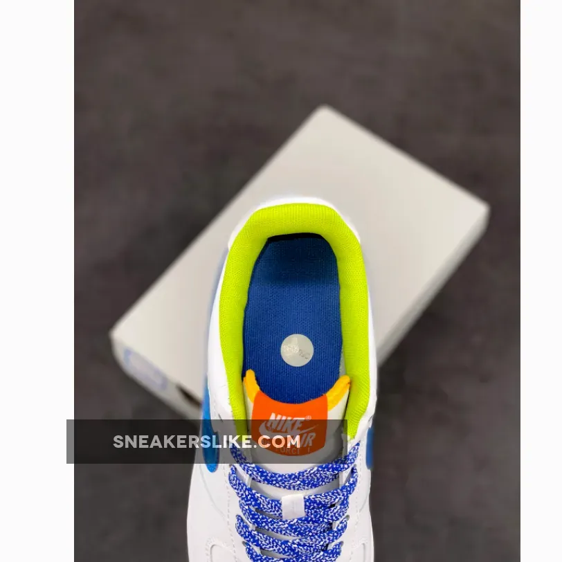 Starting off with a pristine smooth white leather construction all throughout the upper, this Nike Air Force 1 Low is then hit with various punches of color which include a bright green inner liner, blue and white laces, orange tongue tags, and blue Nike branding on the heels.
