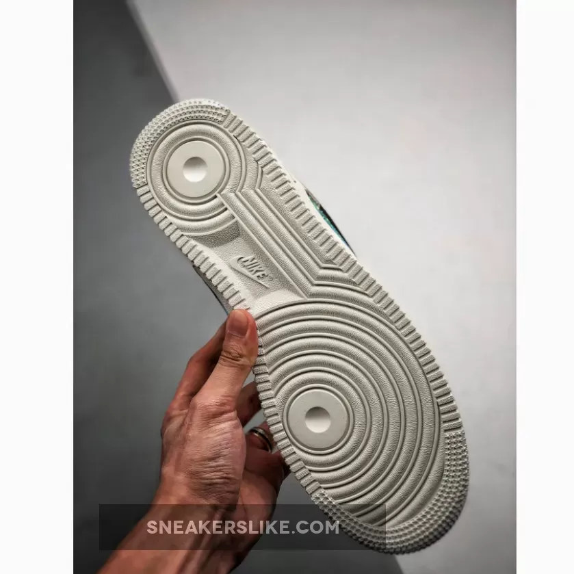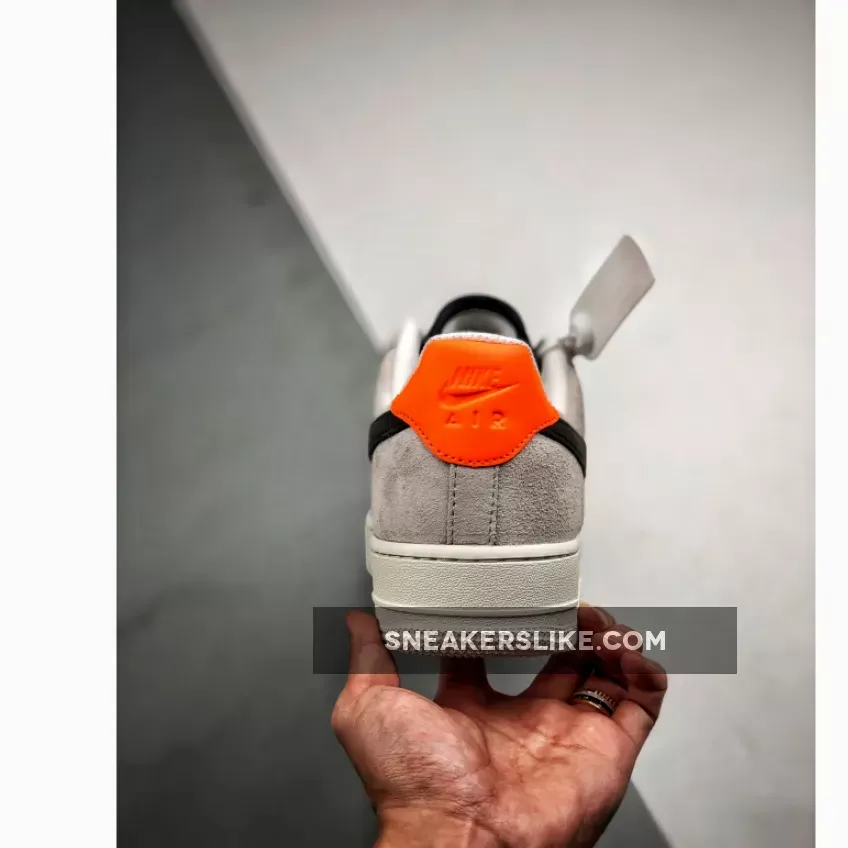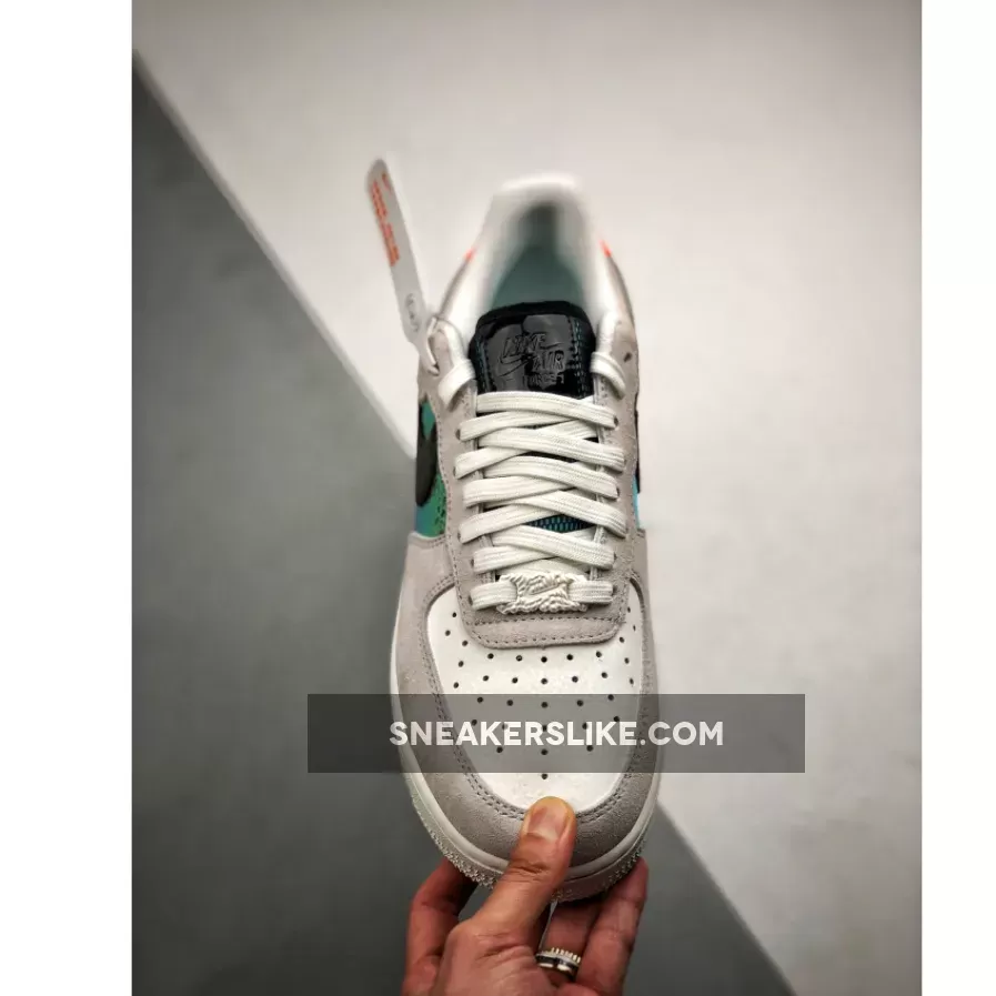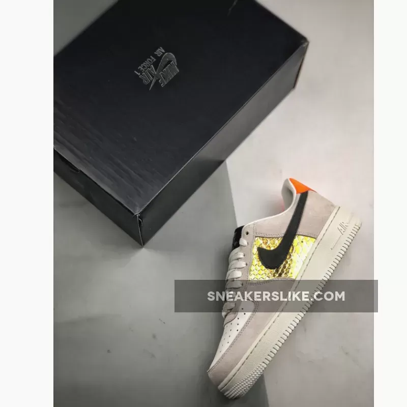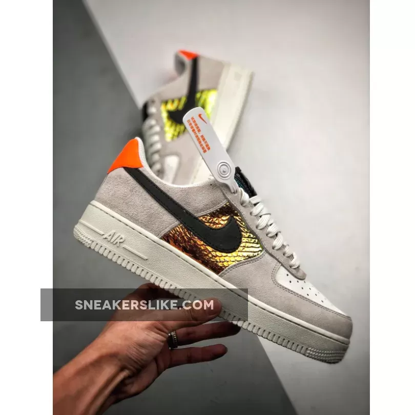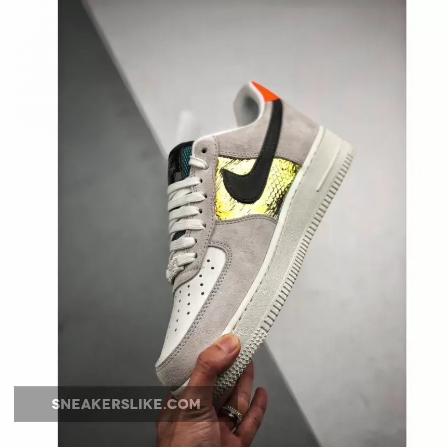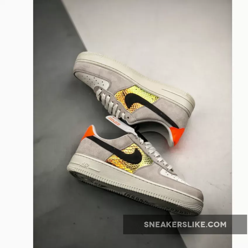 Dressed in a Light Bone, Sail, Hyper Crimson, and Black color scheme. This Nike Air Force 1 features a White leather toe, Grey suede overlays, Black suede Swooshes and mesh tongues with vibrant Orange heel overlays. Highlighting the shoe is its iridescent snakeskin side panels completed with Aqua insoles atop a Sail rubber sole.