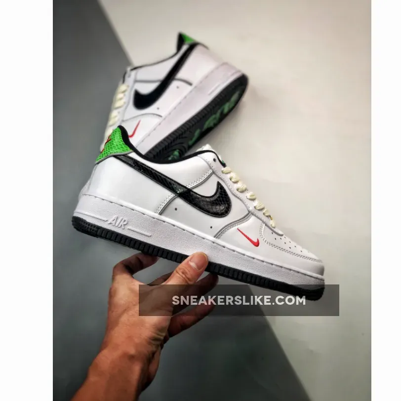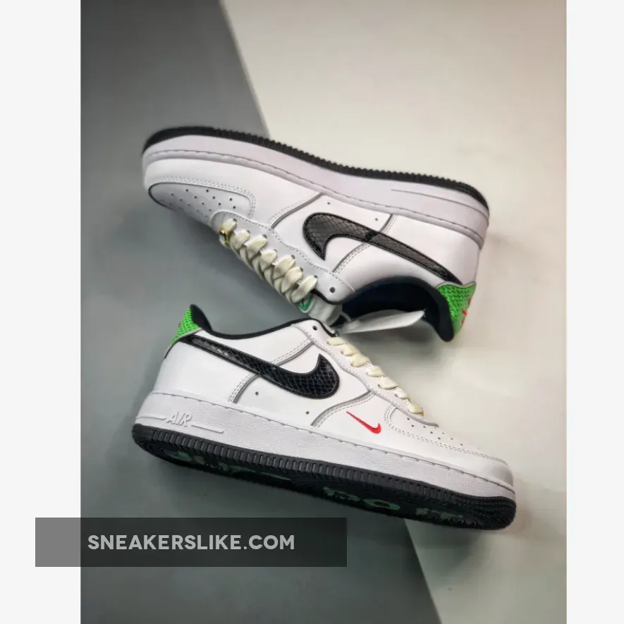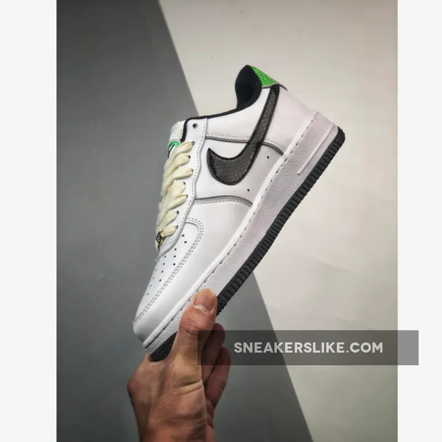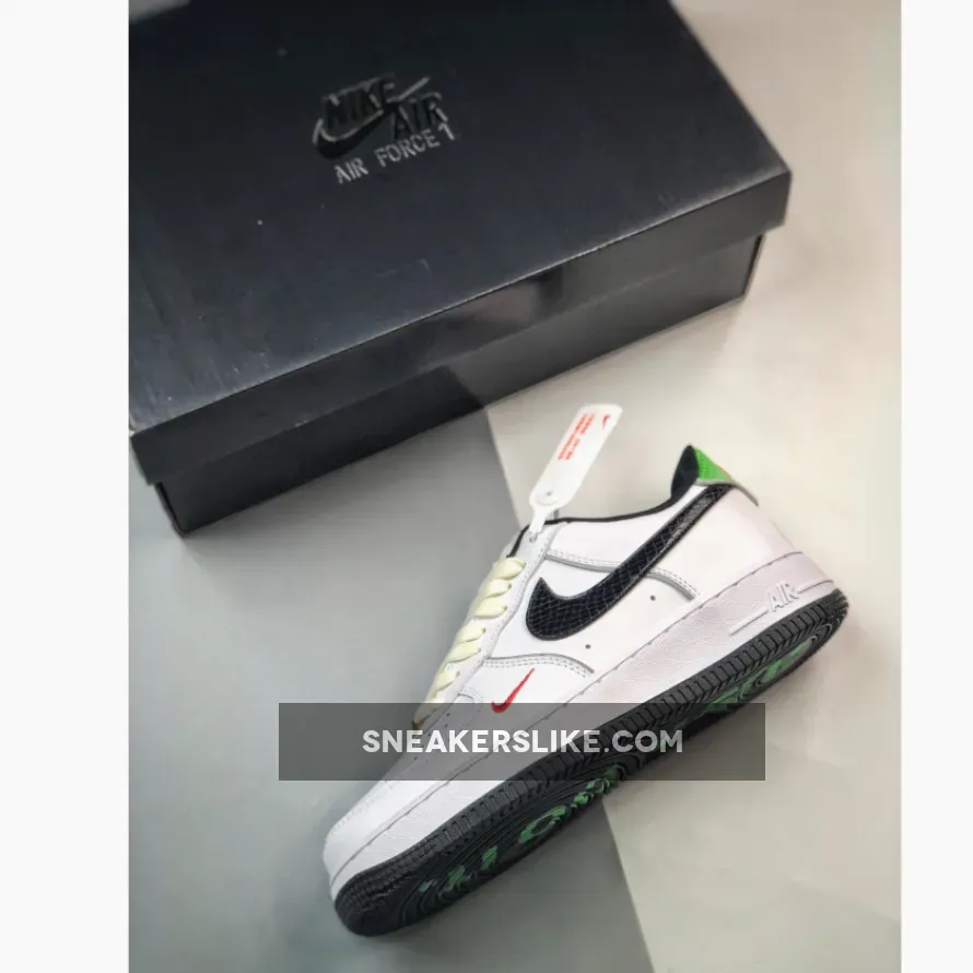 This Nike Air Force 1 Low comes with White leather on the base while jersey mesh adorns the tongue. Next, we have Black and Green snakeskin on the Swoosh logo and heel, while jewel lace jewels are intact.