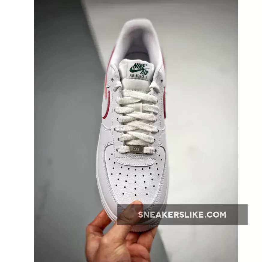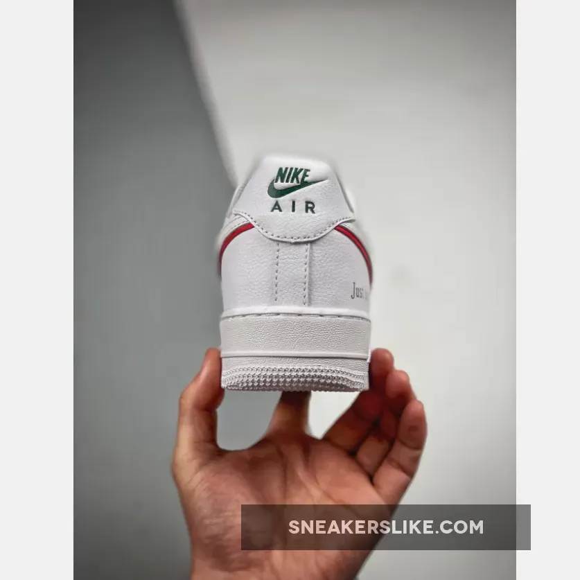 Clad in its signature white leather, the pair presents with other staple finishes like white nylon tongues, all-white sole units, and pure white liners. It’s jazzed-up by the titular slogan emblazoned on the lateral heel, as well as dual-layered red and white Swooshes, and deep green branding hits at the tongue, insole, and heel. The design is then completed by a special iridescent AF-1 branded dubrae.