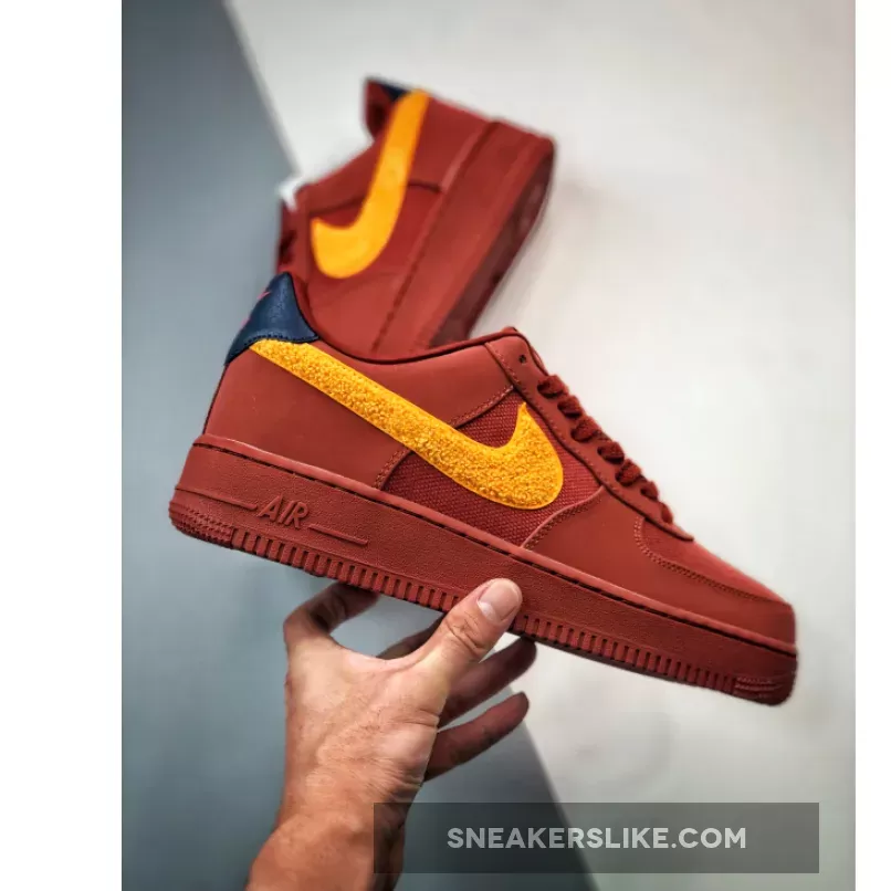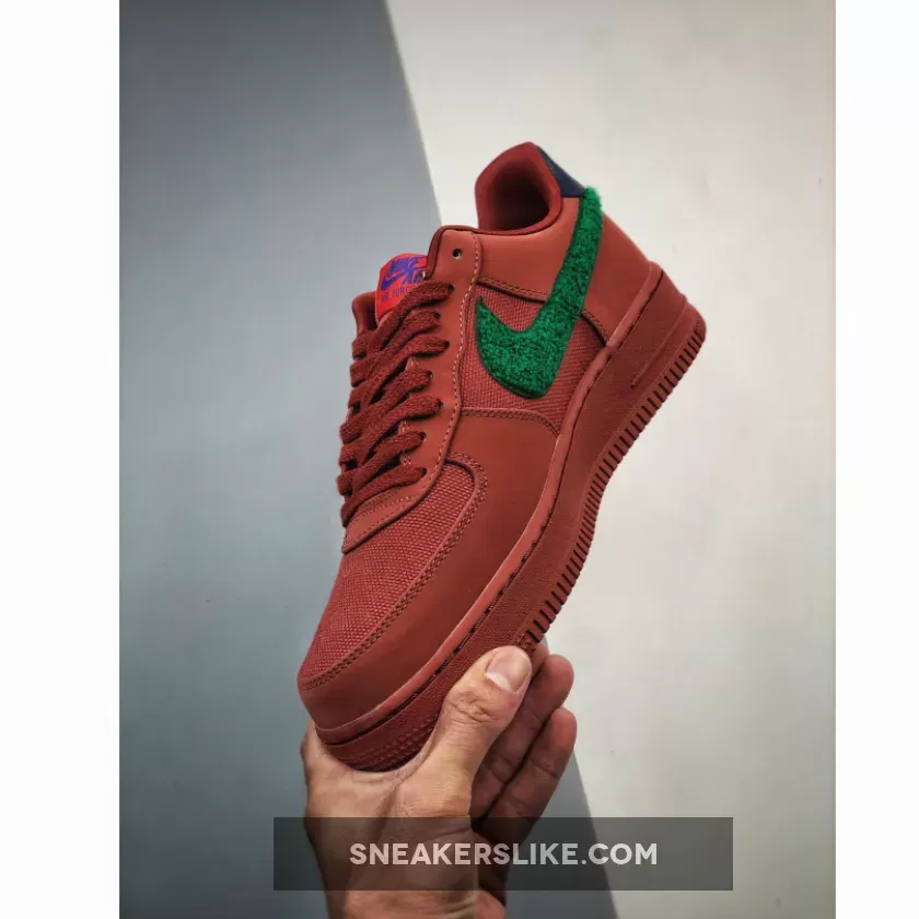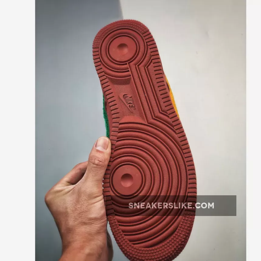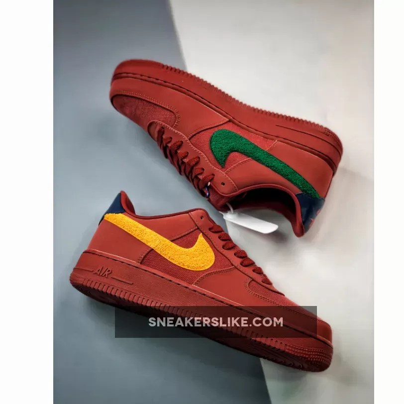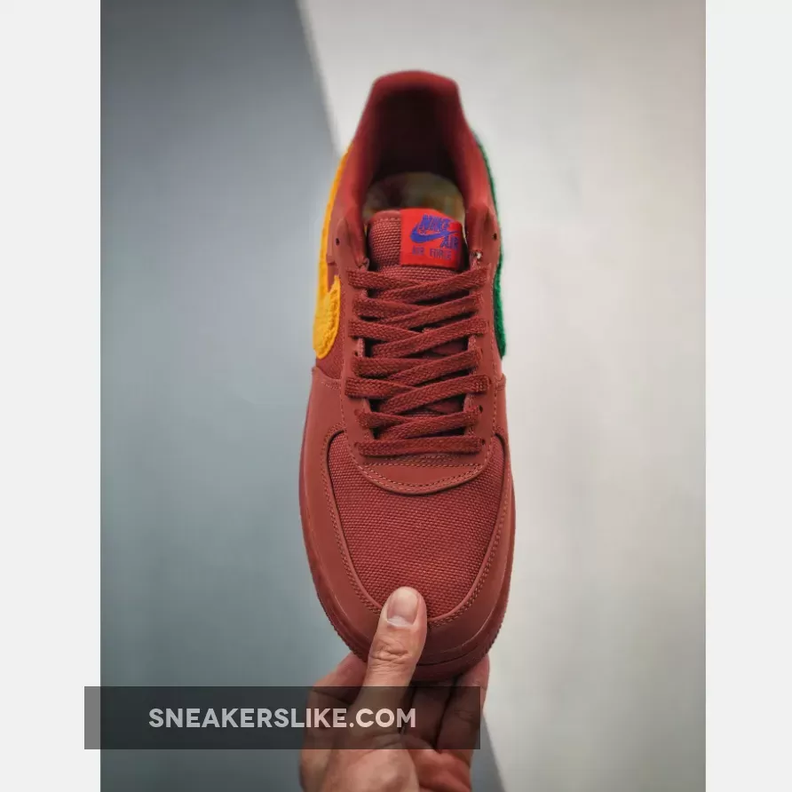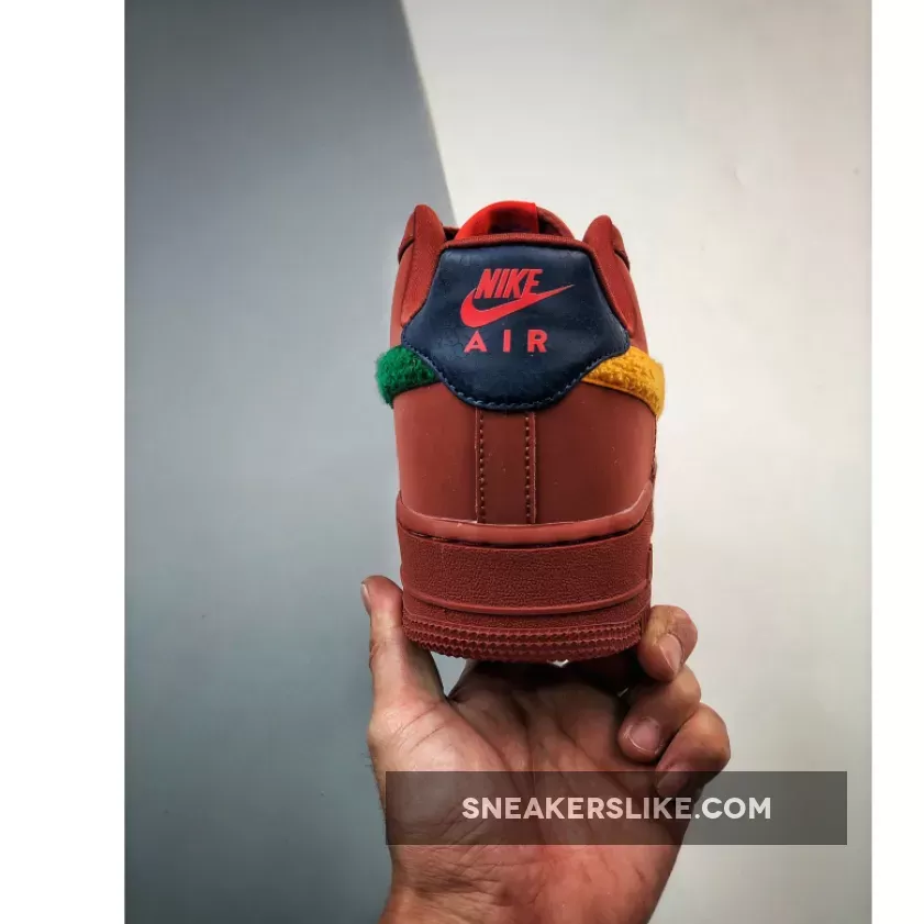 This AF1 has a deep clay brown upper, canvas for the base and suede for the overlays on the toe box, the eye stay panel and the foxing. Cosily furry chenille signature profile Swooshes in golden yellow stand out on the lateral mid-panels. This same material is used for the Swooshes on the medial side but in bright leaf green. The cracked leather heel tabs are in dark indigo blue creating a contrast with the red Nike branding. The mismatched tongue tabs feature traditional Nike Air branding in blue against a red background on the right shoe while the left shoe is adorned by the “We Are Familia” colourful logo with an embroidered blue border.