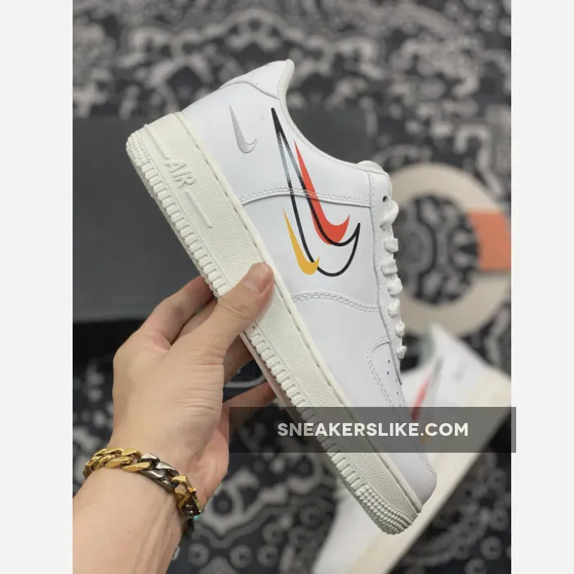 Are you looking for a pair of trainers that’ll turn people’s head anywhere you go? Then look no further as the Nike Air Force 1 Low Multi Swoosh White is everything you’ve dreamt of. Not only are we talking about Nike’s legendary basketball trainers that have remained a relevant style since 1982, but this new colourway also will absolutely look good in your collection. Working on a low-cut construction that sees a crisp white leather build, prominent features of the Air Force 1 that Bruce Kilgore put in place remain to stick to its OG design.The side panels, usually flaunting a one-piece Swoosh logo, is withdrawn in favour of multiple Swoosh logos all in different colours and sizes. In addition to that, a mini Grey Swoosh logo is also embroidered on the lateral heels, delivering a high-profile look to the arrangement. Also, use our Air Force 1 size guide so you know how they fit.