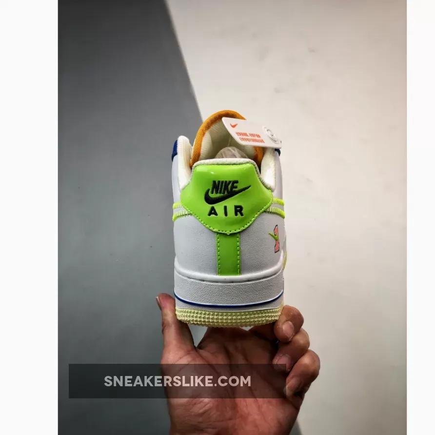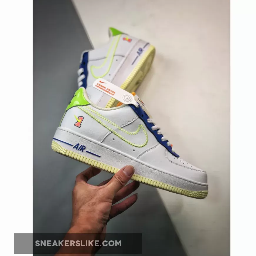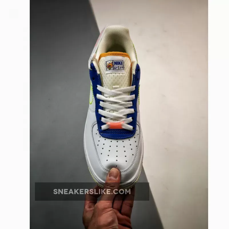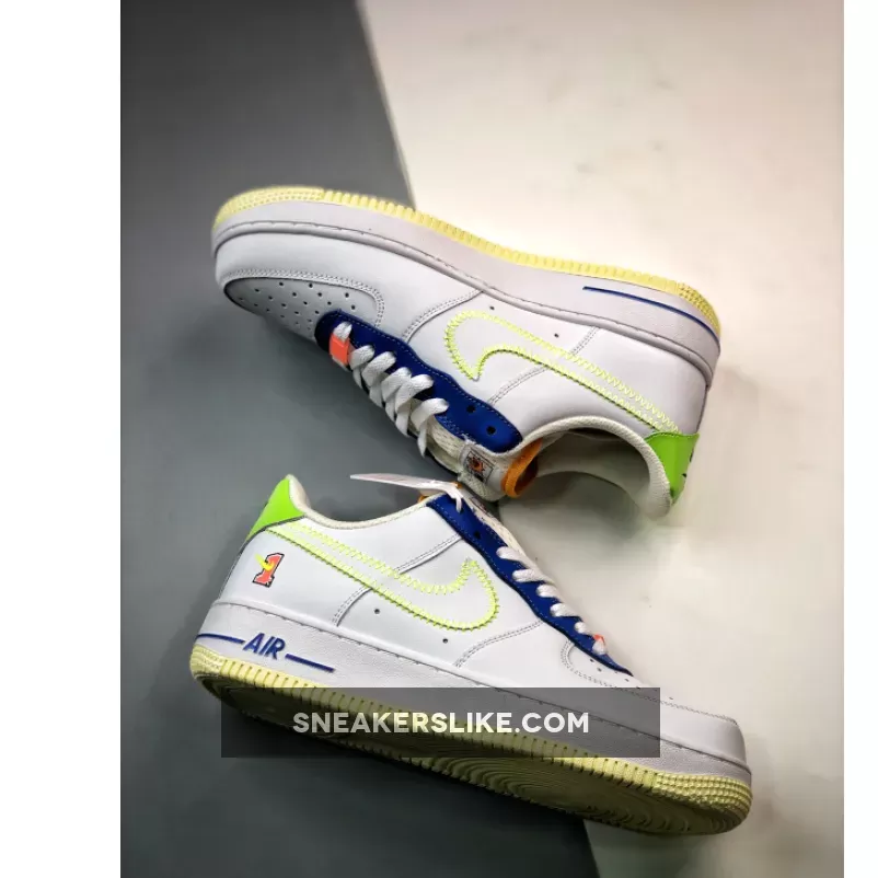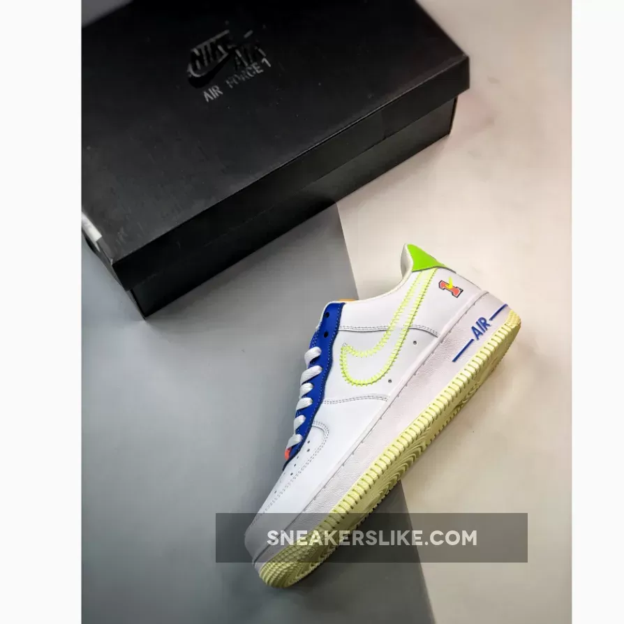 Nike’s first-ever basketball shoe that featured Air technology and revolutionised sneaker culture, the Nike Air Force 1, brand-new smaller-sized release that’s inspired by the online gaming world. Presenting the Nike Air Force 1 Low GS Player One White Blue.This AF1 has a clean and “colourless” smooth white leather upper, from heel to toe and base to overlays, creating a pristine backdrop for all the colourful, vibrant accents. Pops of Royal Blue come in the form of the Nike text branding on the tongue tab and the eye stay panel. The white signature profile Swooshes on both sides of the shoe feature neon Volt-coloured exposed stitching. The heel tab follows suit, featuring black Nike Air branding that matches the spine accent. The “Number 1” graphic on the lateral heel matches the salmon pink lace deubrés.