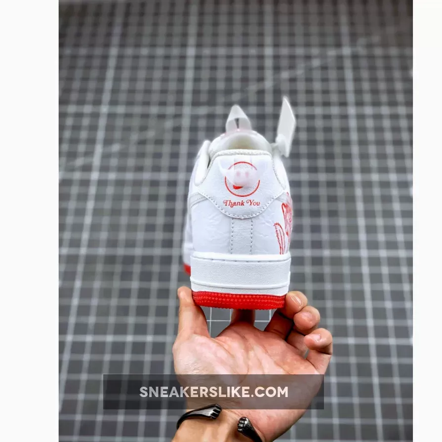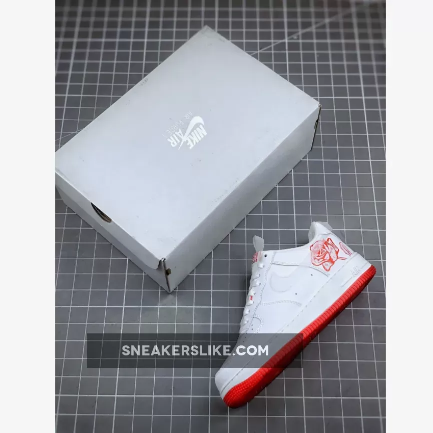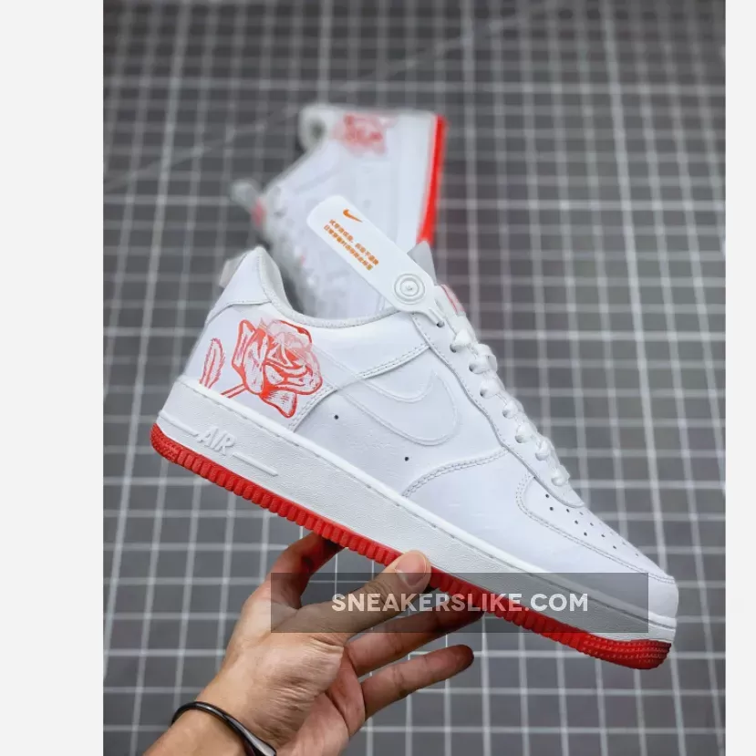 Dressed in a White and University Red color scheme. This Nike Air Force 1 Low features a White leather base with a large rose appearing on the lateral heel underneath its transparent Swooshes.