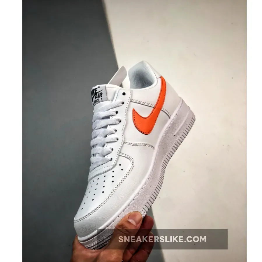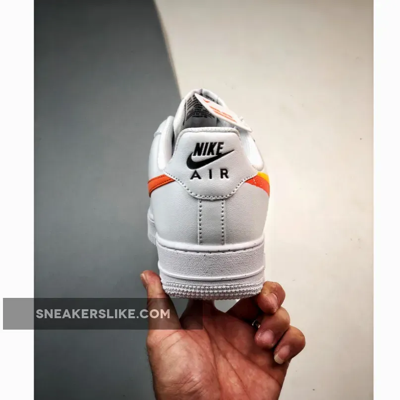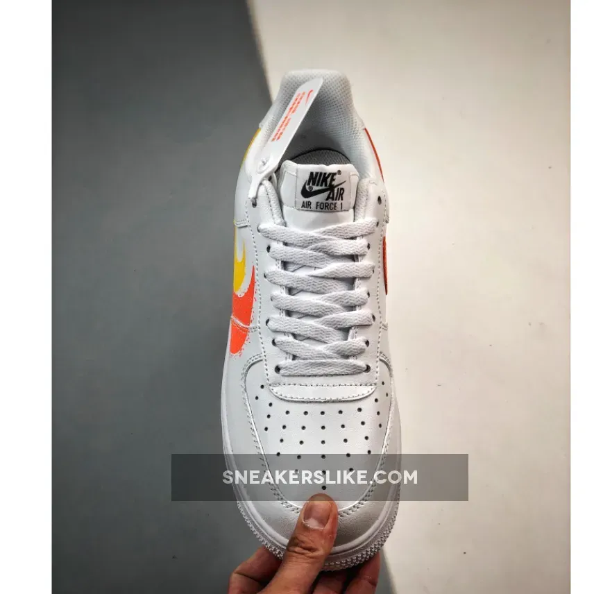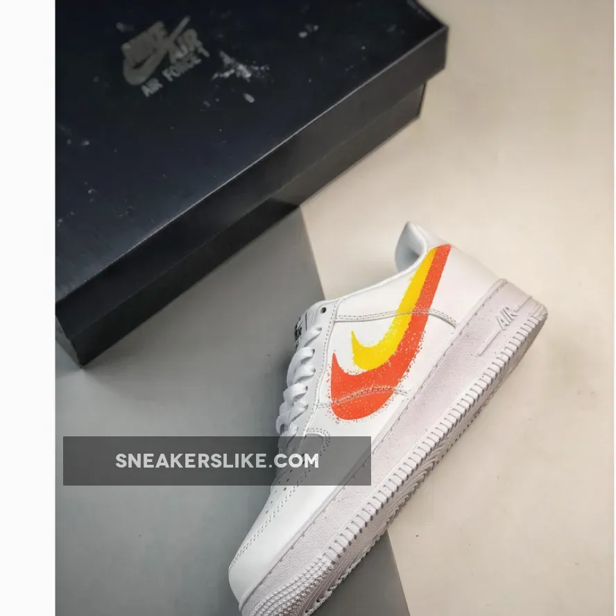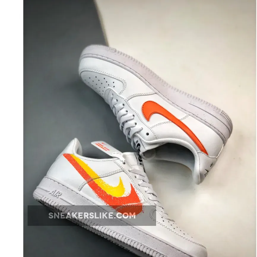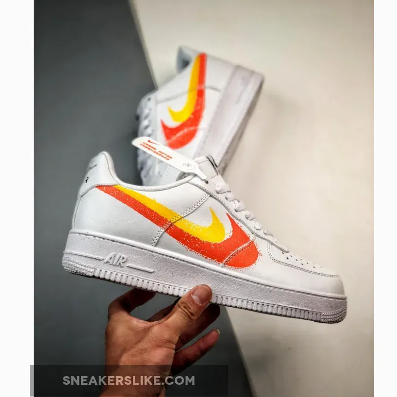 Nike’s basketball sneaker that first used Air technology, the Air Force 1, has a funky new version with street graffiti touch. Take a closer look at the Nike Air Force 1 Low Spray Paint Swoosh White. This low-top AF1 double spray painted Swooshes, the lower one in orange and the upper one in yellow, streaking across the smooth white leather medial and lateral mid-panels. Signature Nike Air branding in black on the tongue tabs, the heel tabs and the insoles create contrast against the all-white background. The nylon tongues and mesh sock liners are all pure white as well.