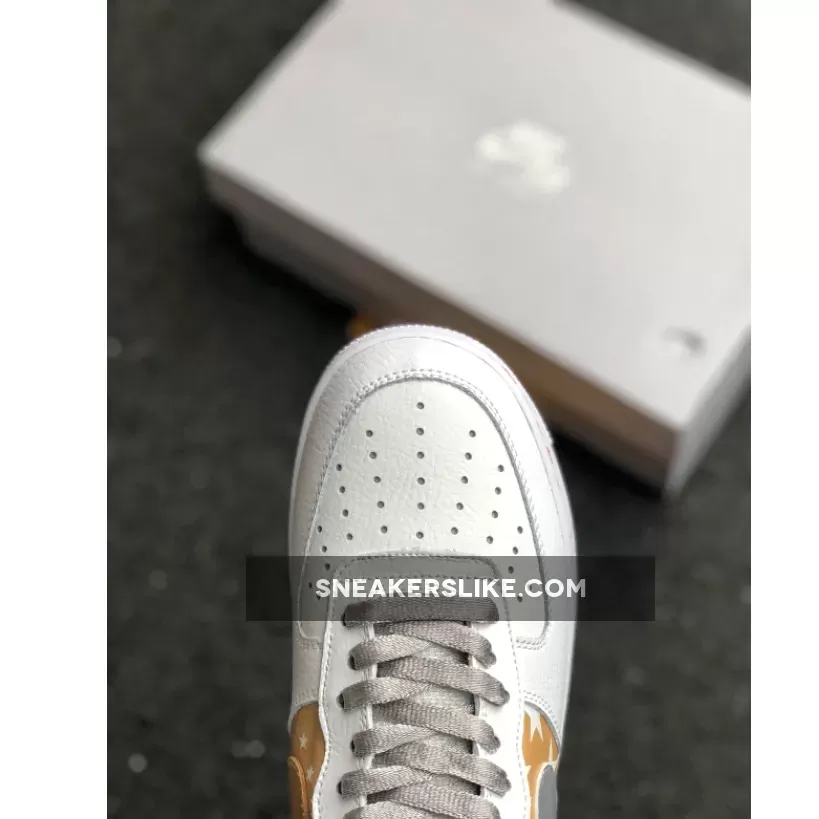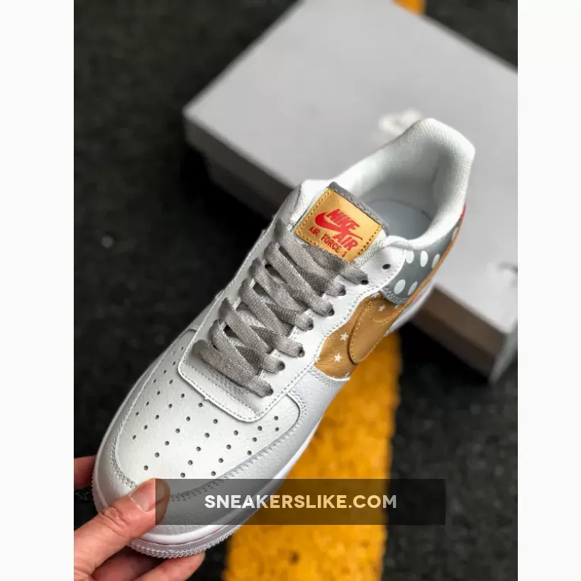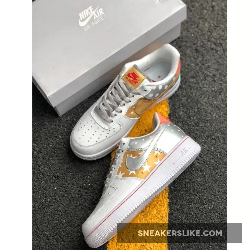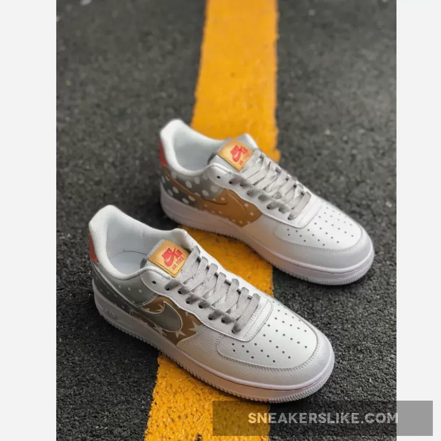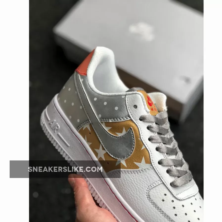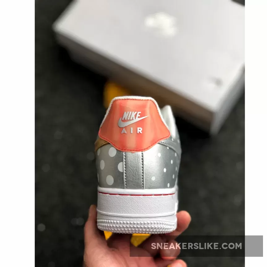 the pair shows off a mostly reserved palette with unassuming tans and oranges sitting at both edges of the more standout silver metallic plastered along the heel wrap and swoosh. These, which bear an almost foil-like texture, are emblazoned with polka dots throughout, lying adjacent to a similarly fashioned graphic with stars in replacement. Stitching along the foxing match the aforementioned warm tone while not taking on the same holographic finish that houses the inner Nike Air logo.