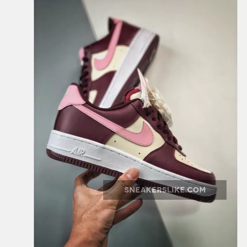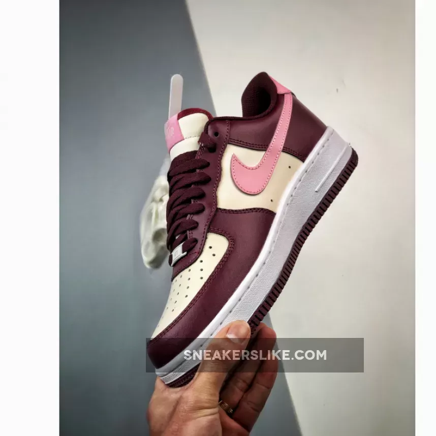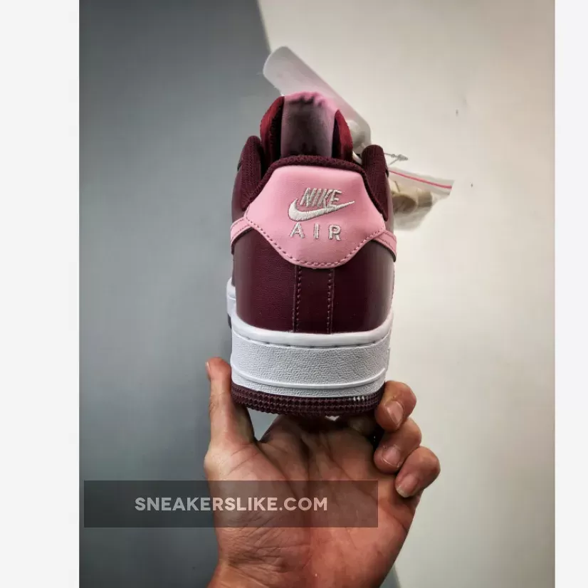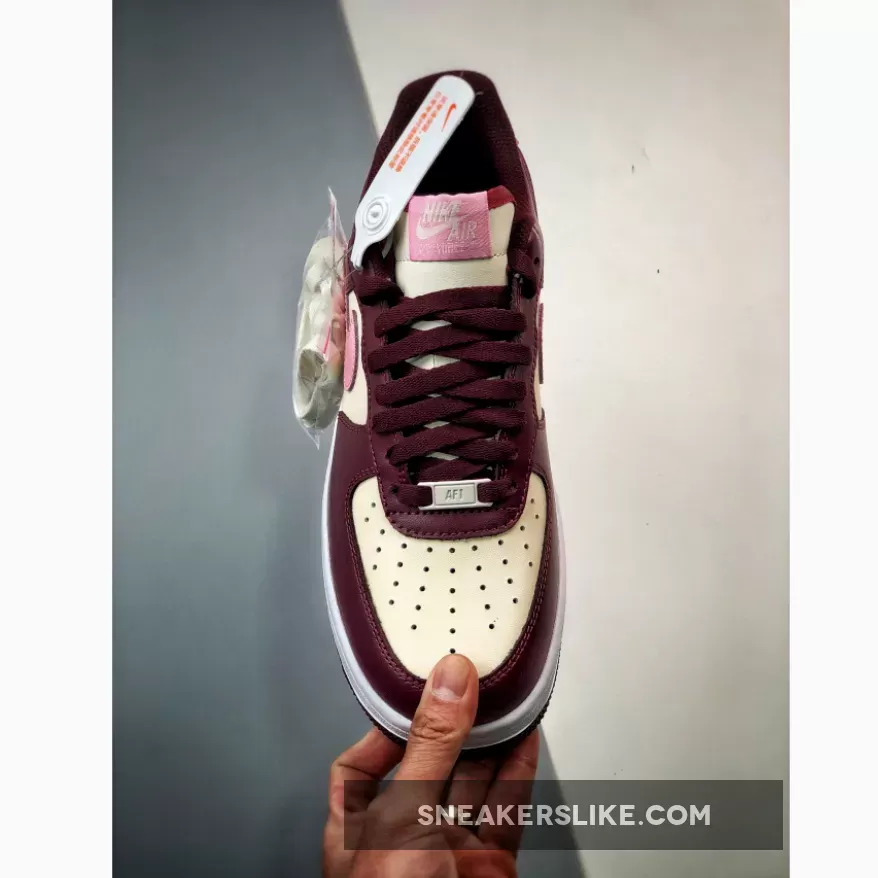 Nike’s classic forty-one-year-old Bruce Kilgore-designed basketball silhouette, the Air Force 1, joins the brand’s Valentine’s Day capsule. Take a closer look at the Nike Air Force 1 Low Valentine’s Day Maroon. This low-top AF1 takes a more subtle approach to Valentine’s Day, dropping any hint of hearts. The base is a smooth and creamy Sail-coloured leather showing on the toe box and the mid-panels. The overlays on the toe cap, the mudguard, the eye stay panel and the foxing are in dark Night Maroon.