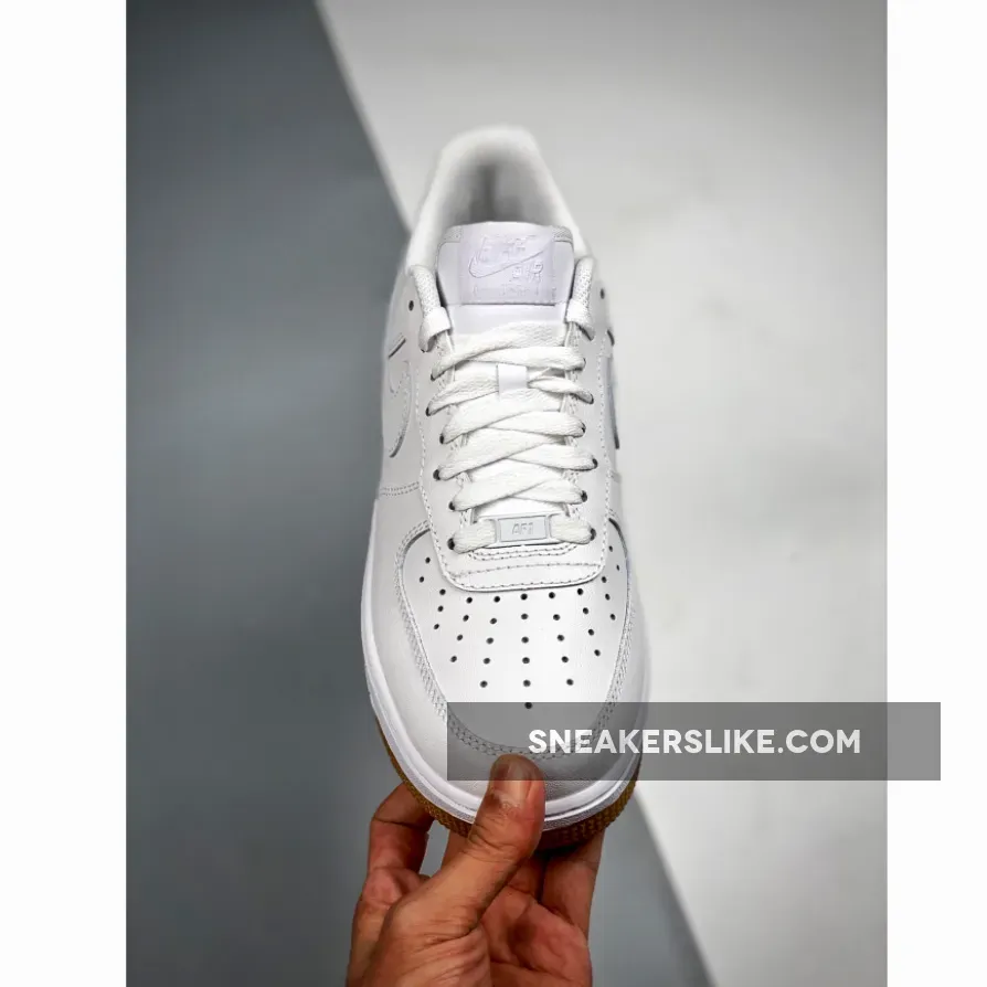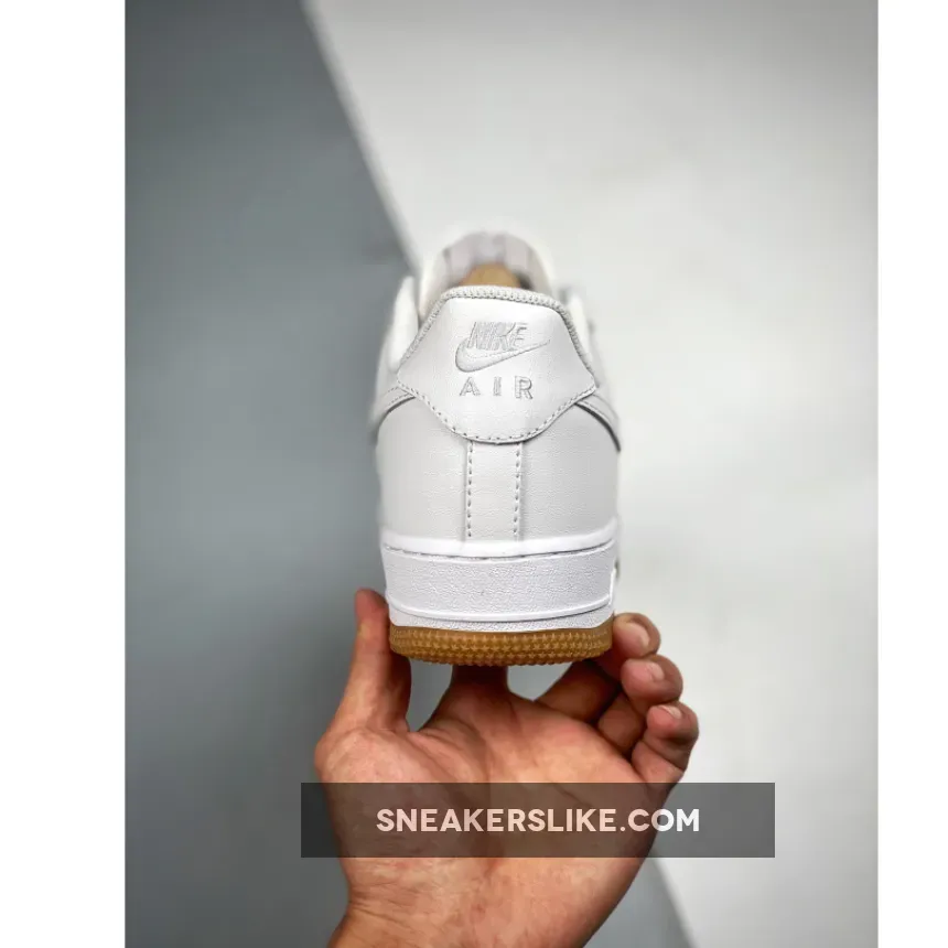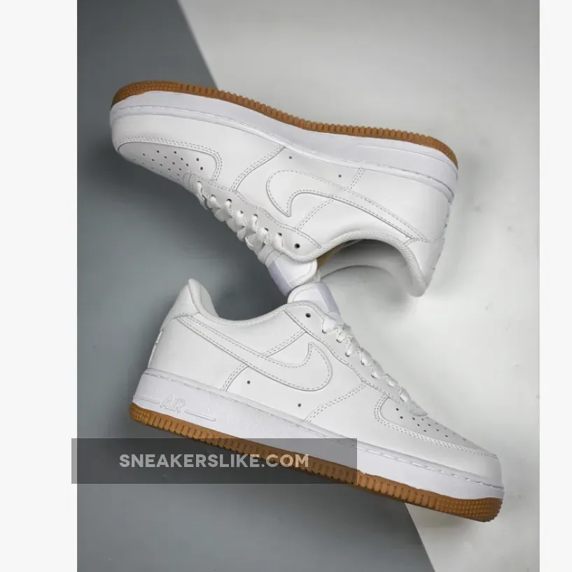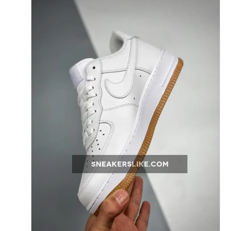 The Nike Air Force 1 Low White Gum is a reworked version of the classic Nike Air Force 1 Low. Like the classic Nike Air Force 1 Low, this shoe has a white upper made out of tumbled leather with white laces, Nike swooshes, and tongues.