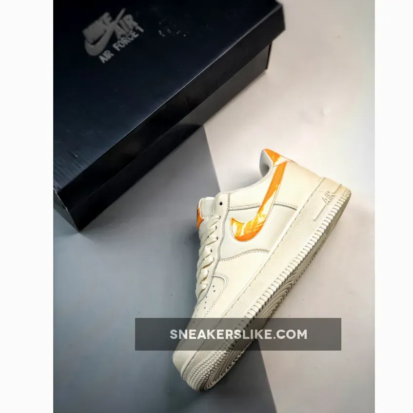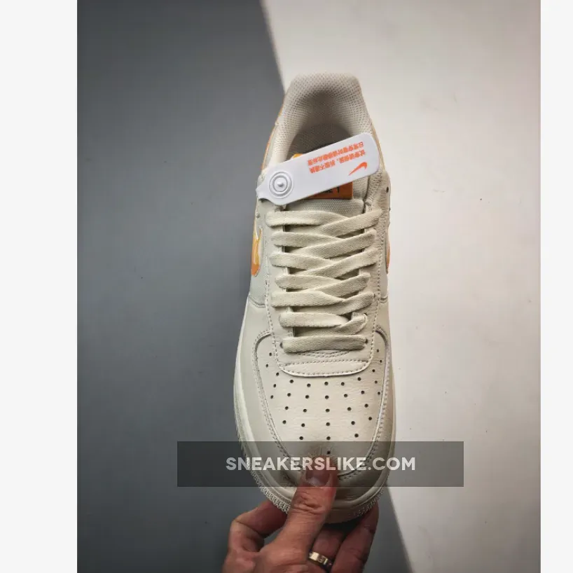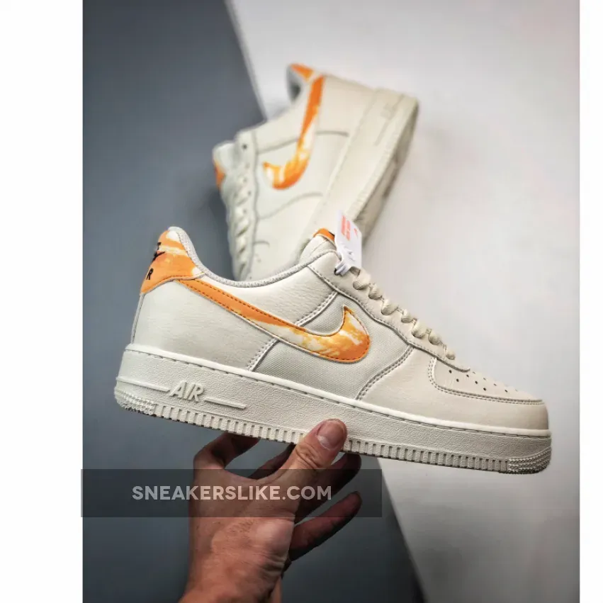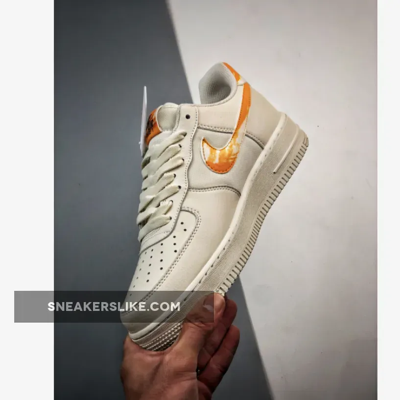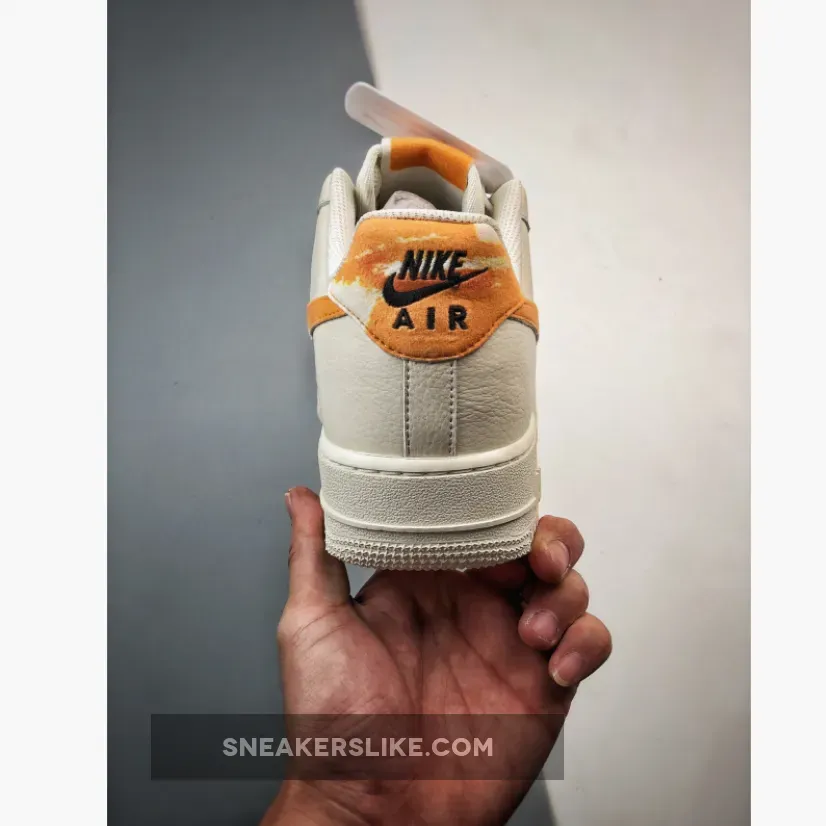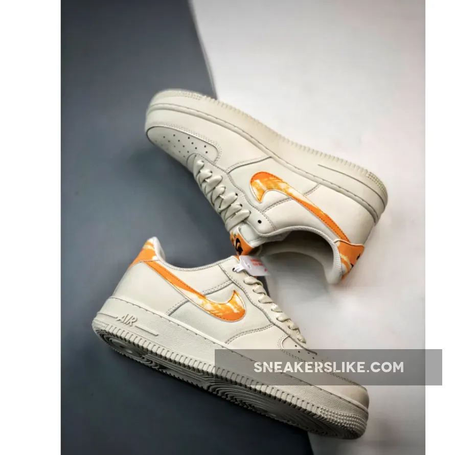 this Nike Air Force 1 Low features Sail across the upper while constructed with leather and mesh. Next, Orange streaks adorn the Swoosh logos, tongue labels, heels, and insoles. Black fills in the Nike branding on the tongue, heel tabs, and insoles.
