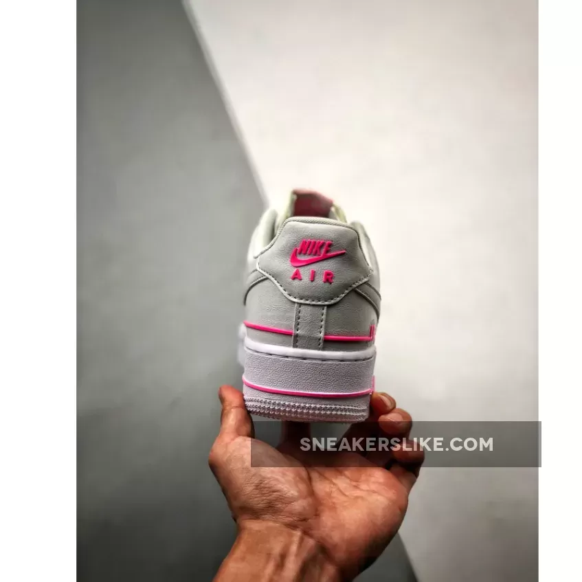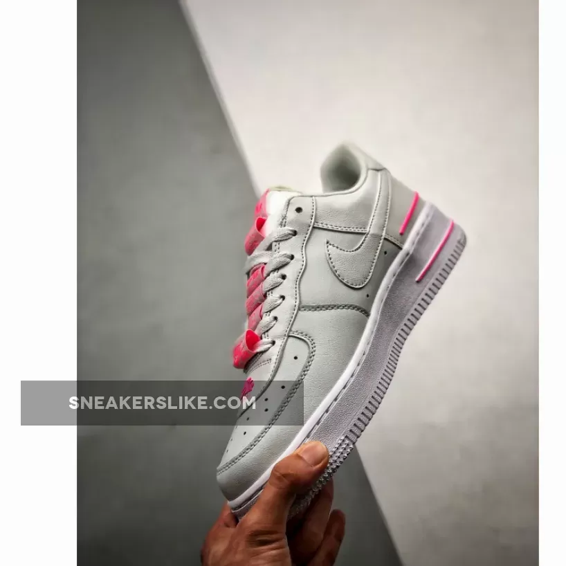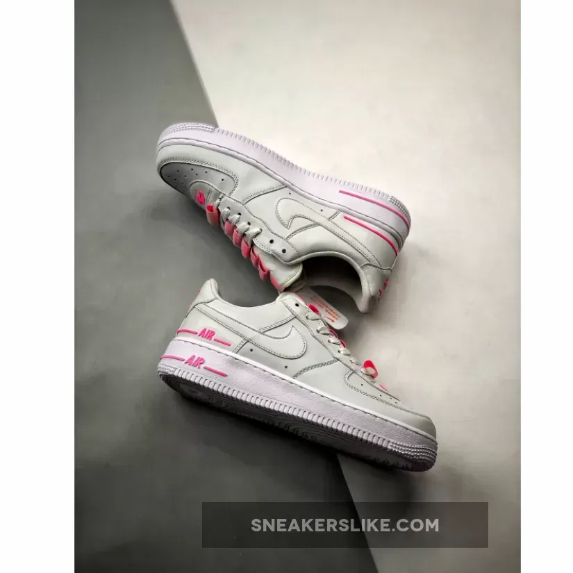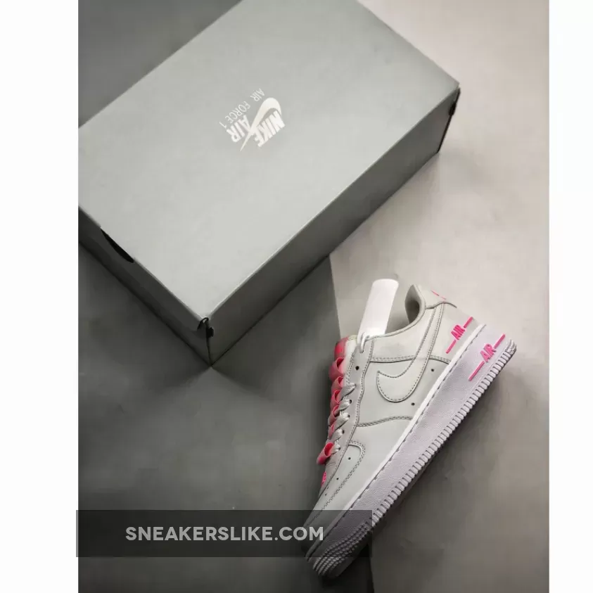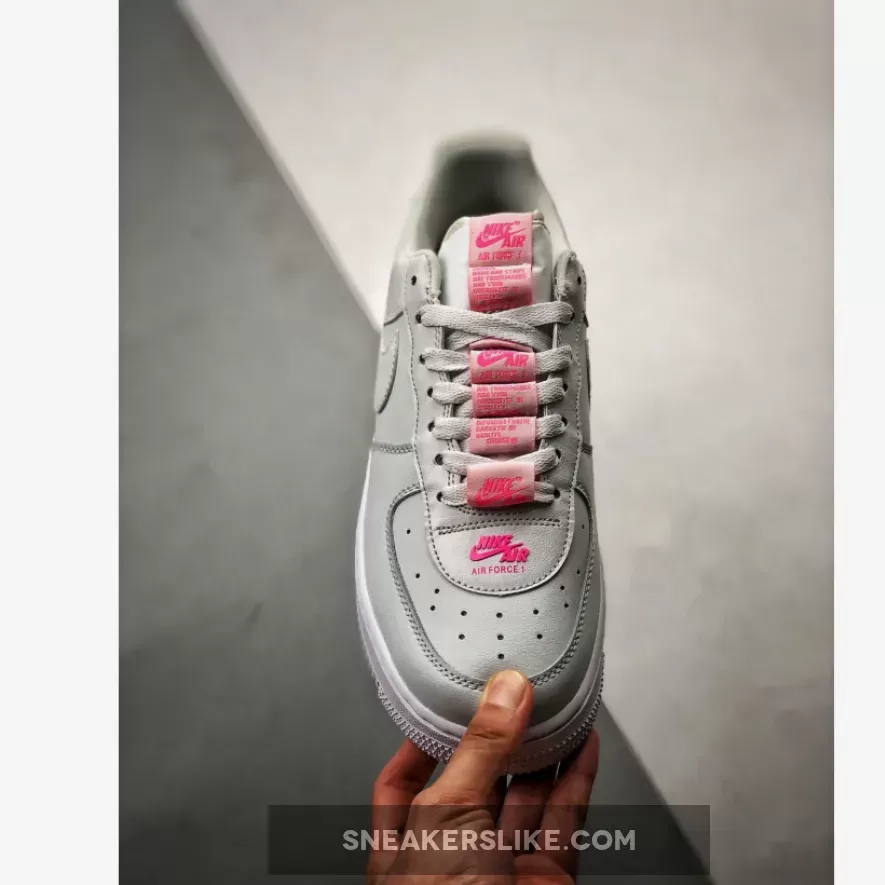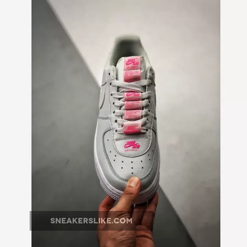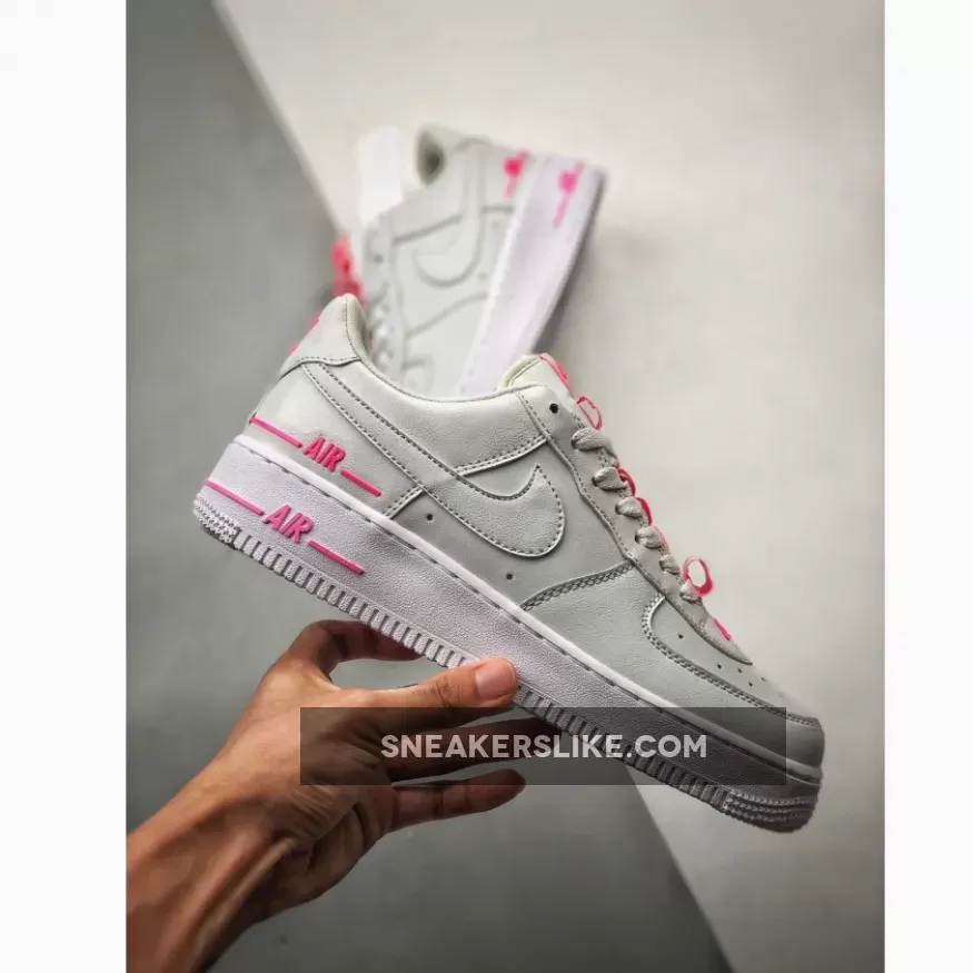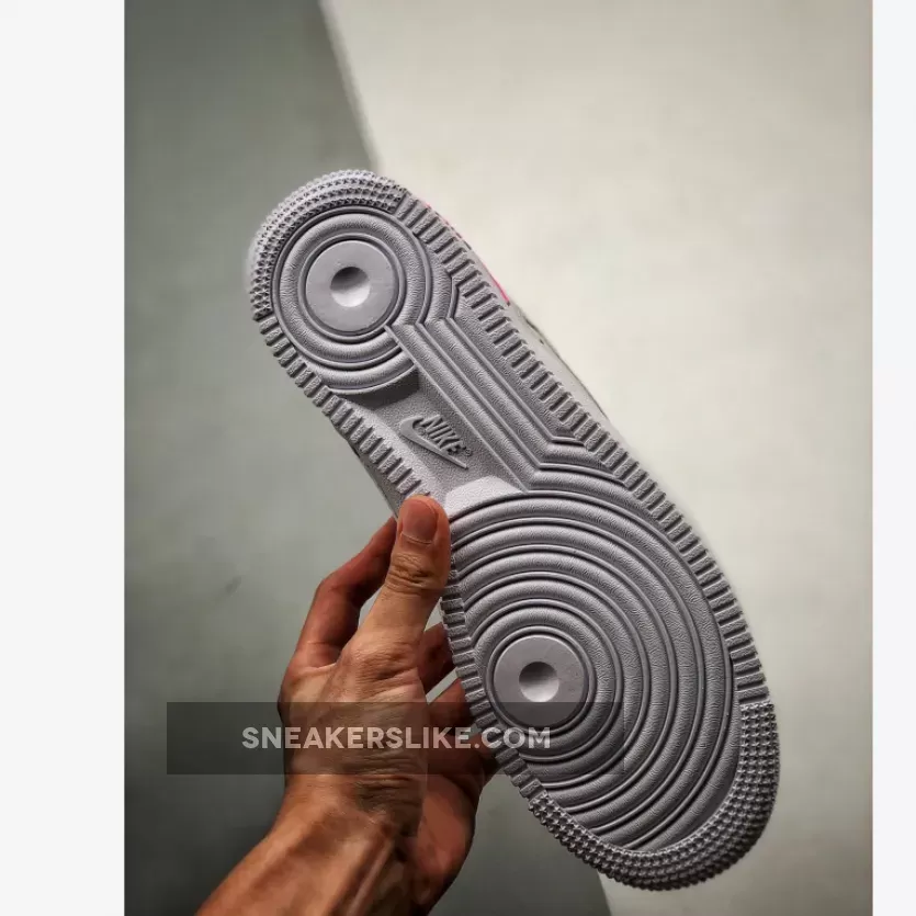 Smooth, light grey leather covers the upper of this grey and red Double Air Air Force 1, with the factory label that usually sits on the inside of the tongue repeatedly running down the centre of the lace unit. The perforation holes that usually appear scattered across the toebox have been replaced with a ‘Nike Air’ logo in bright pink. Light grey Swooshes sit stretched out across both side walls, blending in against the neutral coloured upper.