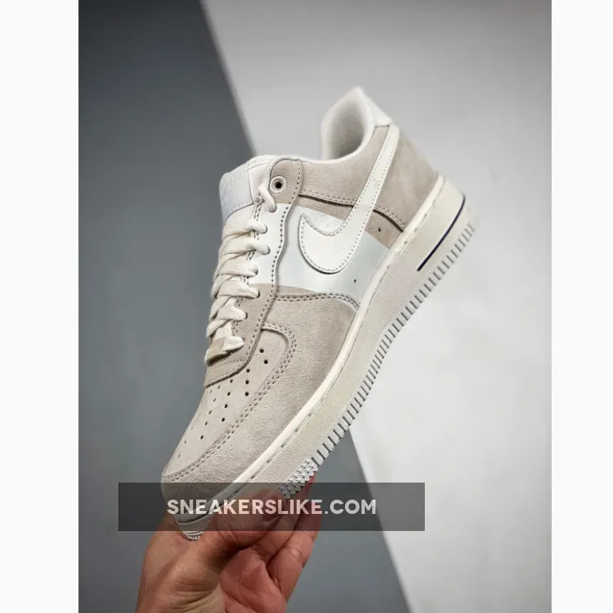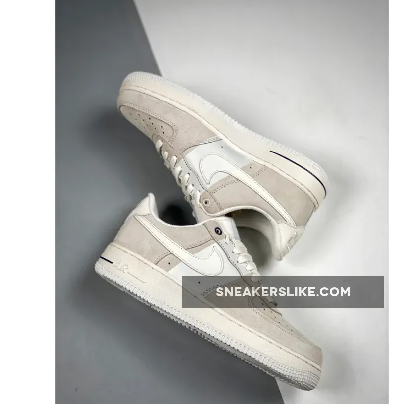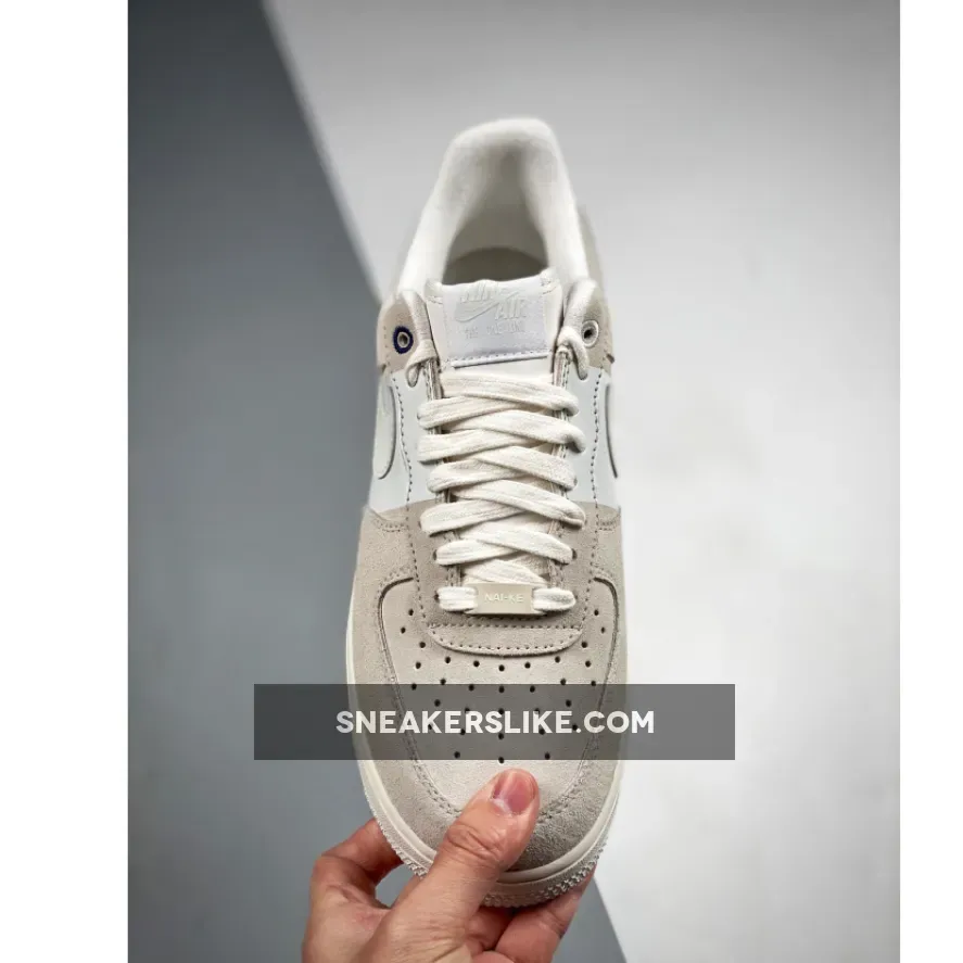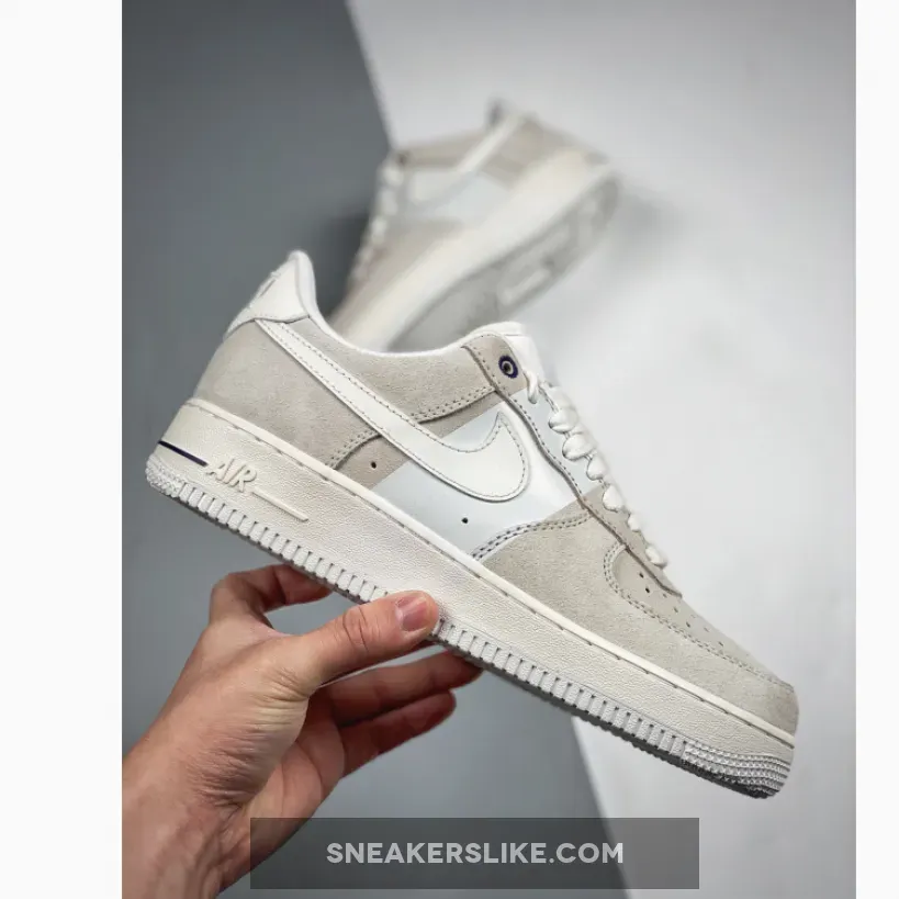Light grey suede completely wraps the vamp and the heel panel section leaving the mid-panel completely white. A white leather Swoosh on both the medial and lateral sides sweeps across the white mid-panel and continues on to the heel section. The white heel tab has the Chinese characters of “NAI-KE” embroidered in white.