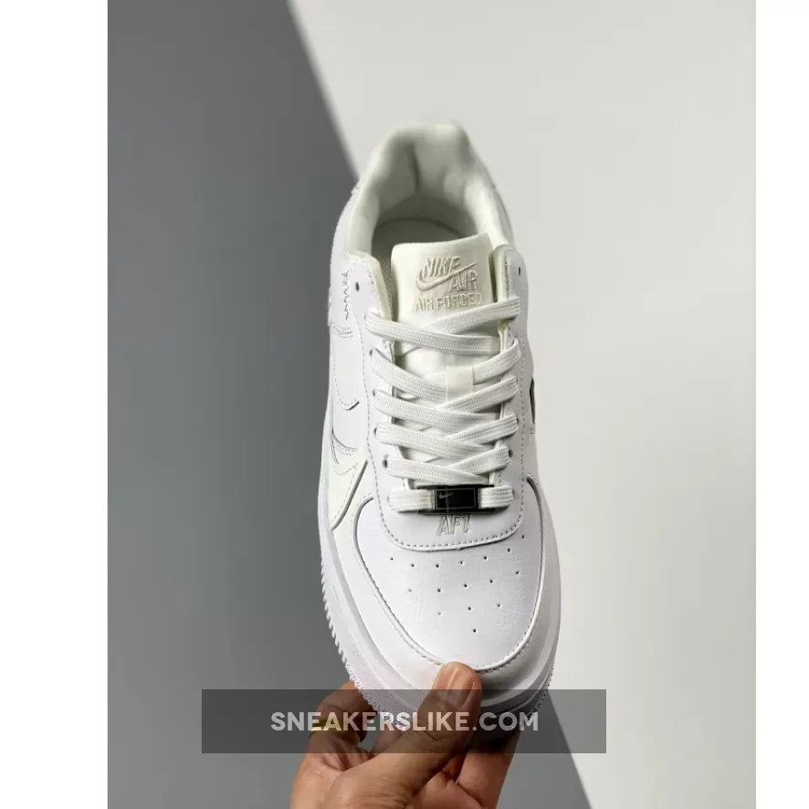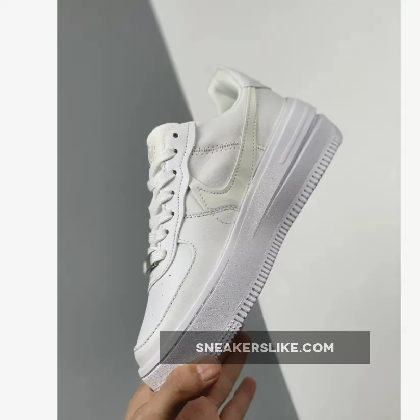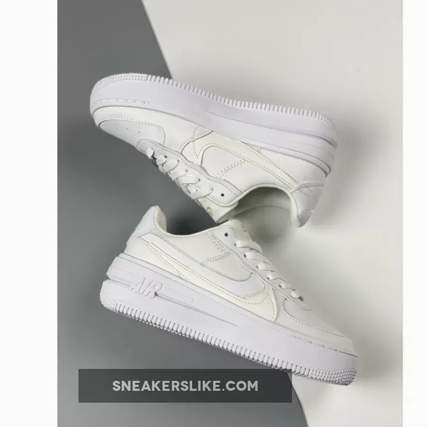 An angelic new Nike Air Force 1 PLT.AF.ORM is coming your way. Get ready for the Nike Air Force 1 PLT.ORM Triple White. This AF1 features a “White/ Summit White/ White” colour palette. The upper is covered with white pebbled and smooth leather from heel to toe. If you look closely at the lateral side of the shoe, you’ll notice a subtle double Swoosh. The bottom Swoosh is the more traditional sewn-on smooth leather Swoosh in Summit White. On top of it is a clever cutout Swoosh. On the medial side, the Swoosh is layered over by the mudguard and the heel tab. Like a cherry on top, a silver deubré with a micro mini Swoosh graces the laces. Snag the Nike Air Force 1 PLT.