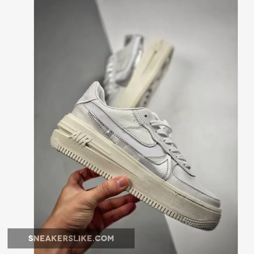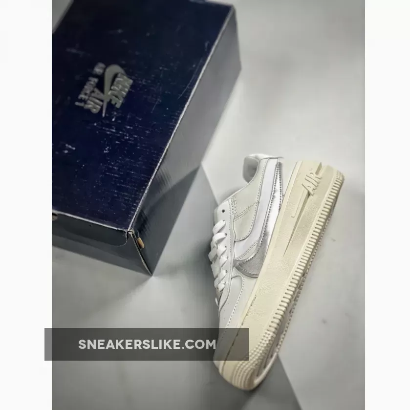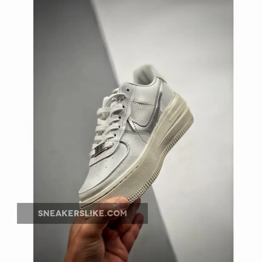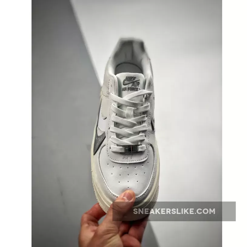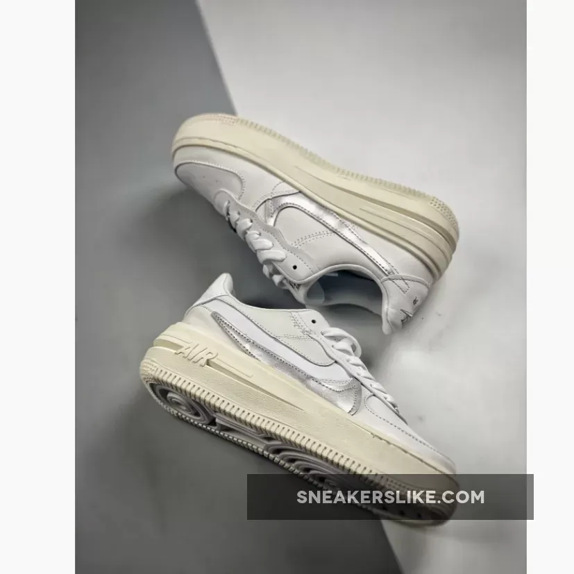 The Nike Air Force 1 literally reaches new heights with its towering platform line. One of its latest variants is an all-white ensemble with a metallic touch. Introducing the Nike Air Force 1 PLT.AF.ORM White Grey. This AF1 looks like it has an all-white smooth and pebbled leather upper. The only exception is the bright flash of metallic silver on the Swooshes on both sides of the shoe. Similar to other PLT.ORM iterations, another subtle Swoosh can be found right above the silver Swoosh, a cutout revealing smooth leather beneath. Silver grey repeats on the embroidered Nike Air Branding on both the tongue and the heel tab. A metallic silver lace deubré adorns the laces. Grab the Nike Air Force 1 PLT.