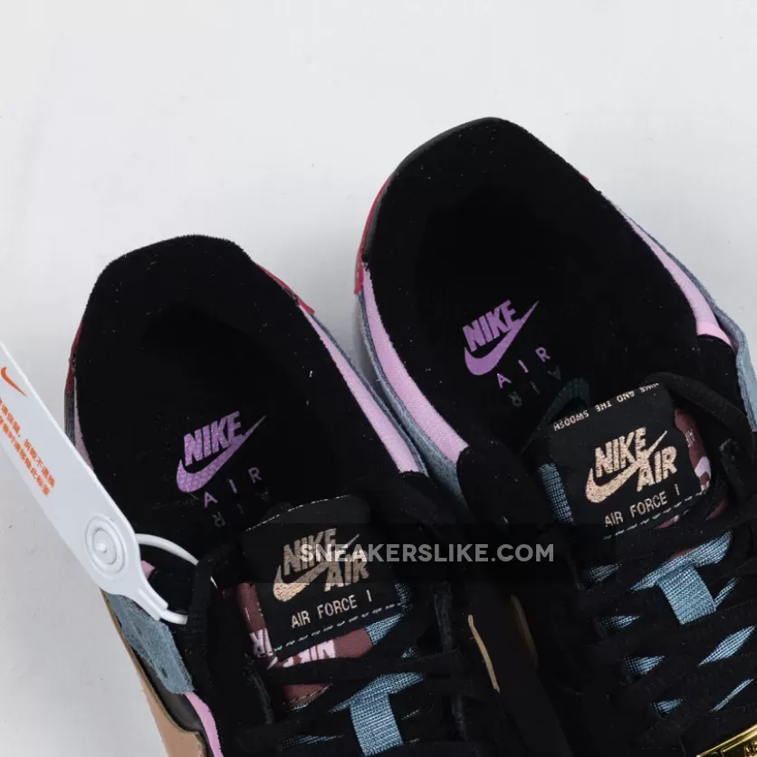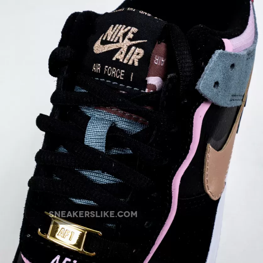 A colourblocked, multitextured upper is crafted from a leather base with suede and metallic overlays. Black laces down the throat contrast with the dusty-blue tongue and golden lacelock leading down to the delicate AF1 logo embroidered at the toe box. Baby pink velvet piping surrounds the eyelet area and the Swoosh arrives in a beige hue to tone down the darker colour palette. The retro Nike logo is embroidered in gold atop the metallic red heel.